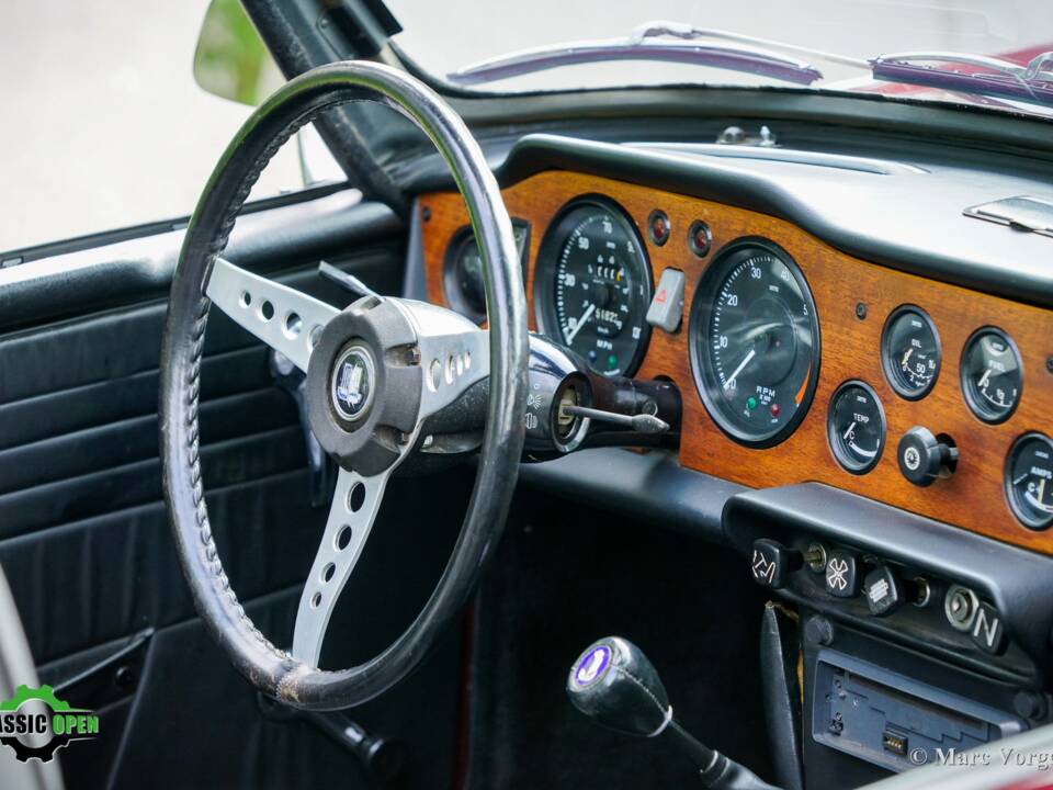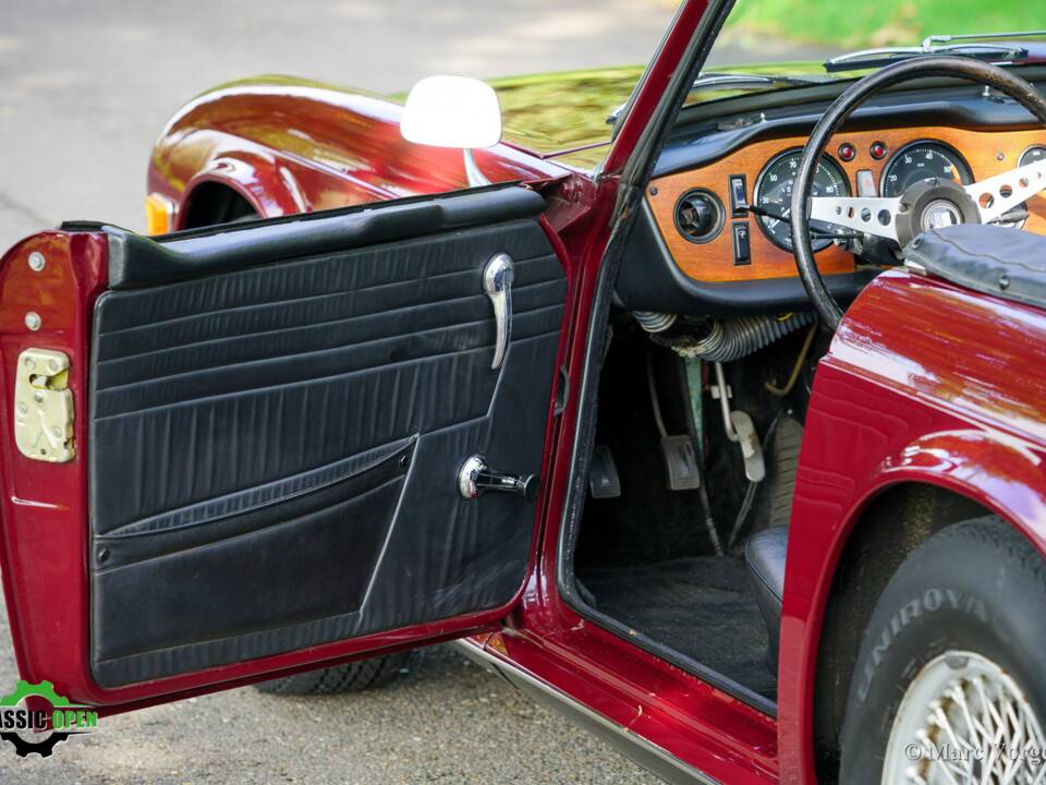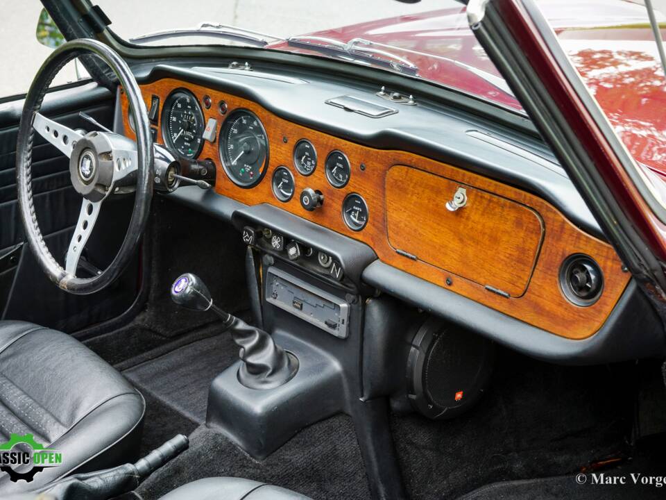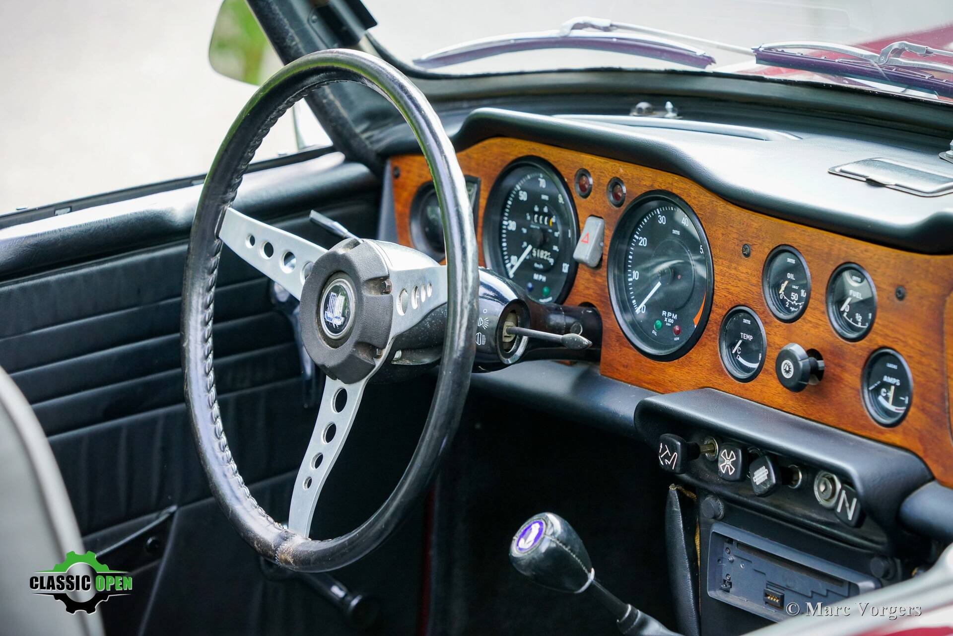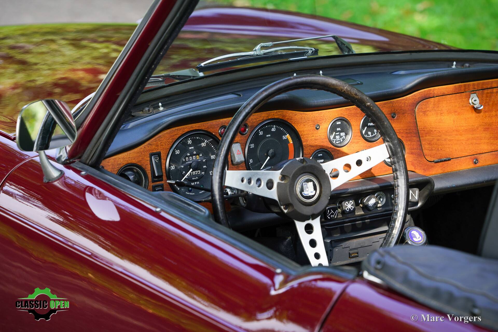 This Triumph TR6 is a seldom seen early version still sporting unique details like the safety seats with the high headrests and the unique 3-spoke steering wheel with holes in the spokes.