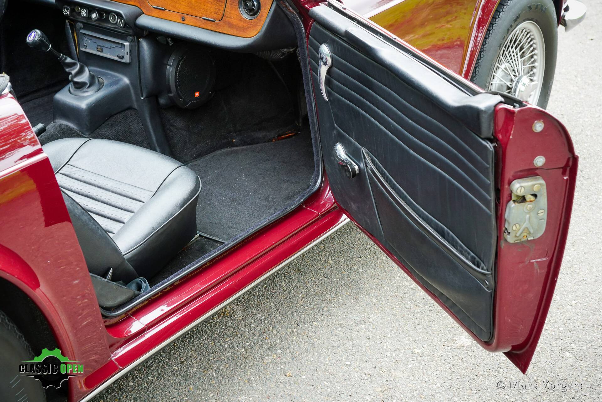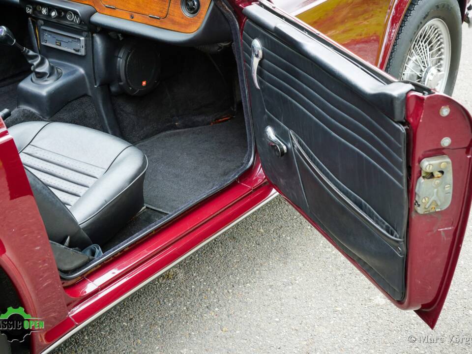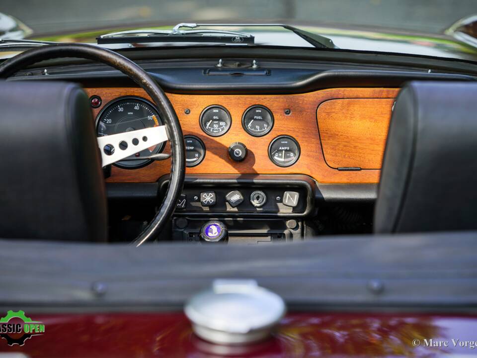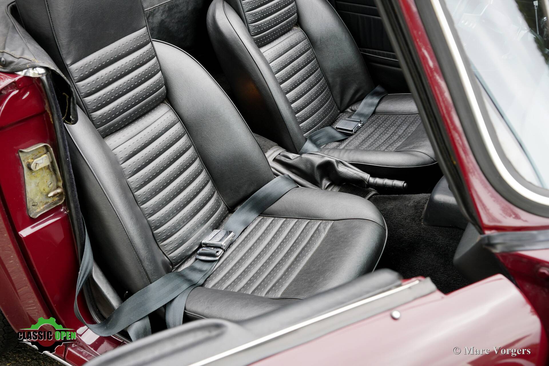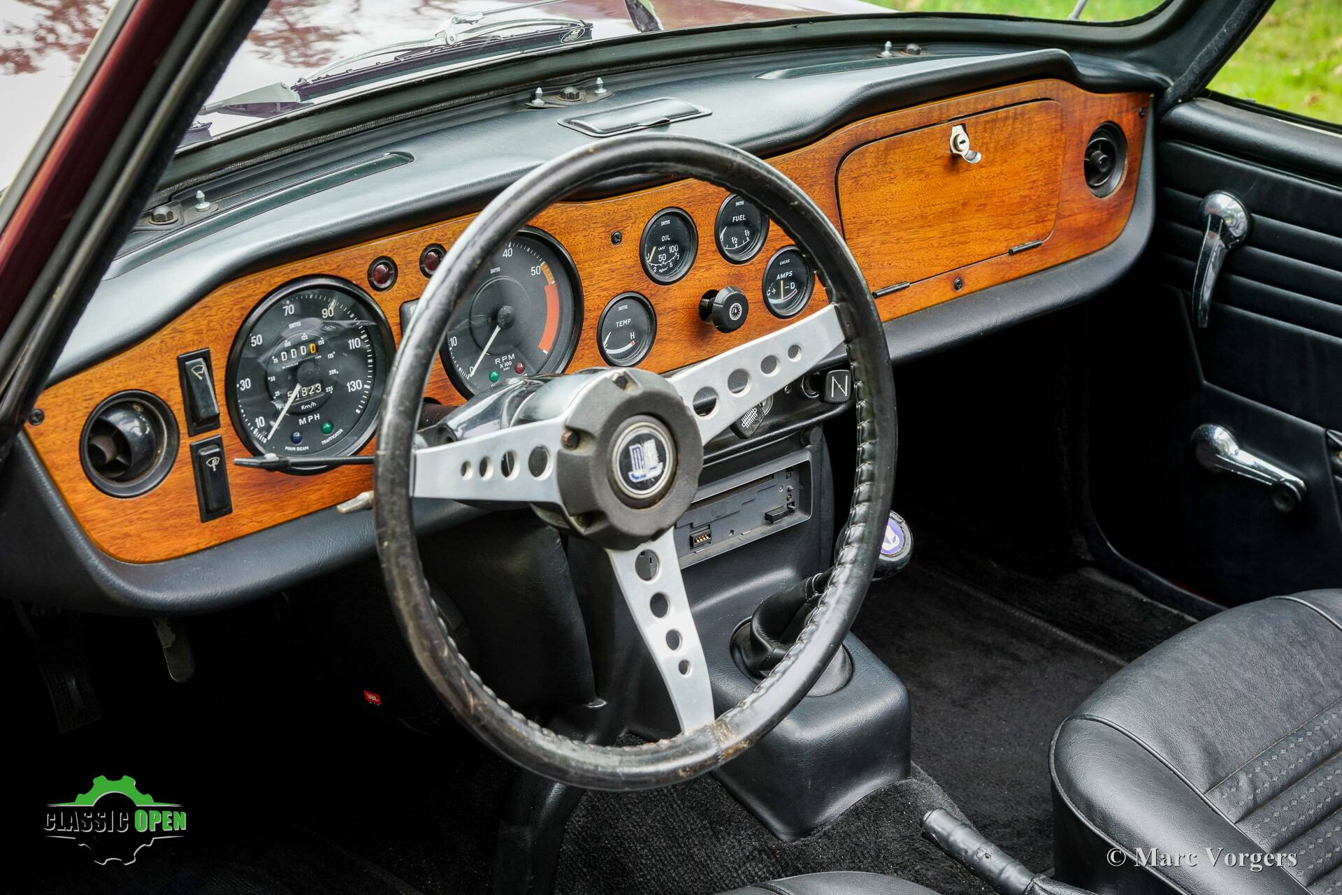 This Triumph TR6 is a seldom seen early version still sporting unique details like the safety seats with the high headrests and the unique 3-spoke steering wheel with holes in the spokes.