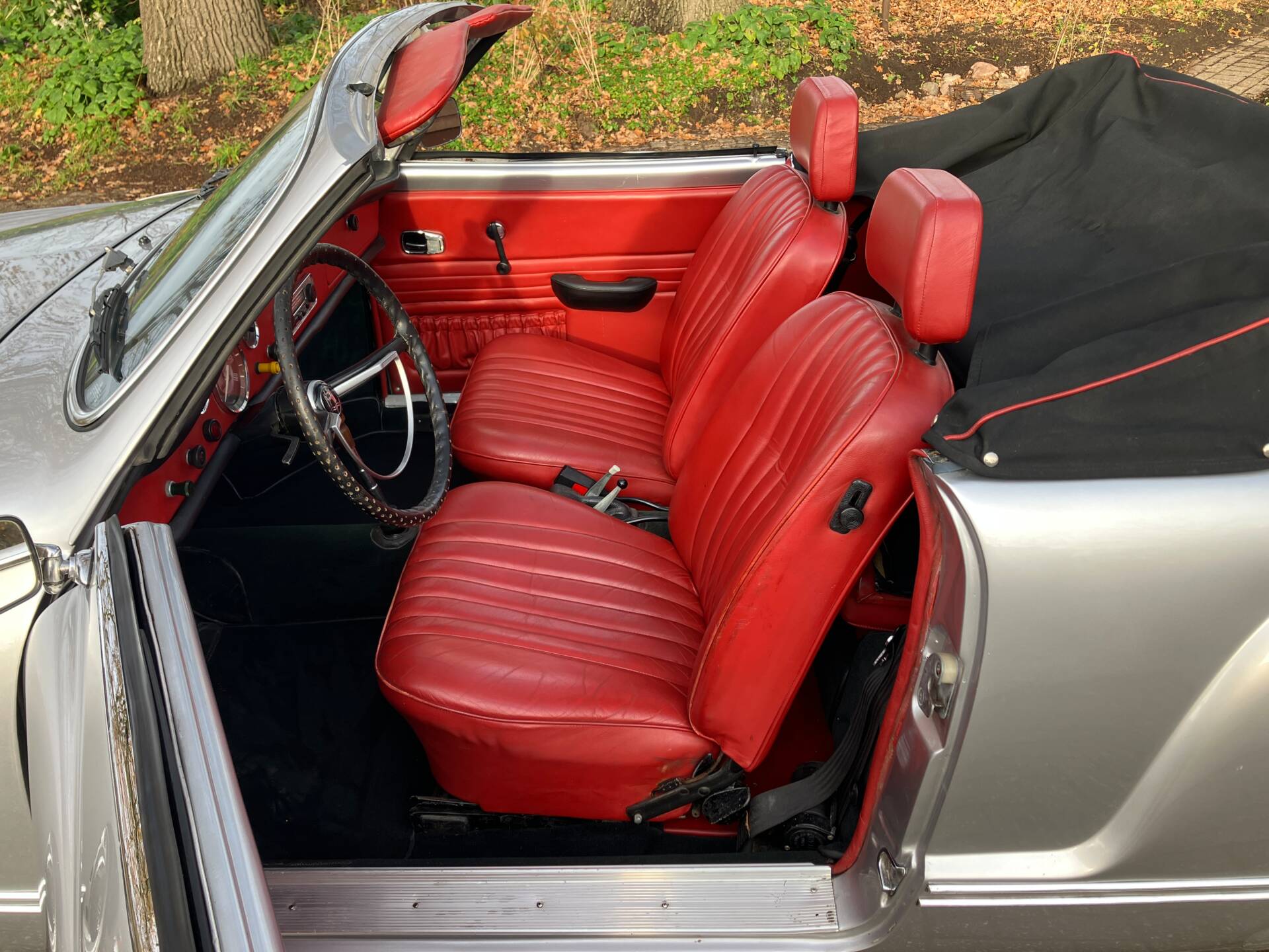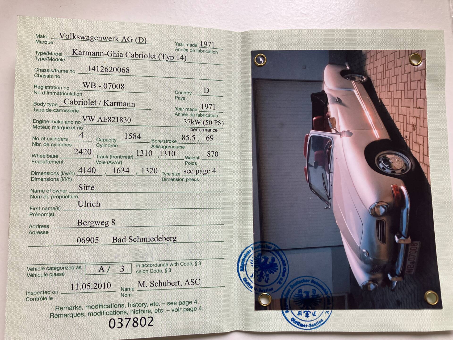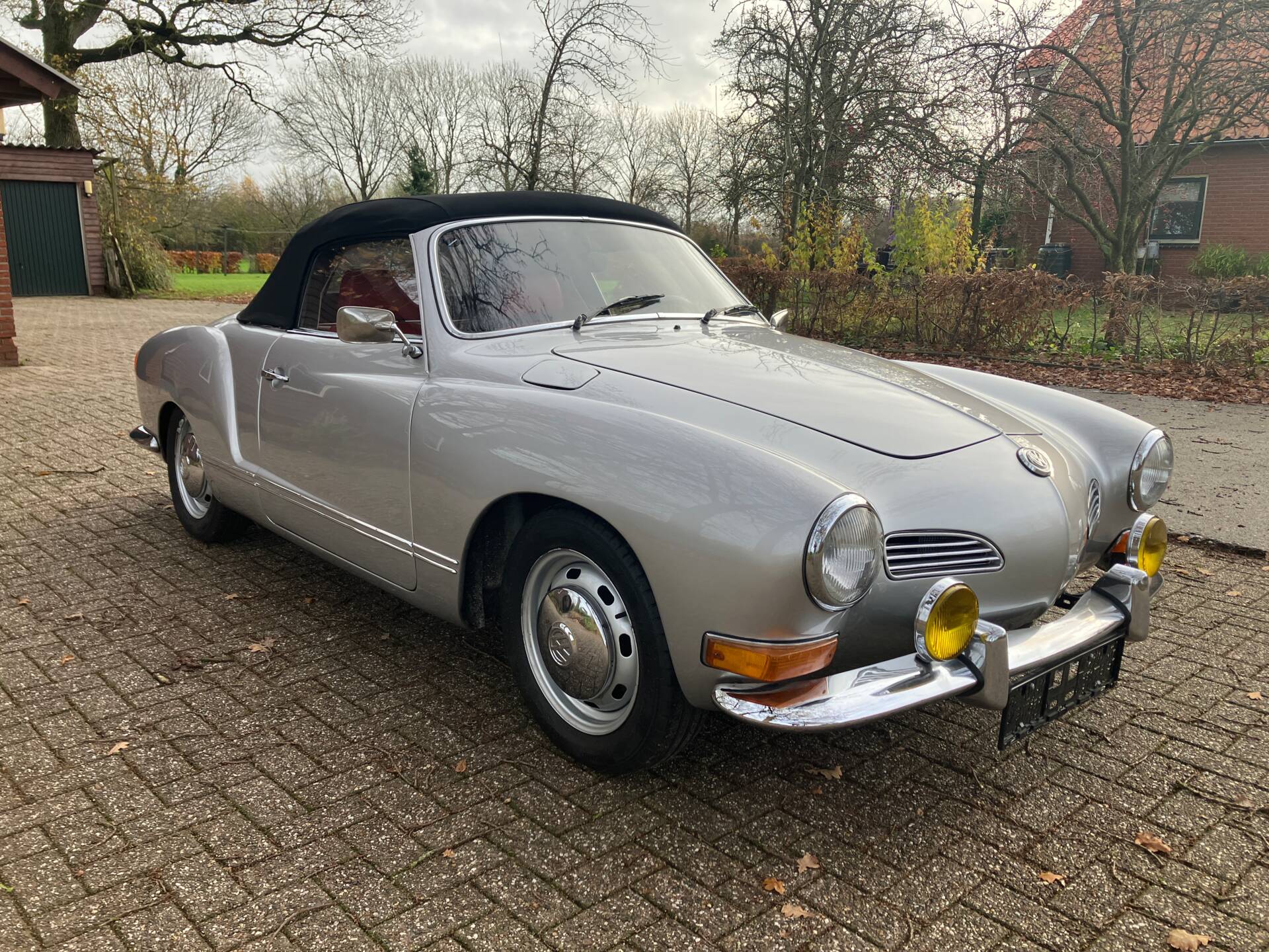 Zeer fraaie, roestvrije VW 1600 Karmann Ghia Cabrio uit 1971 met nog de mooie, sierlijke chromen bumpers. De auto werd body-off gerestaureerd waarvan een foto-reportage. De Karmann is uitgerust met de originele-, betrouwbare 1600 AE motor met 50 PK. die voldoende vermogen levert om met het huidige verkeer mee te komen. De zilvergrijze kleur in combinatie met het smetteloze rode interieur en de nieuwe stoffen cabriokap geven de auto een prachtige, klassieke uitstraling. De Karmann is op afspraak te bezichtigen in Mariënvelde.