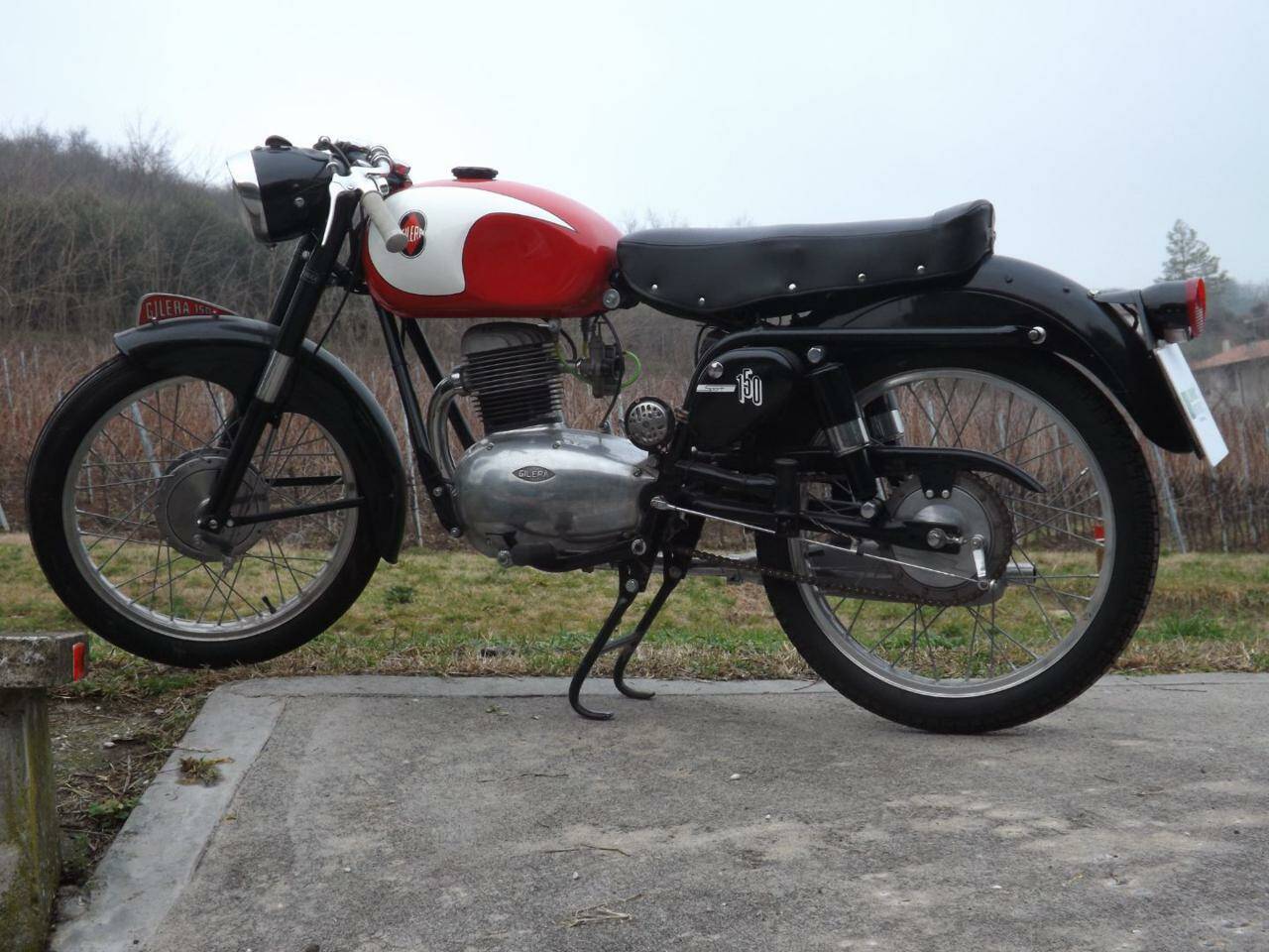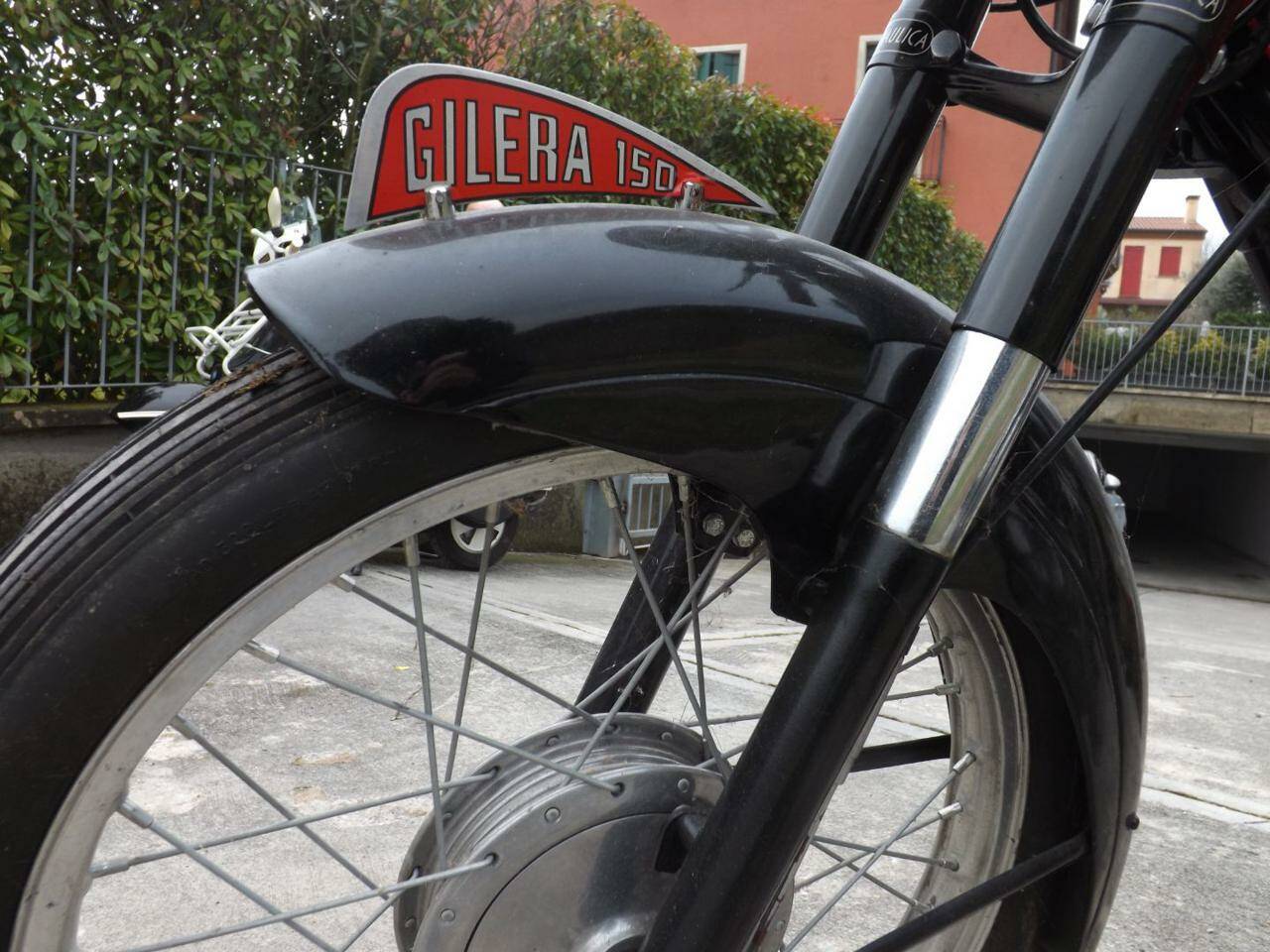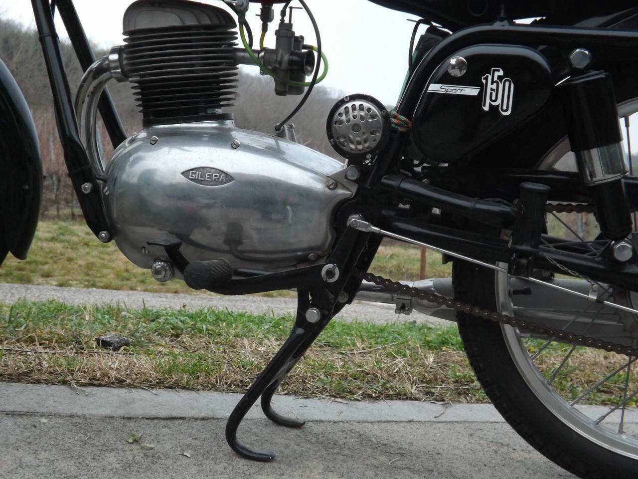 La Gilera 150 Sport del 1955 è una moto sportiva monocilindrica a 4 tempi, nota per il design rosso/nero, il manubrio basso e il serbatoio allungato da 13 litri. Eroga circa 7,5 CV, consentendo una velocità massima di circa 90-100 km/h. Dispone di cambio a 4 marce, freni a tamburo da 150 mm e sospensioni telescopiche