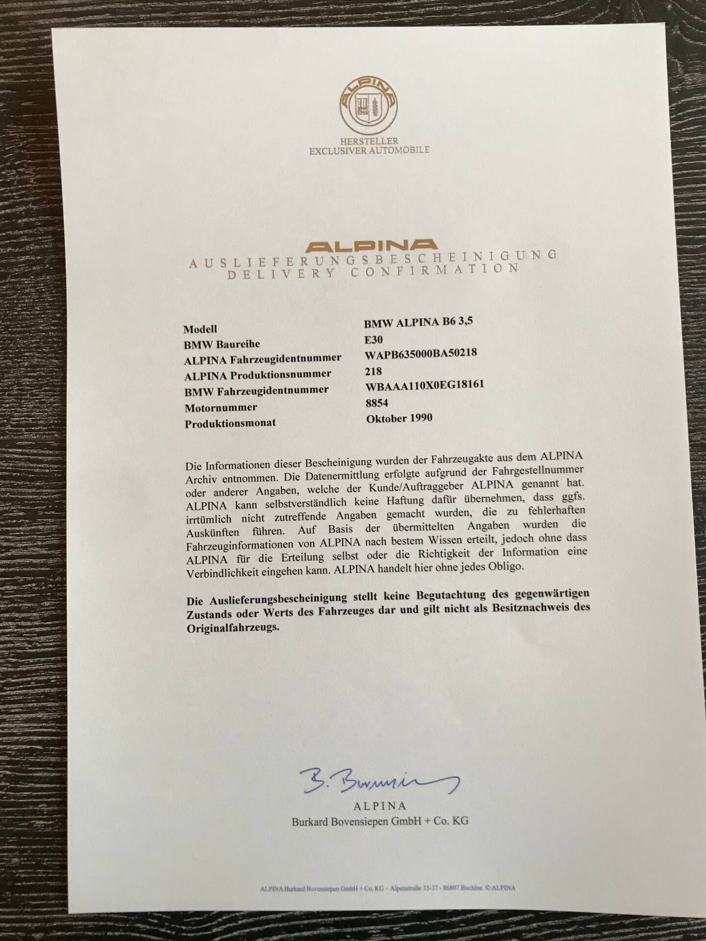 Seltener B6 mit 3.5 Liter Motor. Von Alpina u.a. mit Mahle Kolben, schärferen Nockenwellen, Getrag Sportgetriebe und verstellbarem Sportfahrwerk ausgestattet. Nr 218 von insgesamt nur 219 gebauten Alpina B6 3.5. EZ Mai 1991. Das bayrische MuscleCar auf e30 Basis. Absolut originalgetreu mit Alpina Auslieferungsbescheinigung. Original Rechnung vorhanden. Belegbare Matching Numbers. Bester technischer und optischer Zustand (kein Rost, kein Ölverlust etc.). Neue Veteranenprüfung in Schweiz von Sept. 2024.