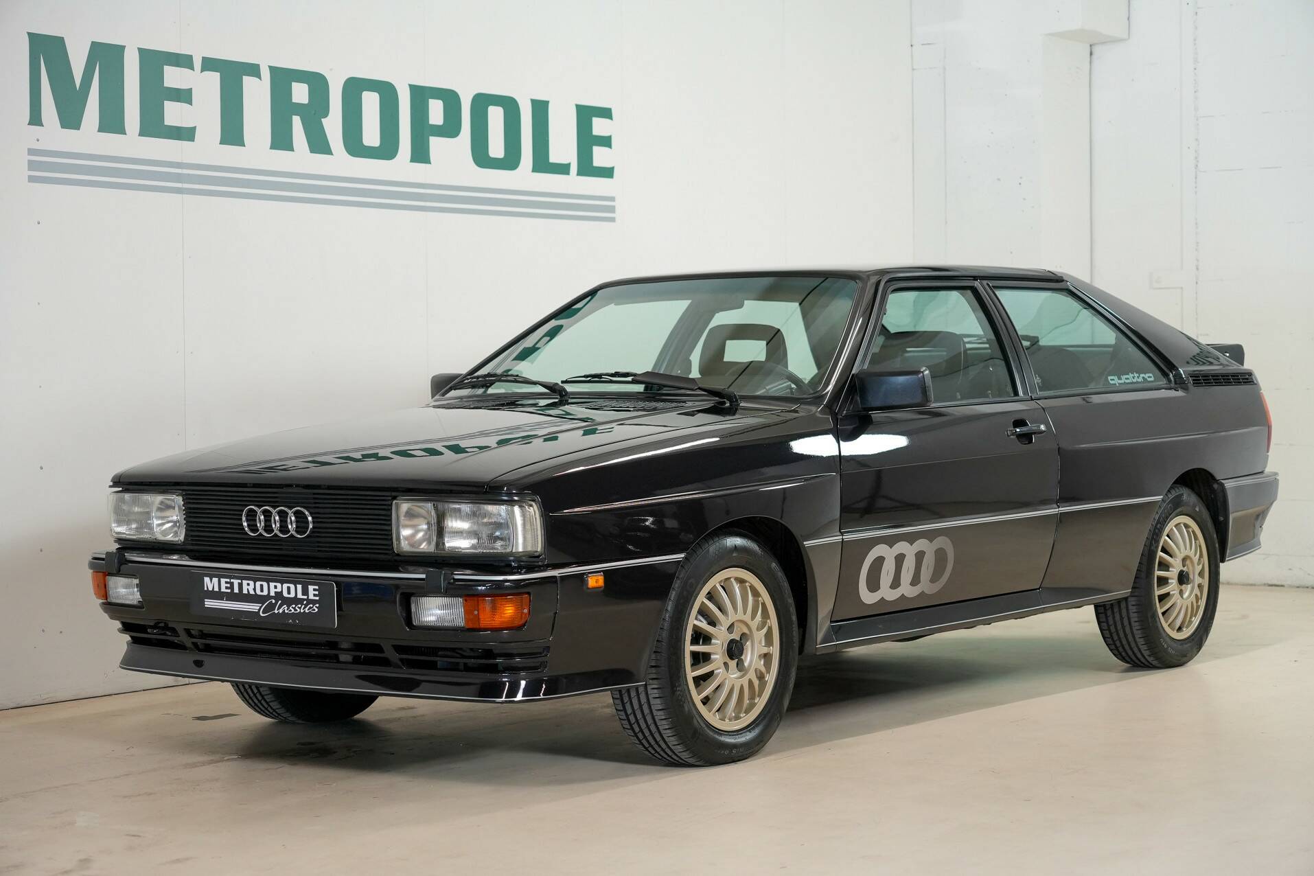 Der hier gezeigte quattro stammt aus dem Jahr 1983. Er ist schwarz mit einer dunkelgrauen Innenausstattung und grünen Zierelementen. Der Wagen hat nur 117.000 km auf dem Tacho und fährt sich wie neu. Sein Klang ist einfach grandios – erzeugt vom 200 PS starken Fünfzylinder-Turbomotor! Für seine Zeit ein extrem leistungsstarker Motor. Er gilt als Ikone der Automobilwelt, setzte Maßstäbe für Audi und inspirierte viele andere Hersteller.