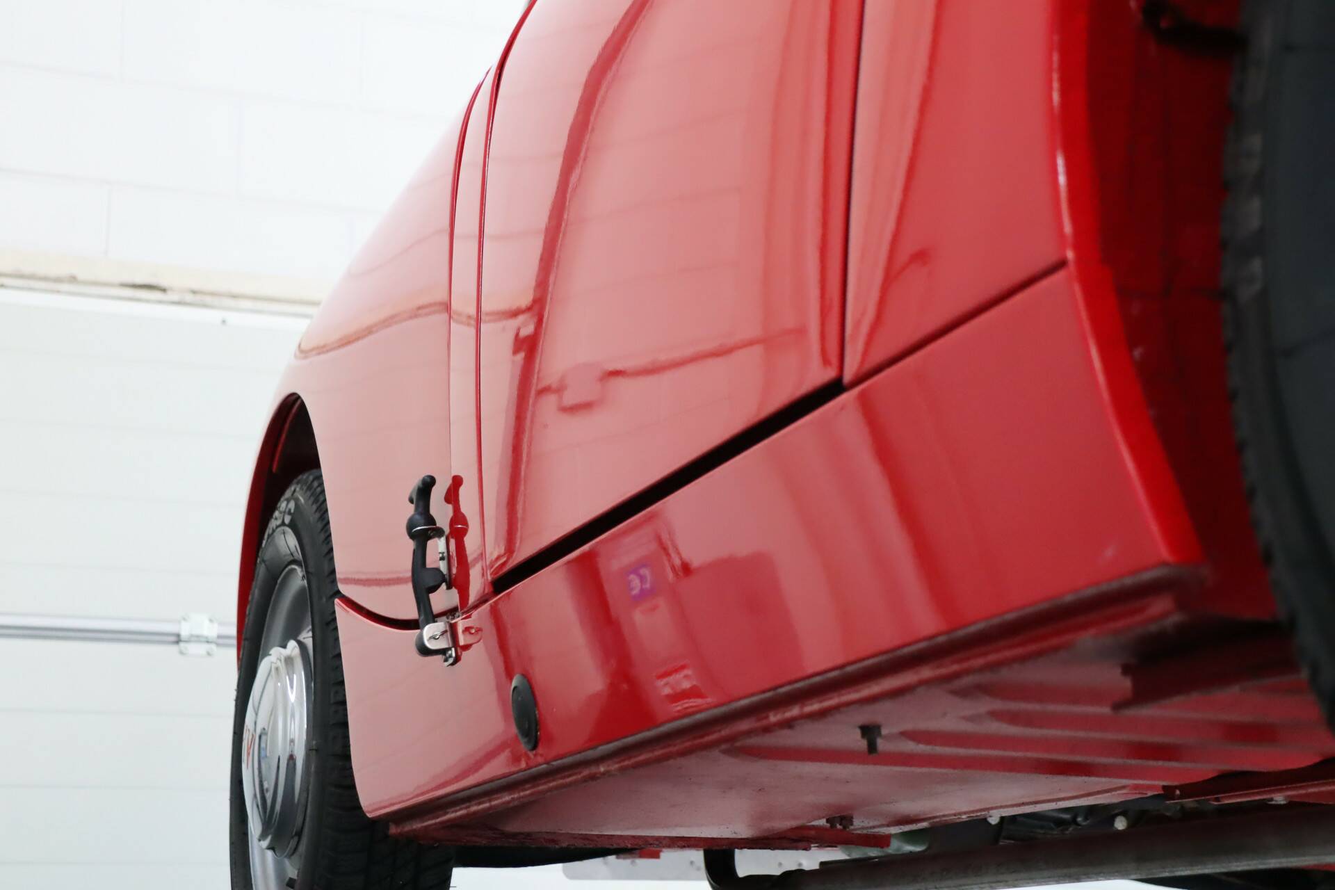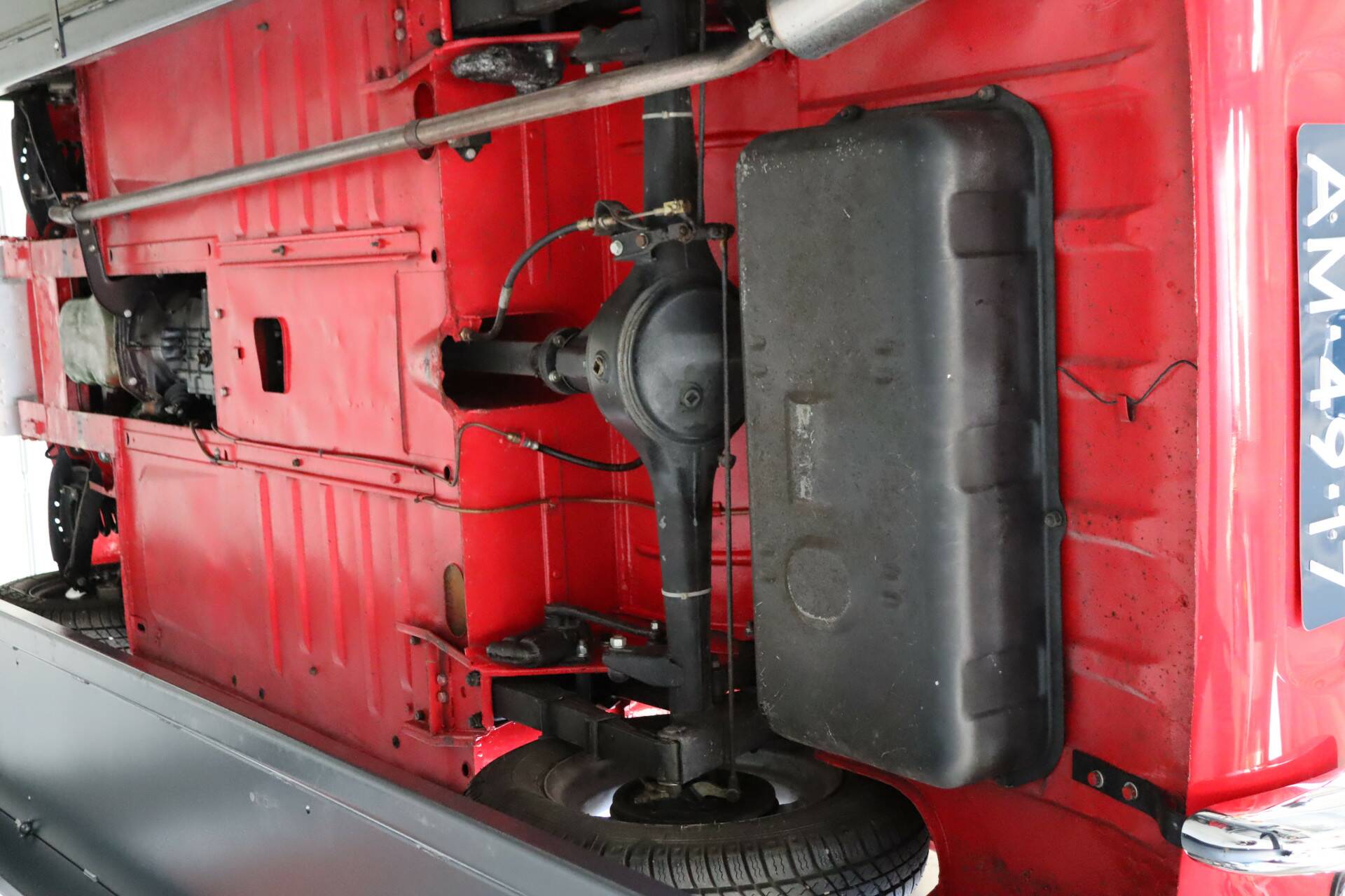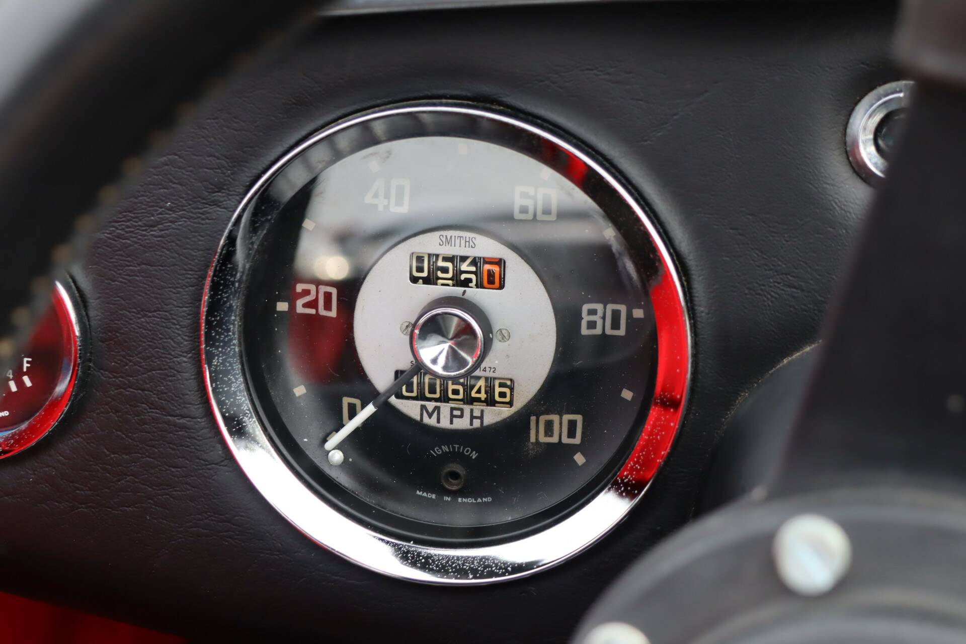 Die Innenausstattung ist in schwarzem Kunstleder mit verstellbaren Sitzen gehalten. Auch diese Innenausstattung ist in einem gepflegten Zustand, ohne Beschädigungen und mit nur minimalen Gebrauchsspuren. Das Auto ist mit schönen und praktischen Accessoires wie einem dicken Moto-Lita-Lenkrad und einem Hauptstromschalter ausgestattet. Außerdem sind ein Ersatzrad und eine Persenning vorhanden. Auch Rahmen für die Seitenfenster sind vorhanden.