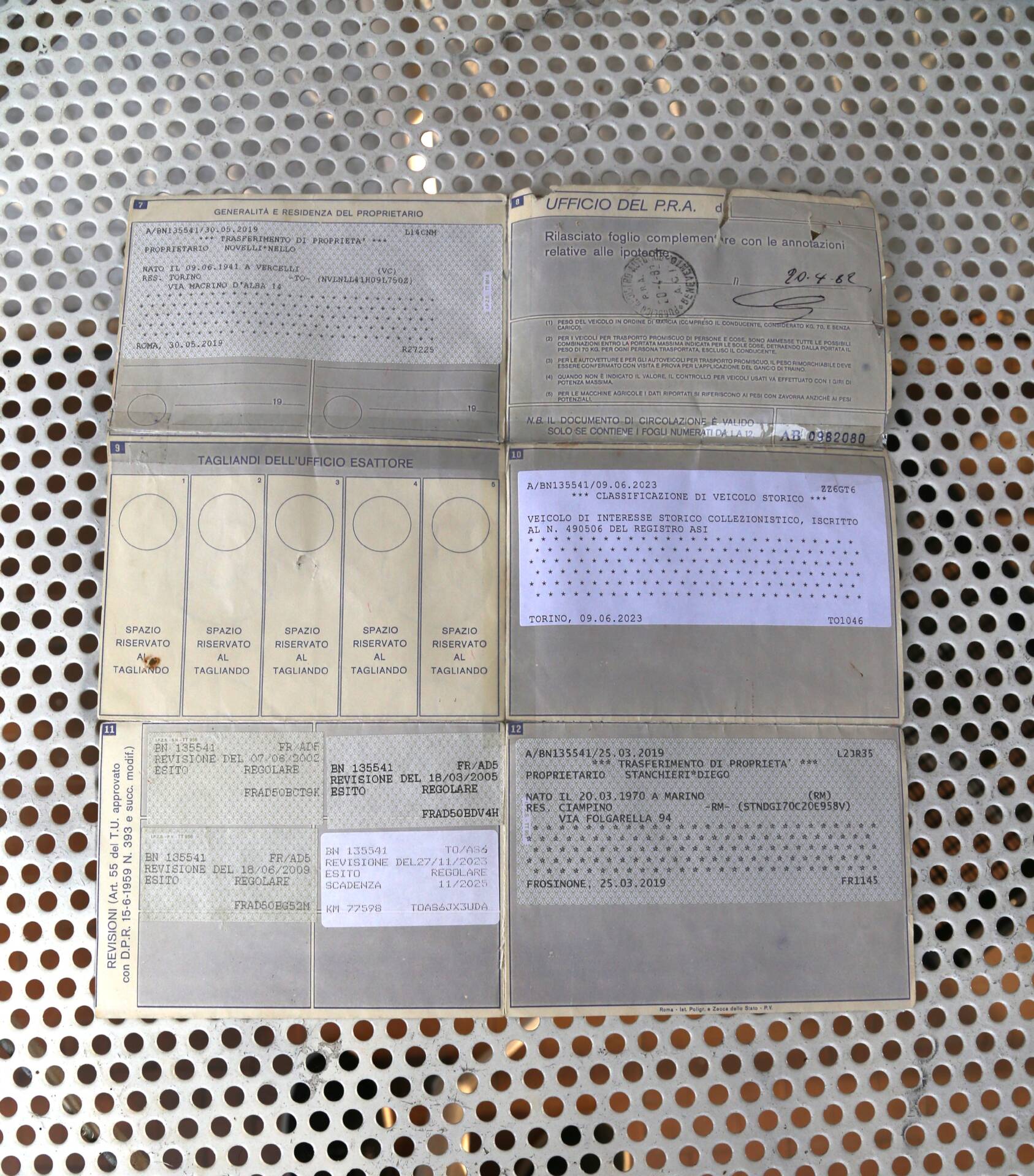 Belegte Informationen zur Erstzulassung, zur Anzahl der Vorbesitzer oder zur Historie dieses konkreten Exemplars liegen derzeit nicht vor. Laut Anbieter wurden seit Abschluss der Restaurierung lediglich rund 200 km zurückgelegt. Das Fahrzeug ist mit einem italienischen CRS-ASI-Zertifikat ausgestattet; die vollständige Dokumentation wird laut Aussage auf Wunsch zur Verfügung gestellt.