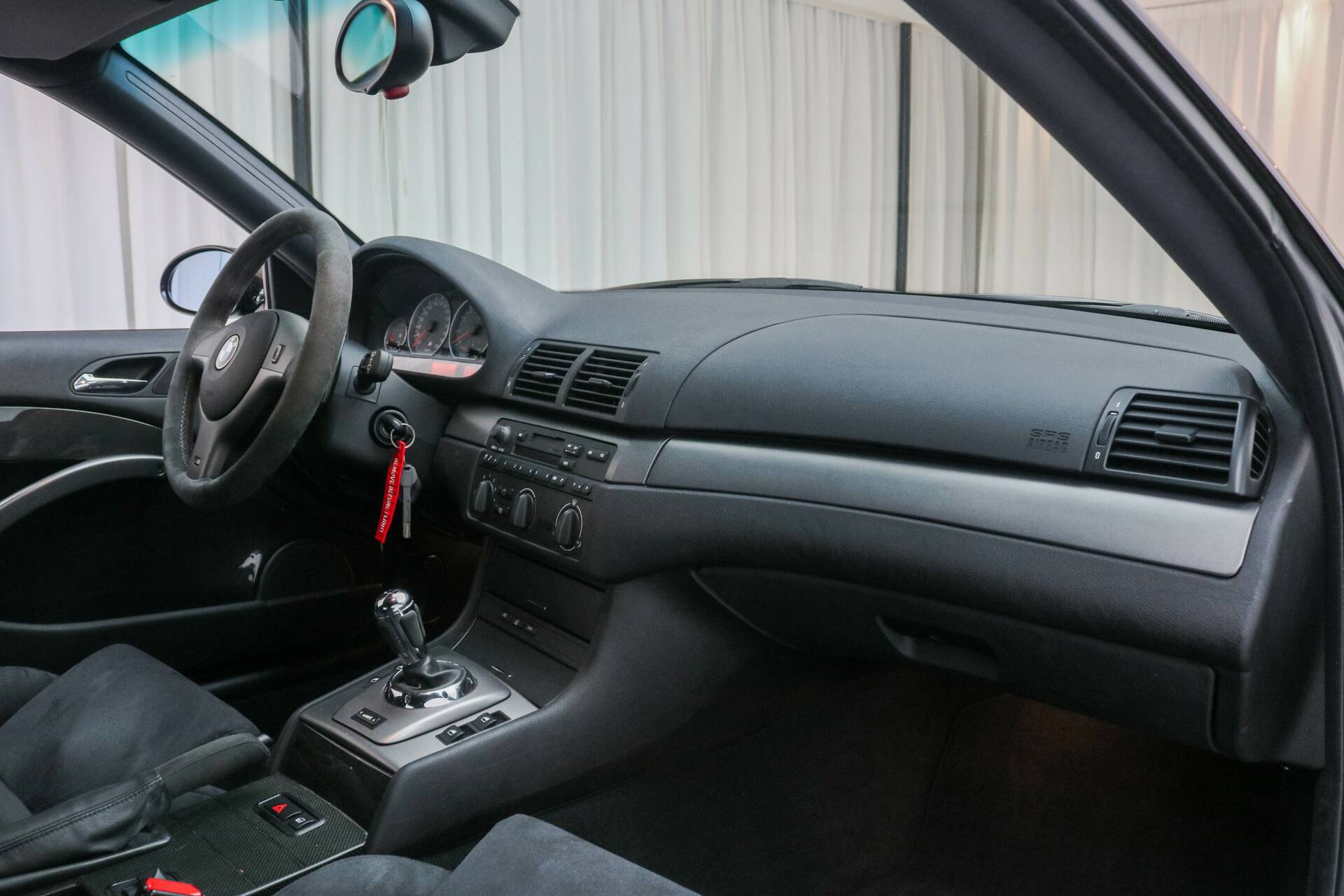 Das Interieur entspricht dem Leichtbaukonzept des CSL: komplett in schwarzem Alcantara, Schalensitze, Leichtbau-Rücksitzbank, Carbon-Türverkleidungen und Carbon-Mittelkonsole. Das originale Alcantara-Sportlenkrad mit integrierten Schaltwippen befindet sich in hervorragendem Zustand. Dieses Fahrzeug ist mit dem optionalen originalen Radio ausgestattet, bewusst ohne Klimaanlage – pur und funktional, wie es der CSL vorgesehen ist.