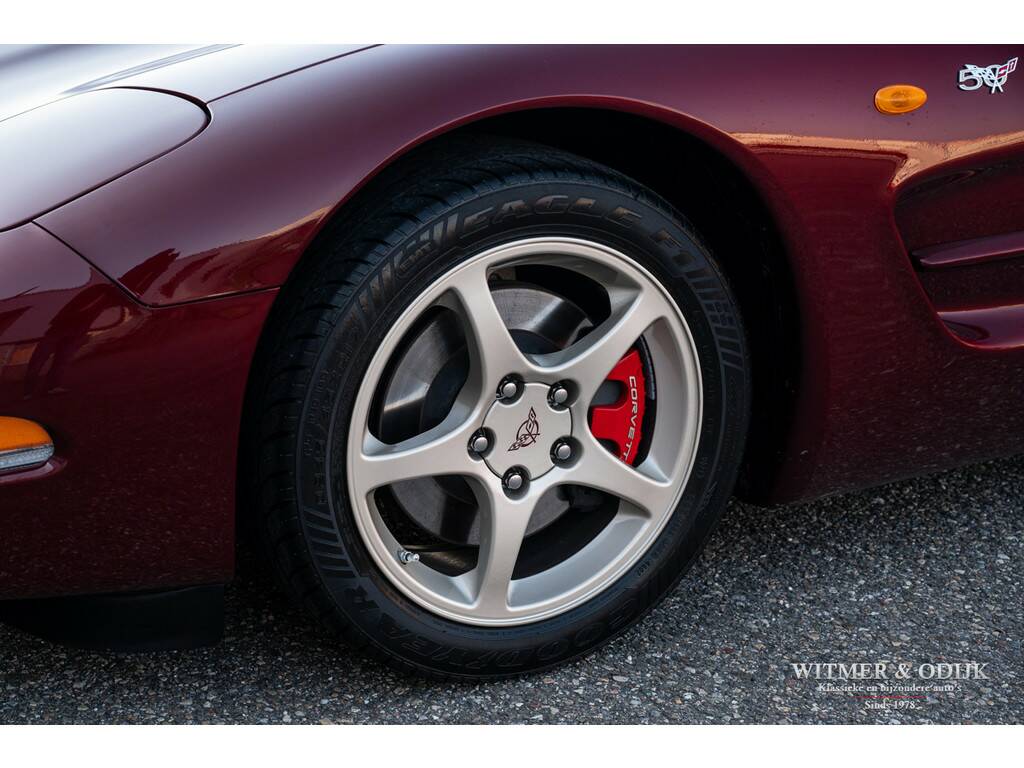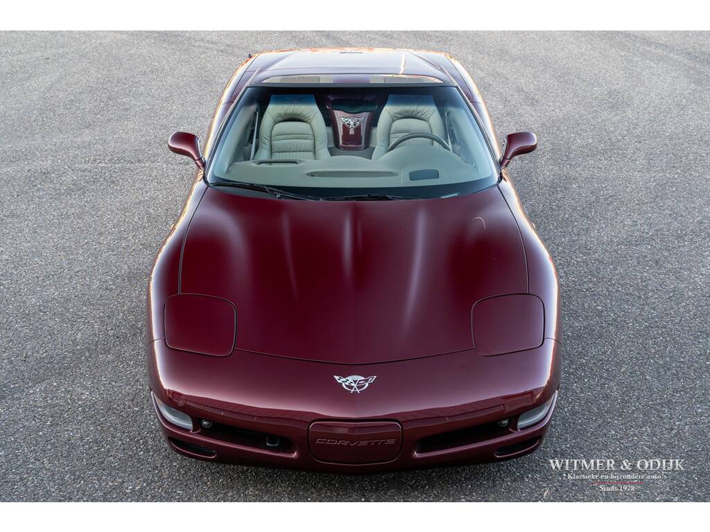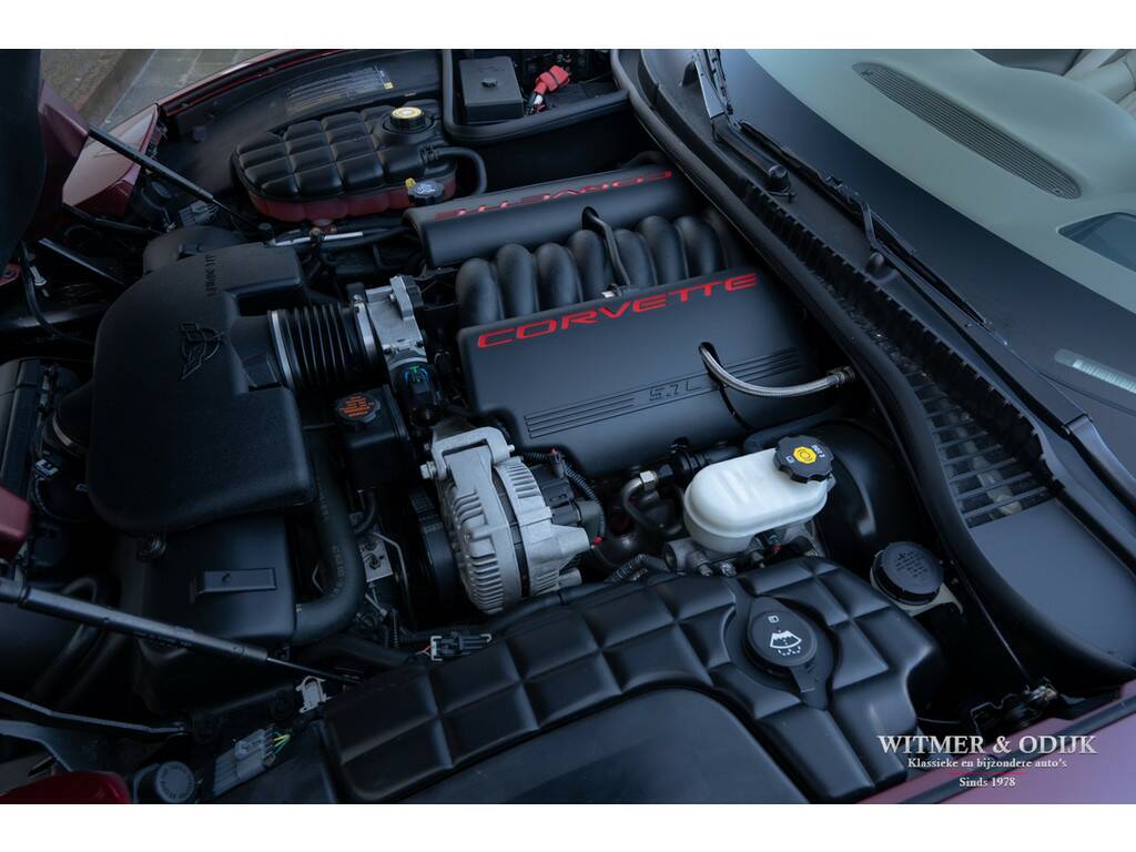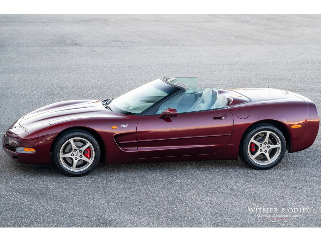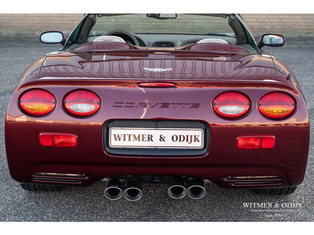 Bij het vijftig jarig bestaan van het merk Corvette in 2003 presenteerde General Motors de 50th Anniversary versie. Deze C5 werd geleverd in een speciaal voor de gelegenheid gemengde kleur die de veelzeggende naam Anniversary Red meekreeg. Het interieur was alleen leverbaar in een lichte tint die men Shale noemde. Verder werd de auto voorzien van 17 en 18 inch lichtmetalen velgen in Champagne metallic. Onder al deze uiterlijke kenmerken huisde de traditionele 5,7 liter V8 die 350pk naar de achterwielen bracht. Om dit vermogen nog beter te beteugelen kreeg de Corvette op deze 50th Anniversary versie het nieuwe Magnetic Selective Ride Control mee, adaptieve schokdempers die zich automatisch instellen op het wegdek en rijgedrag. Met het, zeker voor die tijd, enorme vermogen van 350pk en 360Nm koppel een fijn hulpmiddel om de Corvette optimaal te benutten. Door het verplaatsen van de versnellingsbak naar de achteras, voor het eerst op de C5 toegepast, verbeterde overigens het weggedrag al fors. De C5 werd een groot succes voor Corvette, de 50th Annivesary uitvoering werd in 2003 gelimiteerd op 11.632 stuks. Op een enkel exemplaar in een museum na is dit waarschijnlijk de C5 convertible met de laagste kilometerstand wereldwijd. Met slechts 1.815 kilometers op de teller is deze Corvette uiteraard als nieuw. Het betreft een origineel Europees uitgeleverde auto met de sportieve handbak met zes versnellingen. Alle originele boekjes en sleutels zijn uiteraard aanwezig. Goede wijn behoeft geen krans zegt men wel, deze Corvette C5 laat zich eenvoudig samenvattend beschrijven, als nieuw! Deze 50th Anniversary C5 is o.a. uitgerust met dual zone climat control, head-up display, cruise control, Delco audioinstallatie met Bose luidsprekers en subwoofer, boordcomputer, elektrische stoelverstelling, Magnetic Selective Ride Control, traction control, ABS, etc.