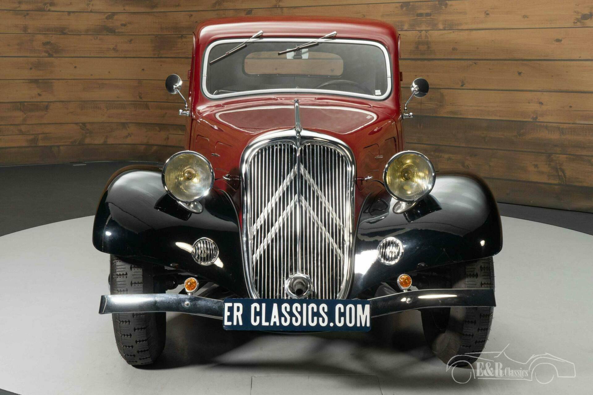 The exterior of this Traction Avant is a feast for the eyes. The deep red paint combined with black mudguards and wheels provides an elegant appearance. This model has some rare features, such as headlamp supports without adjustment holes, a three-piece spare wheel cover and bumper supports with only one bolt instead of two. The authentic petrol tank with two filler caps and the number plate with lighting ("Plaque de Police") underline the original details. Inside, the interior exudes pure class, with two dashboard compartments, an original central instrumentation and a specially made interior mirror. In addition, the expansion compass for the window is still original, a detail that is rarely found. The high-quality upholstery, woven according to the traditional French method, ensures a perfect match with the exterior.