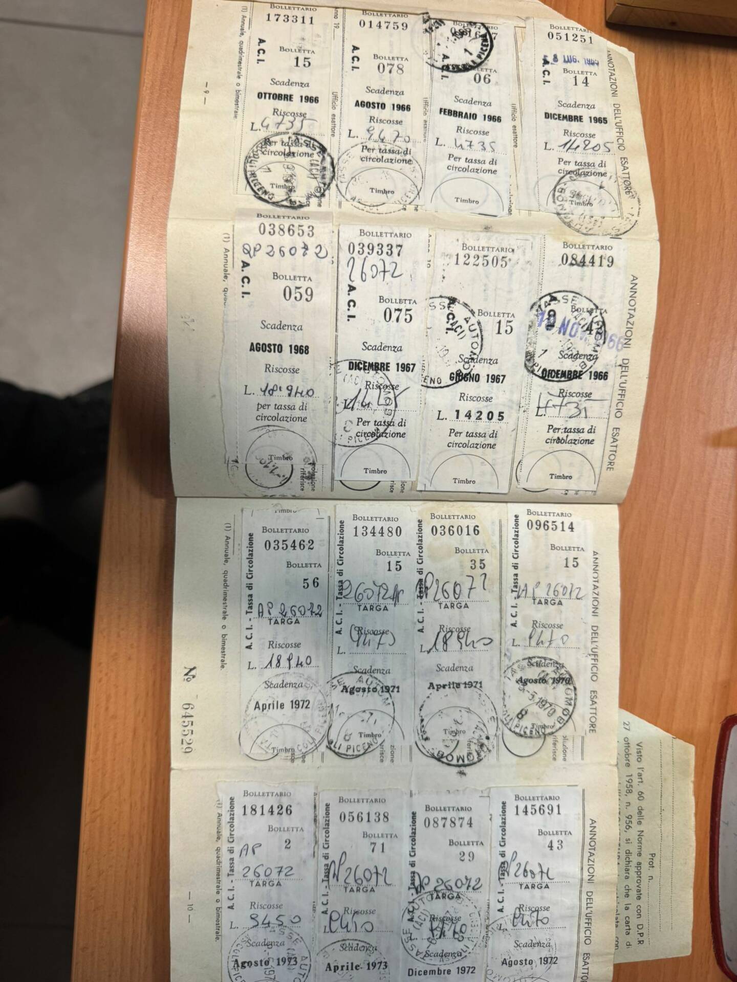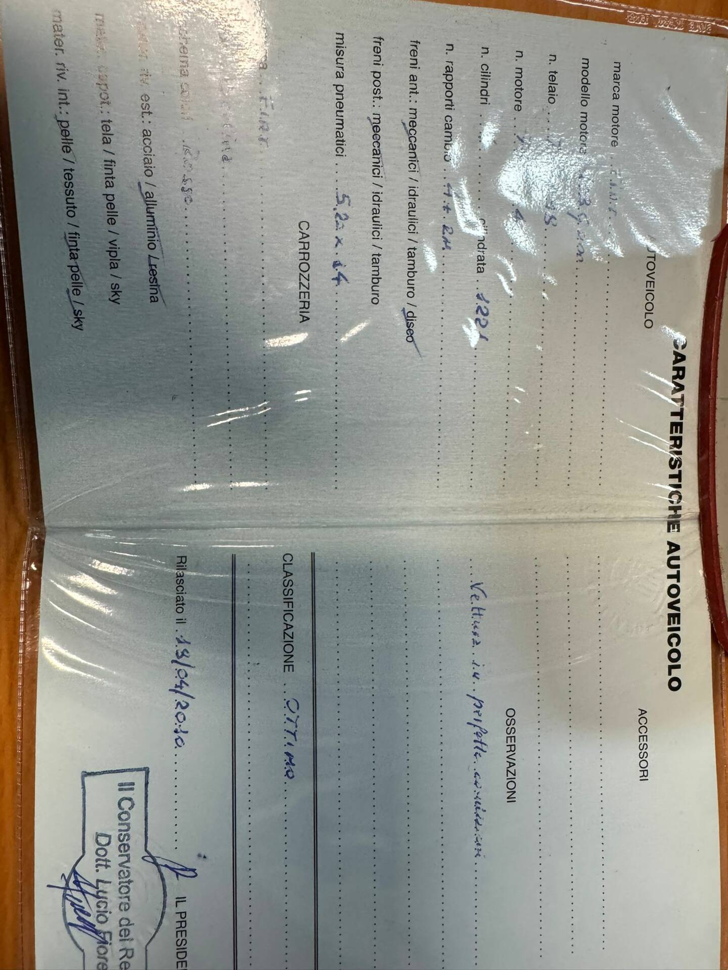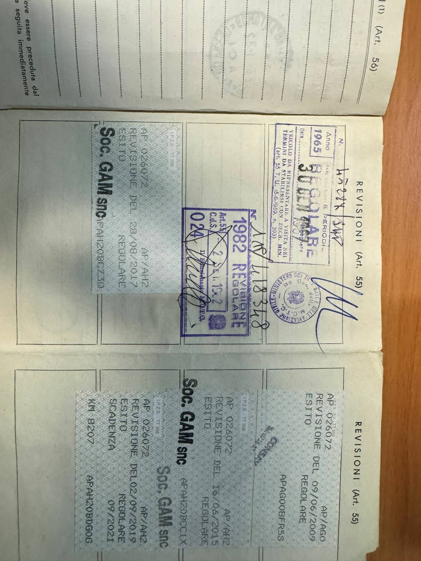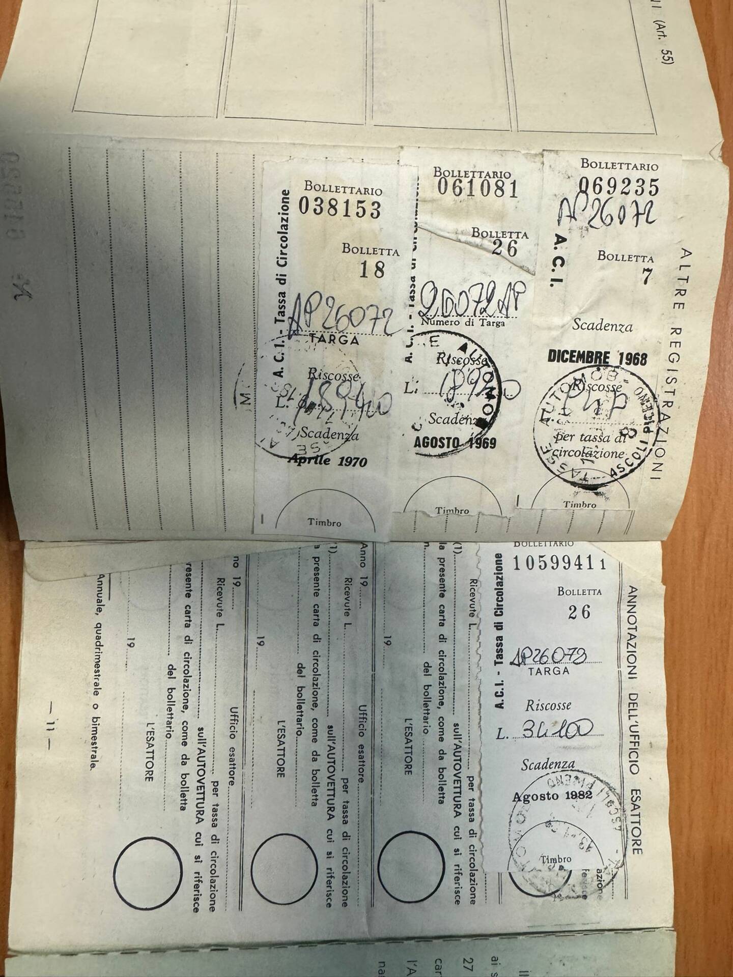 Besonders hervorzuheben ist die Zertifizierung als Oldtimer durch Fiat, die die Authentizität dieses Granluce bestätigt. Neben den originalen italienischen Papieren liegen keine weiteren Unterlagen wie Servicehefte oder Rechnungen vor. Ein aktuelles Gutachten oder eine Zustandsnote sind nicht genannt.