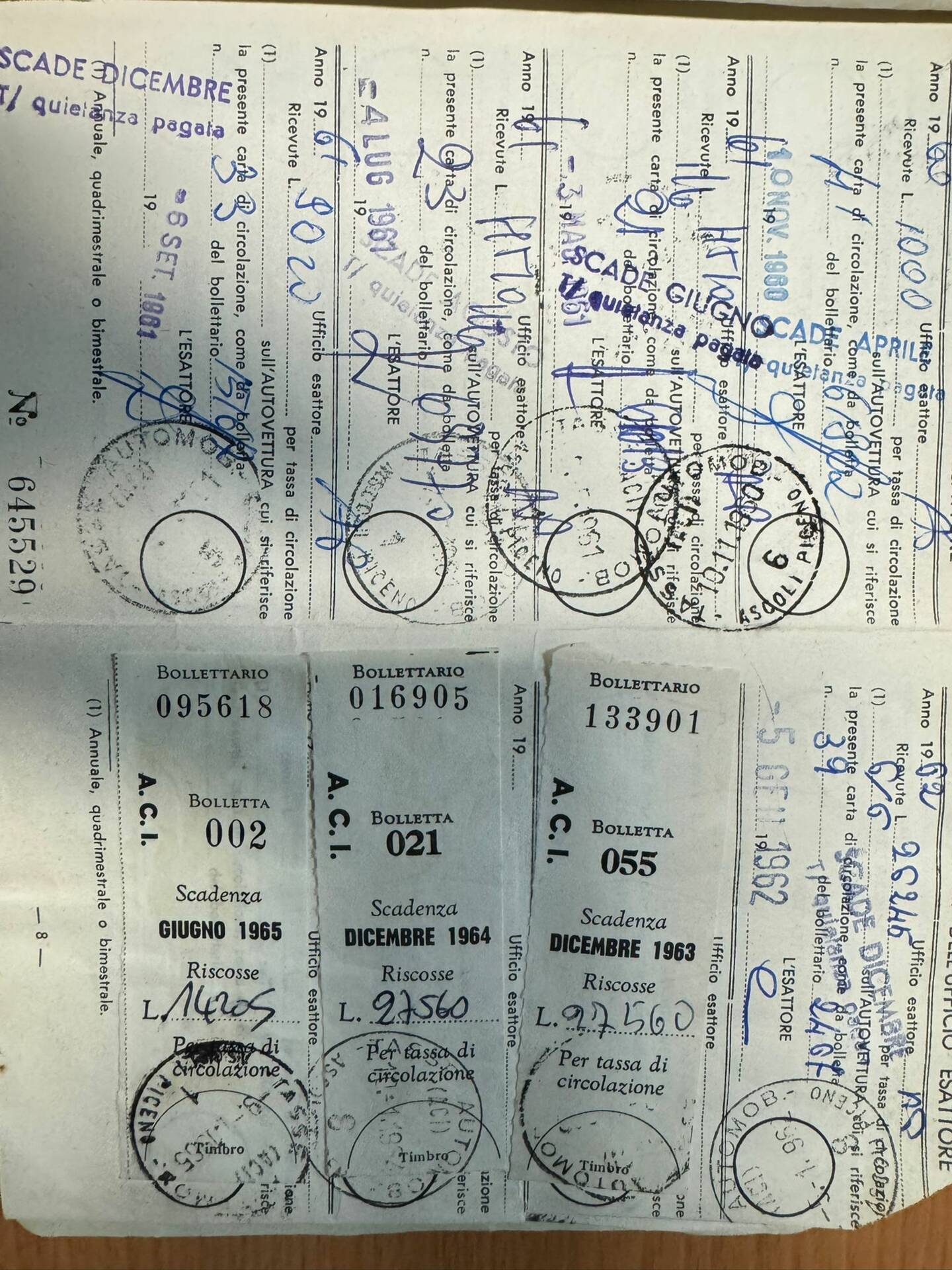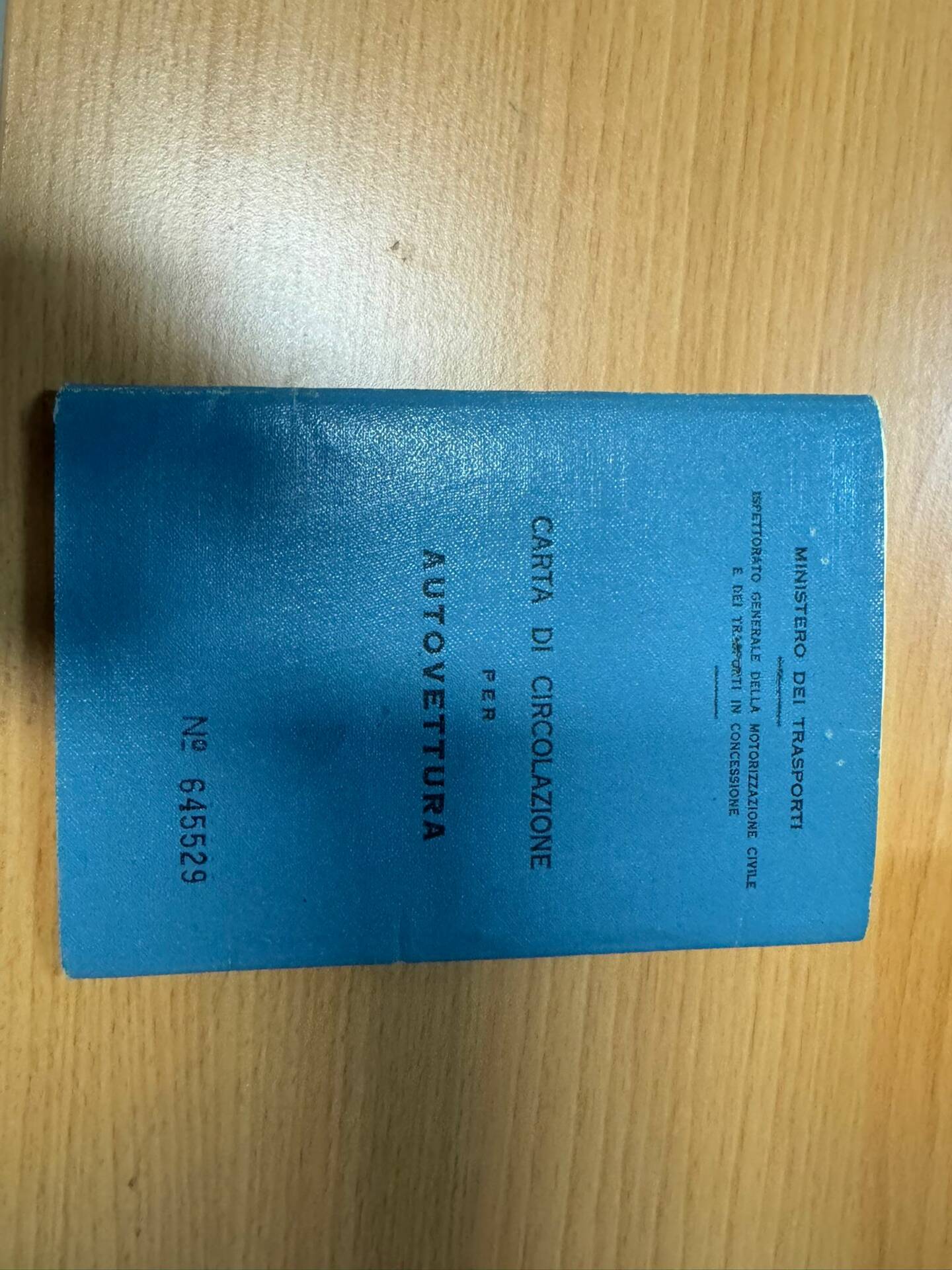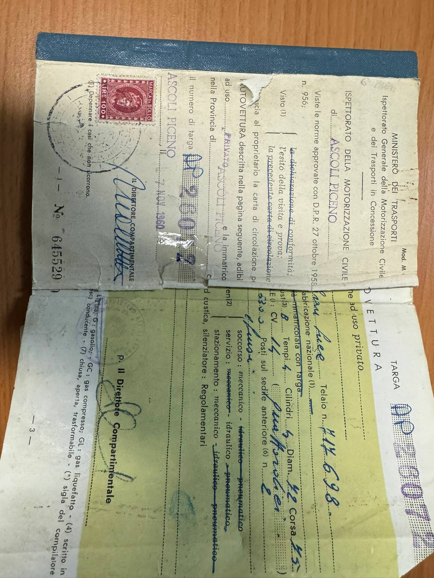 Das Fahrzeug stammt aus Italien und war Teil einer Museumssammlung. Die originalen italienischen Fahrzeugdokumente sind vorhanden, was die Herkunft und Identität des Wagens zusätzlich unterstreicht. Die Erstzulassung datiert auf den 1. Juli 1960. Weitere Details zur Besitzfolge oder Nutzungshistorie sind nicht überliefert, was bei Museumsfahrzeugen dieser Epoche nicht ungewöhnlich ist.