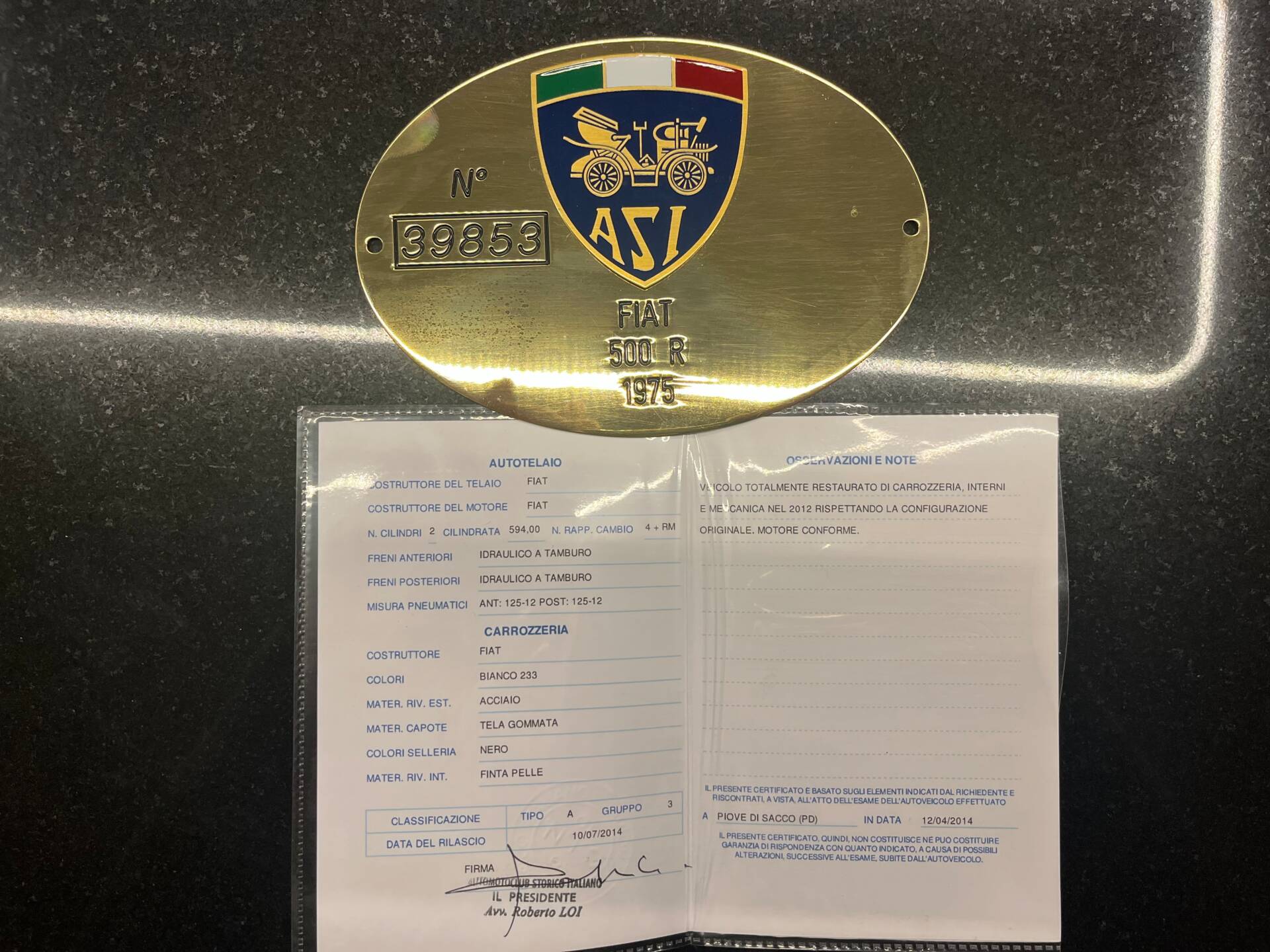 Zum Verkauf steht ein Fiat 500 R aus dem Baujahr 1975, vollständig und fachgerecht restauriert, authentisch in Werkskonfiguration und mit ASI Targa Oro Zertifizierung.