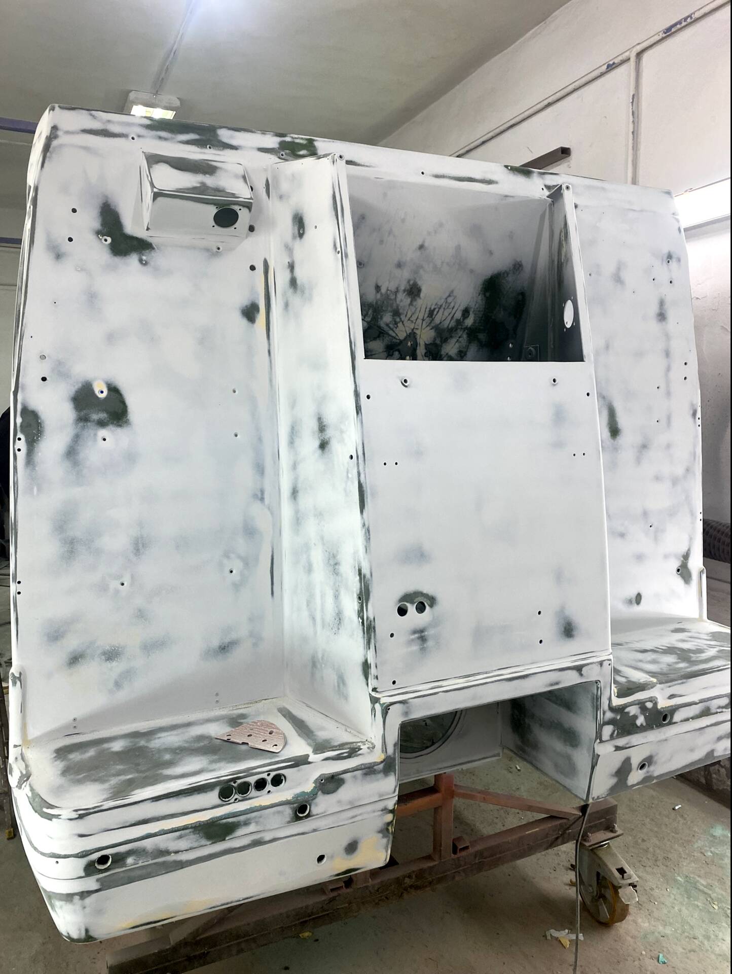 · Innenraum (Verkleidung/Polsterung) und Außenlack im RAL-Ton neu; LED-Beleuchtung.
