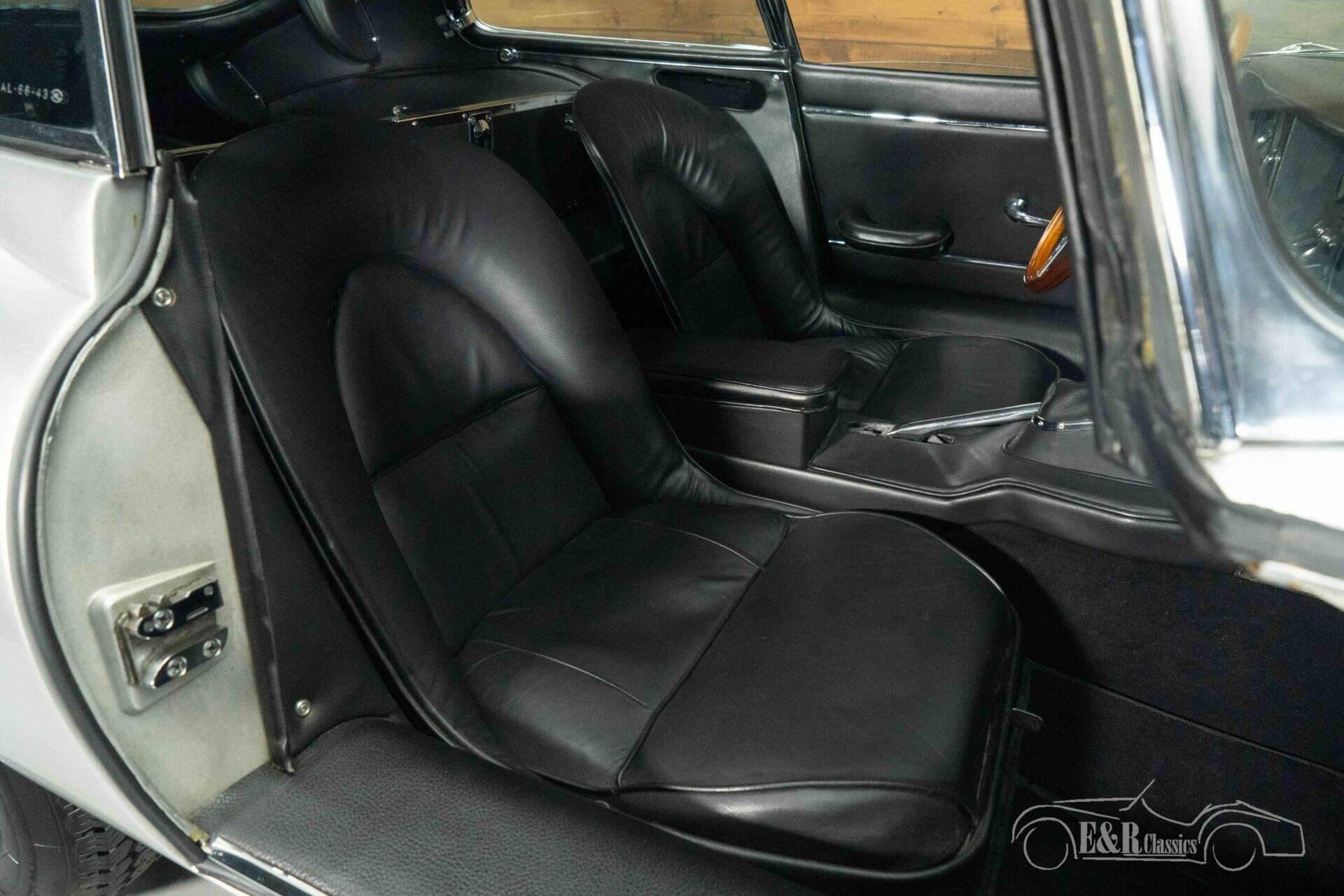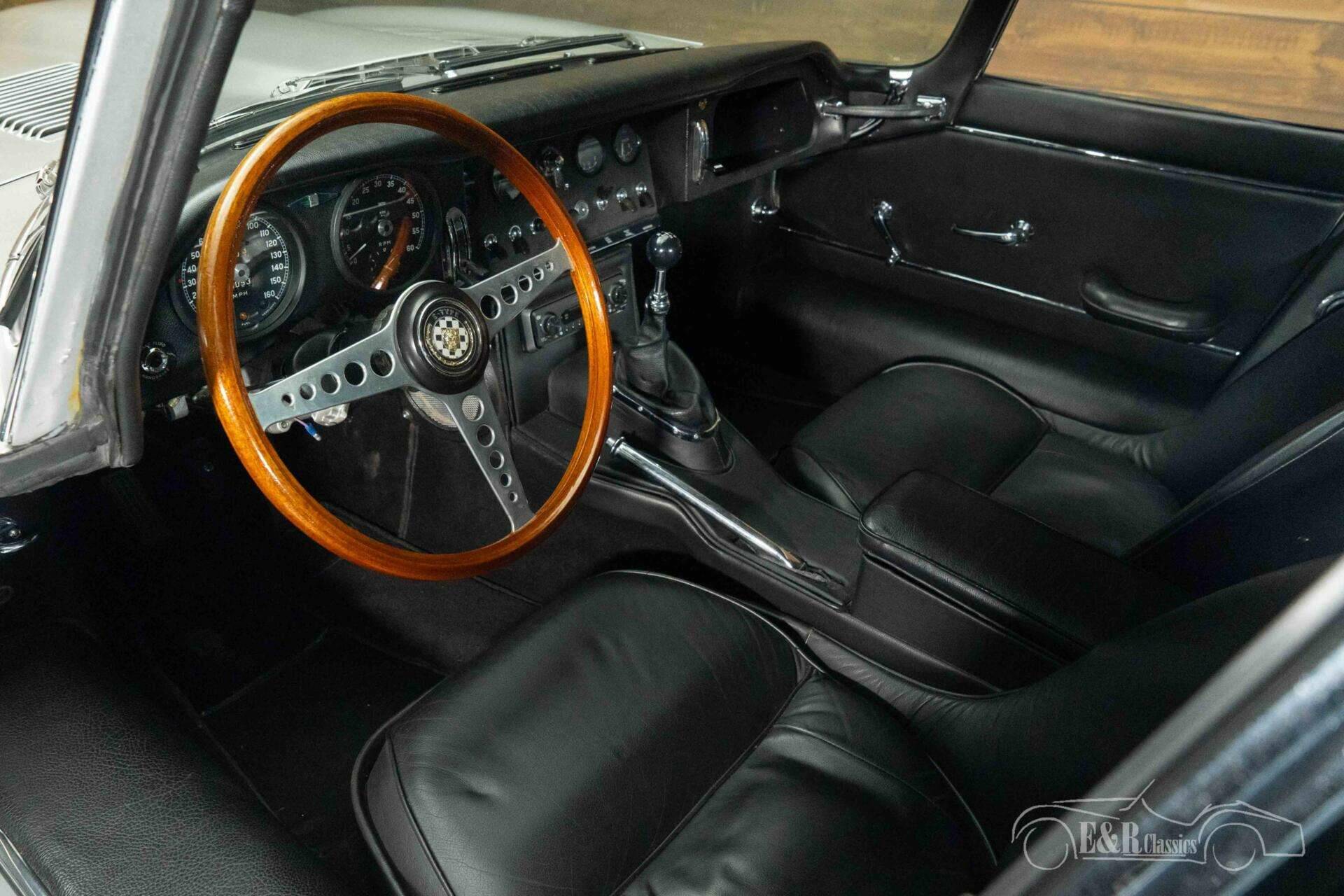 De carrosserie van deze E-Type Serie 1 is uitgevoerd in stijlvolle zilvermetallic lak, die perfect aansluit bij de elegante lijnen van de E-Type. De klassieke koplampen en achterlichten van de Serie 1 benadrukken het tijdloze karakter, terwijl de chromen spaakwielen een authentieke en luxueuze uitstraling geven. Ook het interieur sluit perfect aan bij het exterieur: een zwart lederen interieur contrasteert prachtig met de carrosserie en creëert een sportieve maar comfortabele ambiance. Stuurbekrachtiging verhoogt het rijcomfort zonder afbreuk te doen aan het klassieke gevoel. De wisselwerking van kleur, materialen en details maakt deze Jaguar een indrukwekkende verschijning, zowel rijdend als stilstaand.