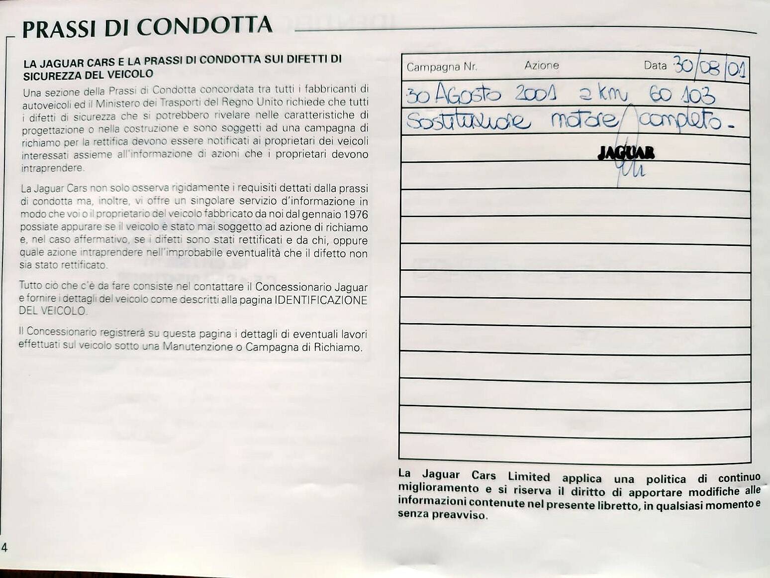 While the chassis has a total of 94,150 km, a significant mechanical intervention adds immense value to this specimen: on August 30, 2001 (at 60,000 km), the engine was entirely replaced by the official Jaguar dealership due to a mechanical failure. Therefore, the engine currently installed has covered only 34,000 km.