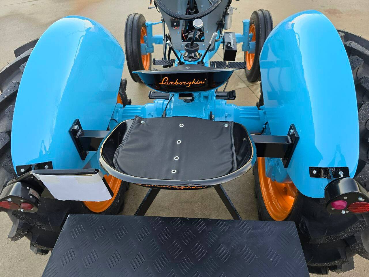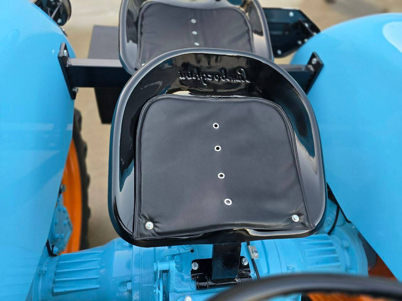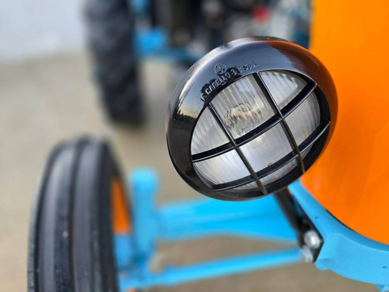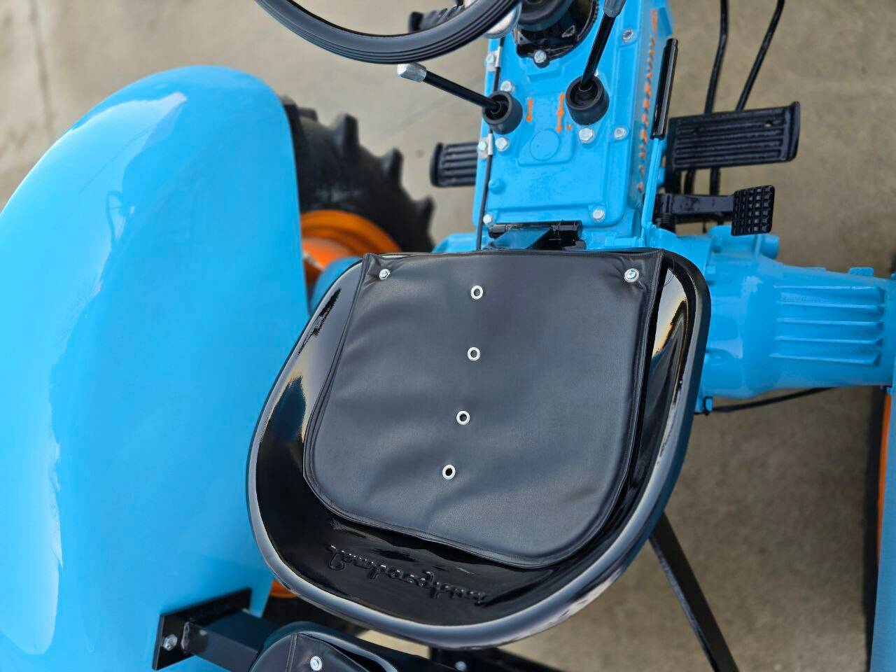 Der Lamborghini 3352 R Double Seat zeigt sich in einer sorgfältigen, 2025 bei „Lamborghini Tractor Italia“ abgeschlossenen Restaurierung. Der Traktor trägt die charakteristische Zweifarblackierung – ein leuchtendes Orange für den Motorhaubenbereich und die Felgen, ergänzt durch blau lackierte Kotflügel, Rahmen und Radnaben. Die originale 3352er-Decalcomanie sowie das Emblem auf der Motorhaube unterstreichen die Authentizität. Die Stahlfelgen mit orangefarbener Lackierung und blauen Naben tragen standesgemäße Agrarbereifung (vorne 5.50-16, hinten 11.2-28). Zu den Details zählen Frontscheinwerfer mit Schutzgittern, Heckleuchten, halb abgedeckte hintere Kotflügel, sowie der aluminiumfarbene, lackierte Werkzeugkasten mit Lamborghini-Logo.