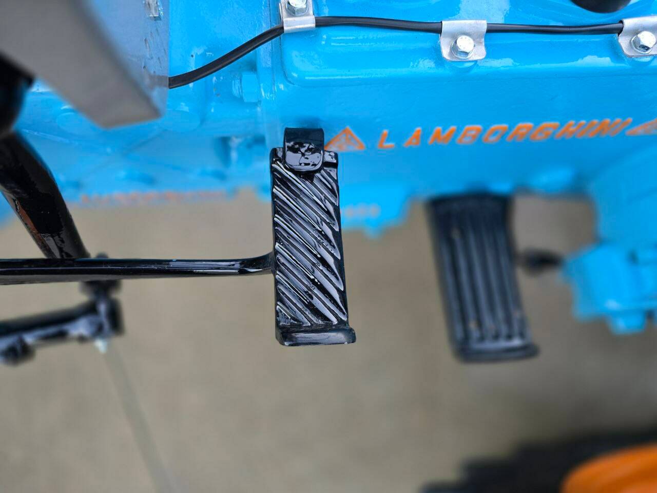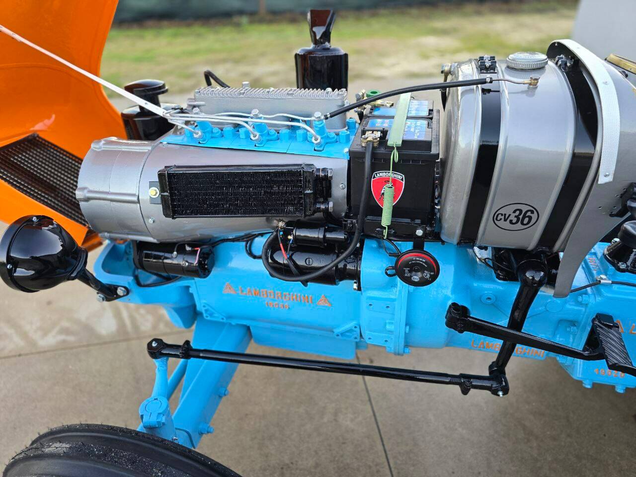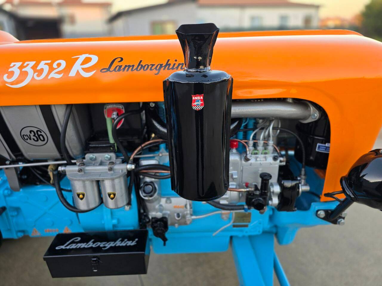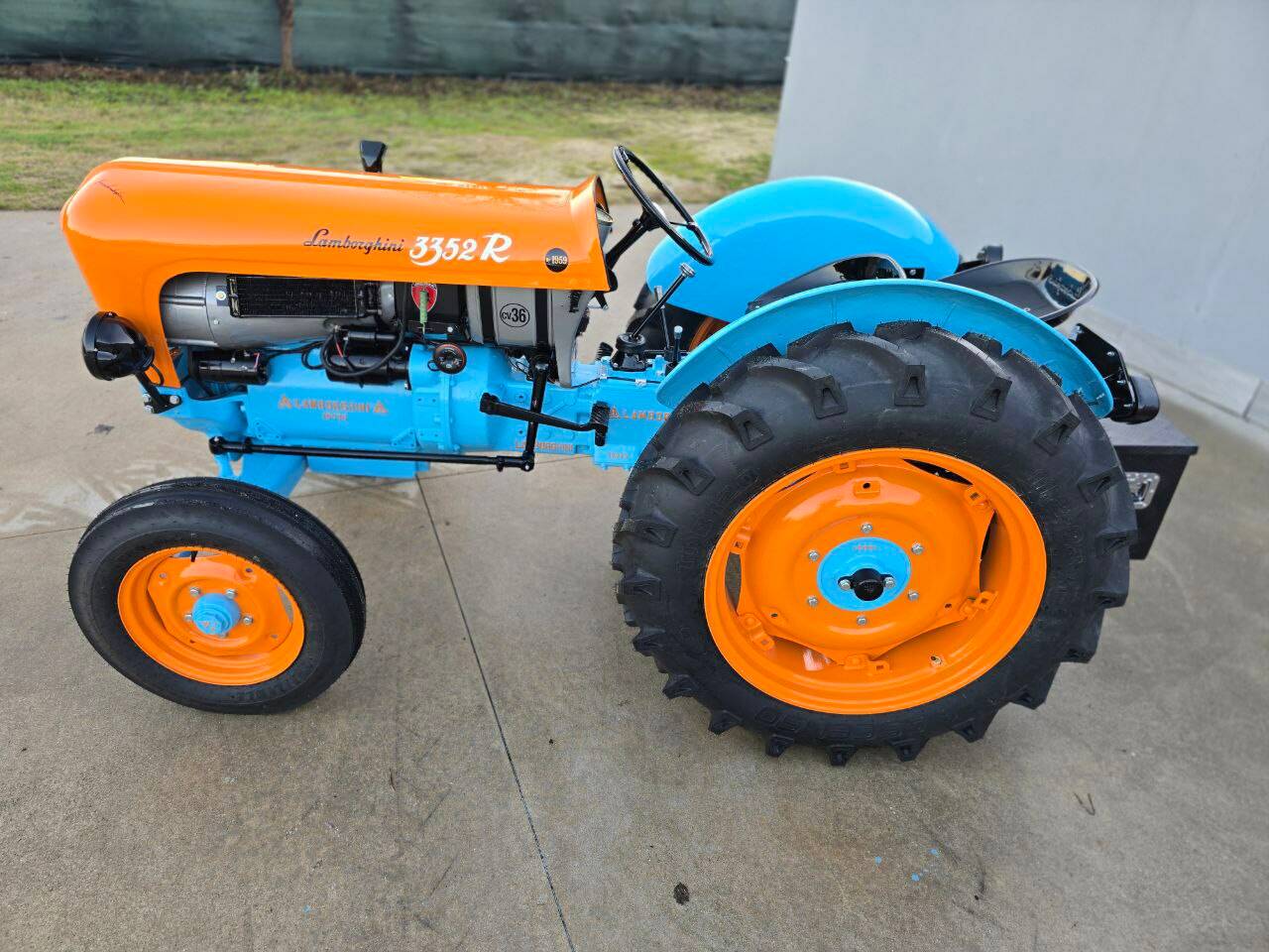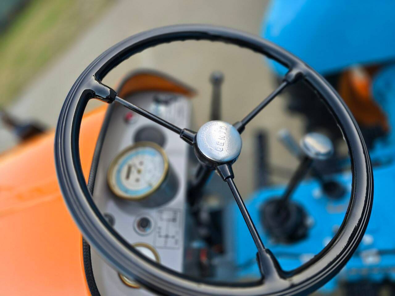 Der Lamborghini 3352 R Double Seat zeigt sich in einer sorgfältigen, 2025 bei „Lamborghini Tractor Italia“ abgeschlossenen Restaurierung. Der Traktor trägt die charakteristische Zweifarblackierung – ein leuchtendes Orange für den Motorhaubenbereich und die Felgen, ergänzt durch blau lackierte Kotflügel, Rahmen und Radnaben. Die originale 3352er-Decalcomanie sowie das Emblem auf der Motorhaube unterstreichen die Authentizität. Die Stahlfelgen mit orangefarbener Lackierung und blauen Naben tragen standesgemäße Agrarbereifung (vorne 5.50-16, hinten 11.2-28). Zu den Details zählen Frontscheinwerfer mit Schutzgittern, Heckleuchten, halb abgedeckte hintere Kotflügel, sowie der aluminiumfarbene, lackierte Werkzeugkasten mit Lamborghini-Logo.