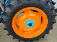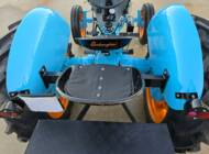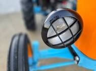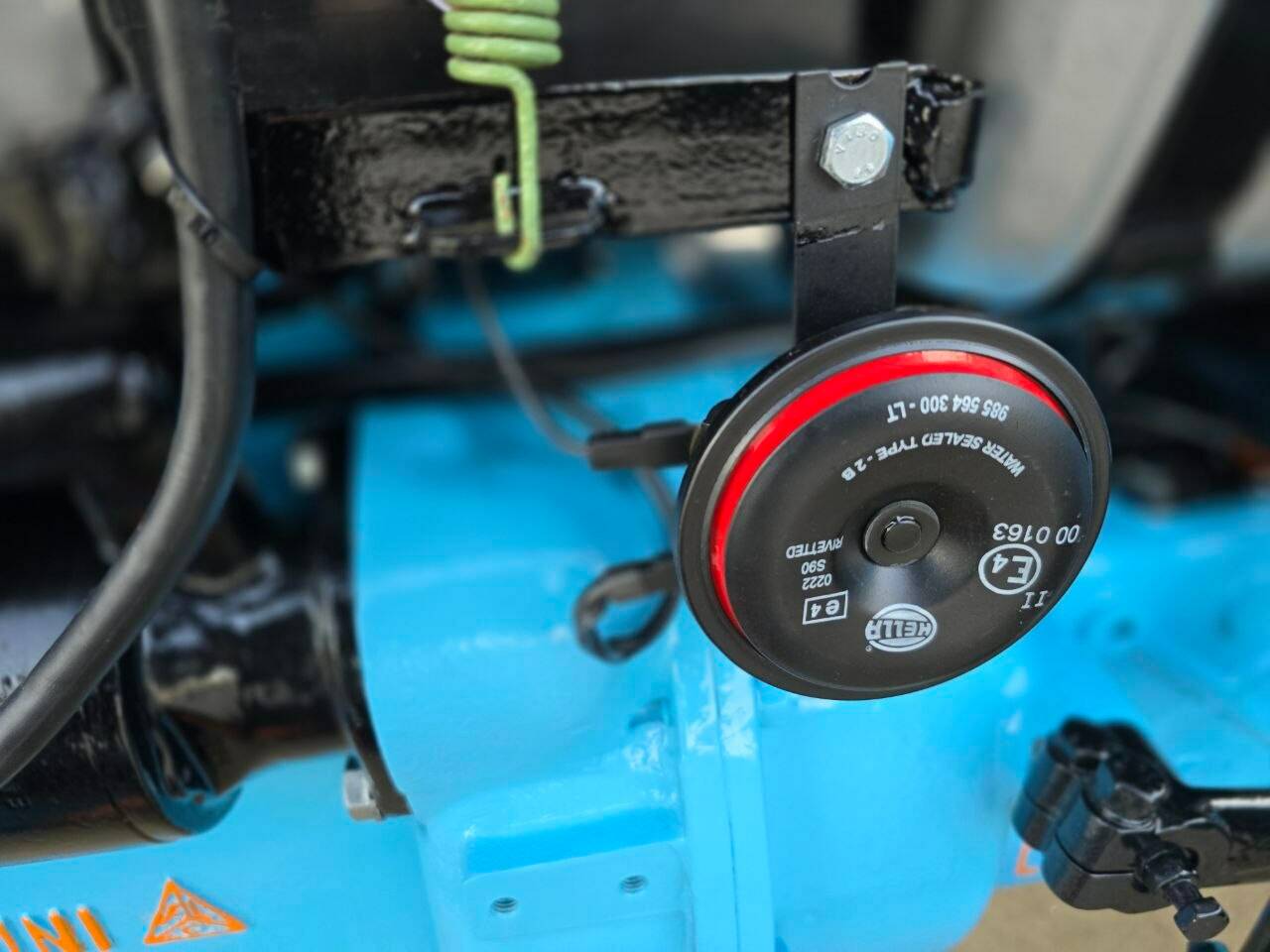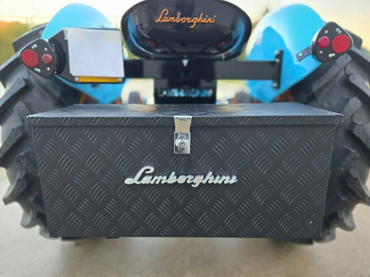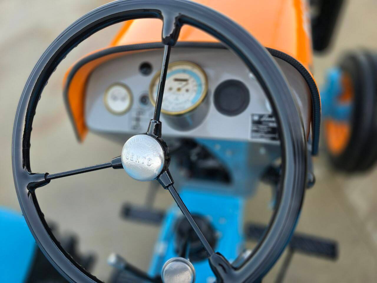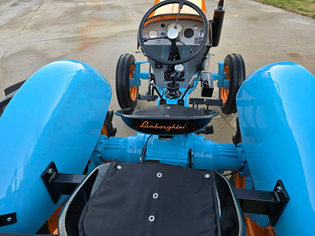 Der Lamborghini 3352 R Double Seat zeigt sich in einer sorgfältigen, 2025 bei „Lamborghini Tractor Italia“ abgeschlossenen Restaurierung. Der Traktor trägt die charakteristische Zweifarblackierung – ein leuchtendes Orange für den Motorhaubenbereich und die Felgen, ergänzt durch blau lackierte Kotflügel, Rahmen und Radnaben. Die originale 3352er-Decalcomanie sowie das Emblem auf der Motorhaube unterstreichen die Authentizität. Die Stahlfelgen mit orangefarbener Lackierung und blauen Naben tragen standesgemäße Agrarbereifung (vorne 5.50-16, hinten 11.2-28). Zu den Details zählen Frontscheinwerfer mit Schutzgittern, Heckleuchten, halb abgedeckte hintere Kotflügel, sowie der aluminiumfarbene, lackierte Werkzeugkasten mit Lamborghini-Logo.