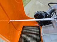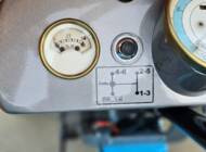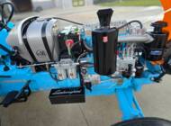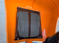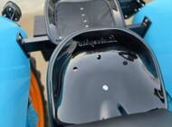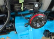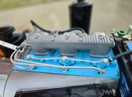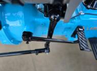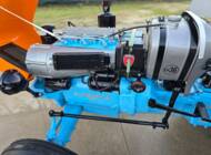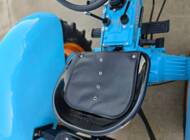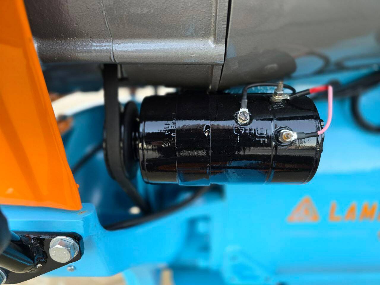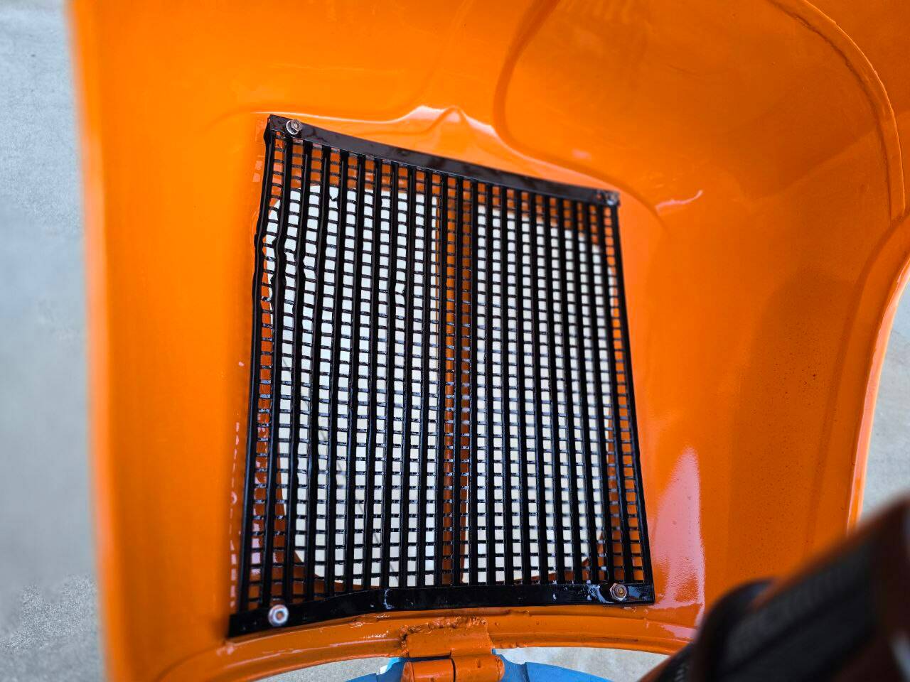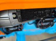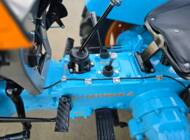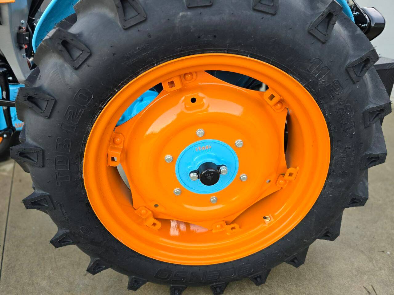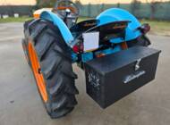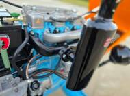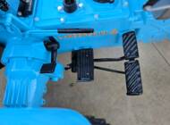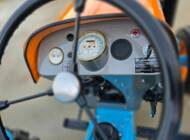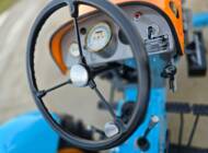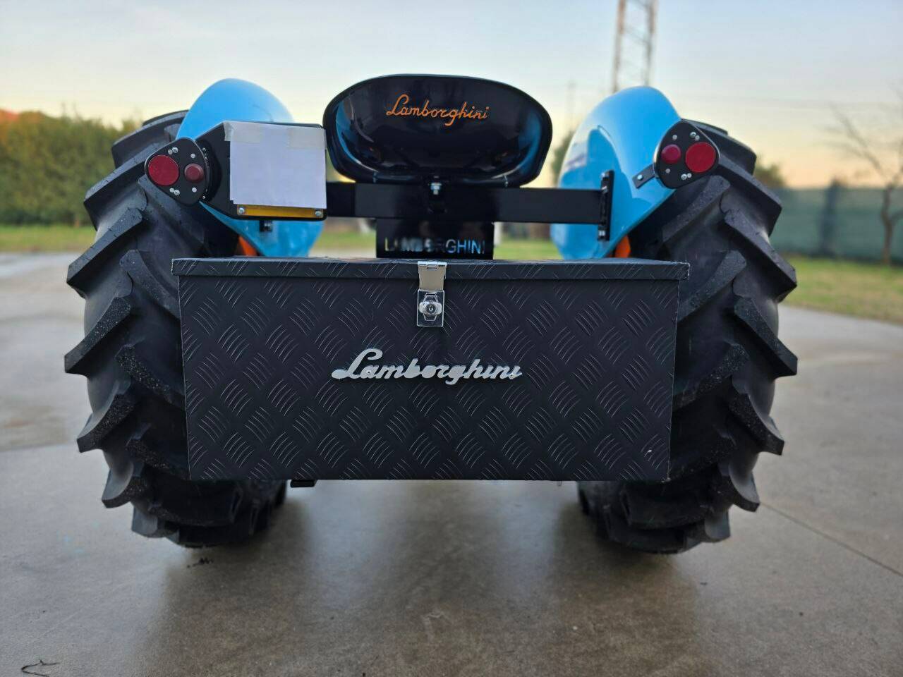 Der Lamborghini 3352 R Double Seat zeigt sich in einer sorgfältigen, 2025 bei „Lamborghini Tractor Italia“ abgeschlossenen Restaurierung. Der Traktor trägt die charakteristische Zweifarblackierung – ein leuchtendes Orange für den Motorhaubenbereich und die Felgen, ergänzt durch blau lackierte Kotflügel, Rahmen und Radnaben. Die originale 3352er-Decalcomanie sowie das Emblem auf der Motorhaube unterstreichen die Authentizität. Die Stahlfelgen mit orangefarbener Lackierung und blauen Naben tragen standesgemäße Agrarbereifung (vorne 5.50-16, hinten 11.2-28). Zu den Details zählen Frontscheinwerfer mit Schutzgittern, Heckleuchten, halb abgedeckte hintere Kotflügel, sowie der aluminiumfarbene, lackierte Werkzeugkasten mit Lamborghini-Logo.