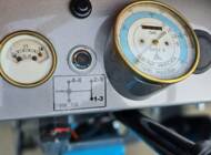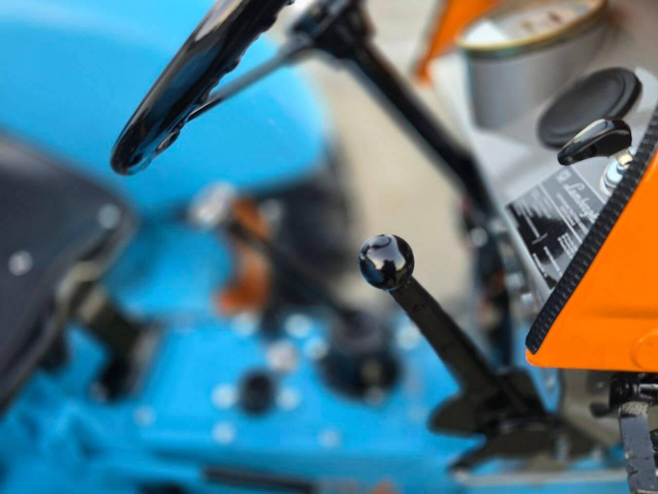 Das Doppelsitz-Layout entspricht dem damaligen Sicherheitsstandard – beide Sitze sind aus schwarz lackiertem Stahl mit passenden schwarzen Polstern und zeigen den Lamborghini-Schriftzug auf den Lehnen. Die Armaturentafel ist sauber lackiert und verfügt über ein originales Öldruckmanometer sowie einen Lamborghini-gebrandeten Drehzahlmesser mit inverser Skala. Das Dreispeichen-Lenkrad, manuelle Gasbedienung, Getriebehebel und Pedalerie (separate Trommelbremsen für die Hinterräder, Kupplungspedal) runden das Bild ab.