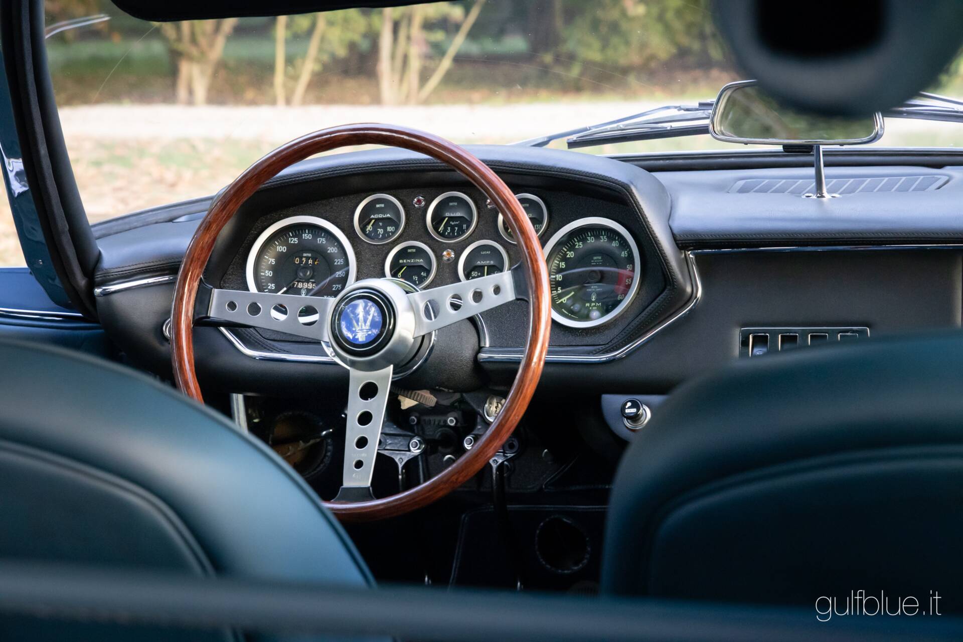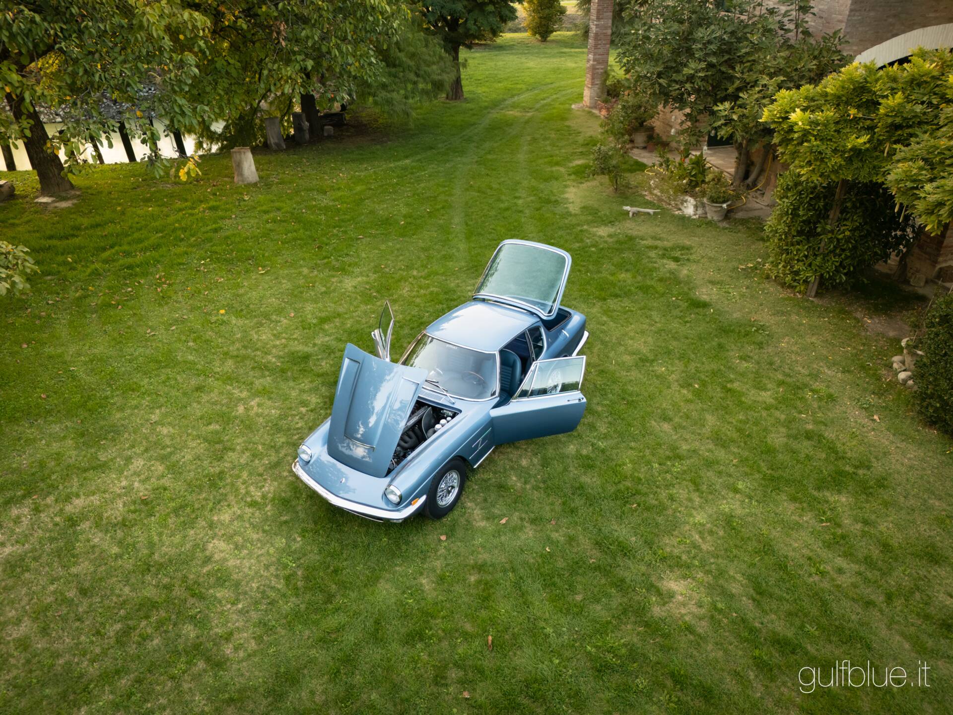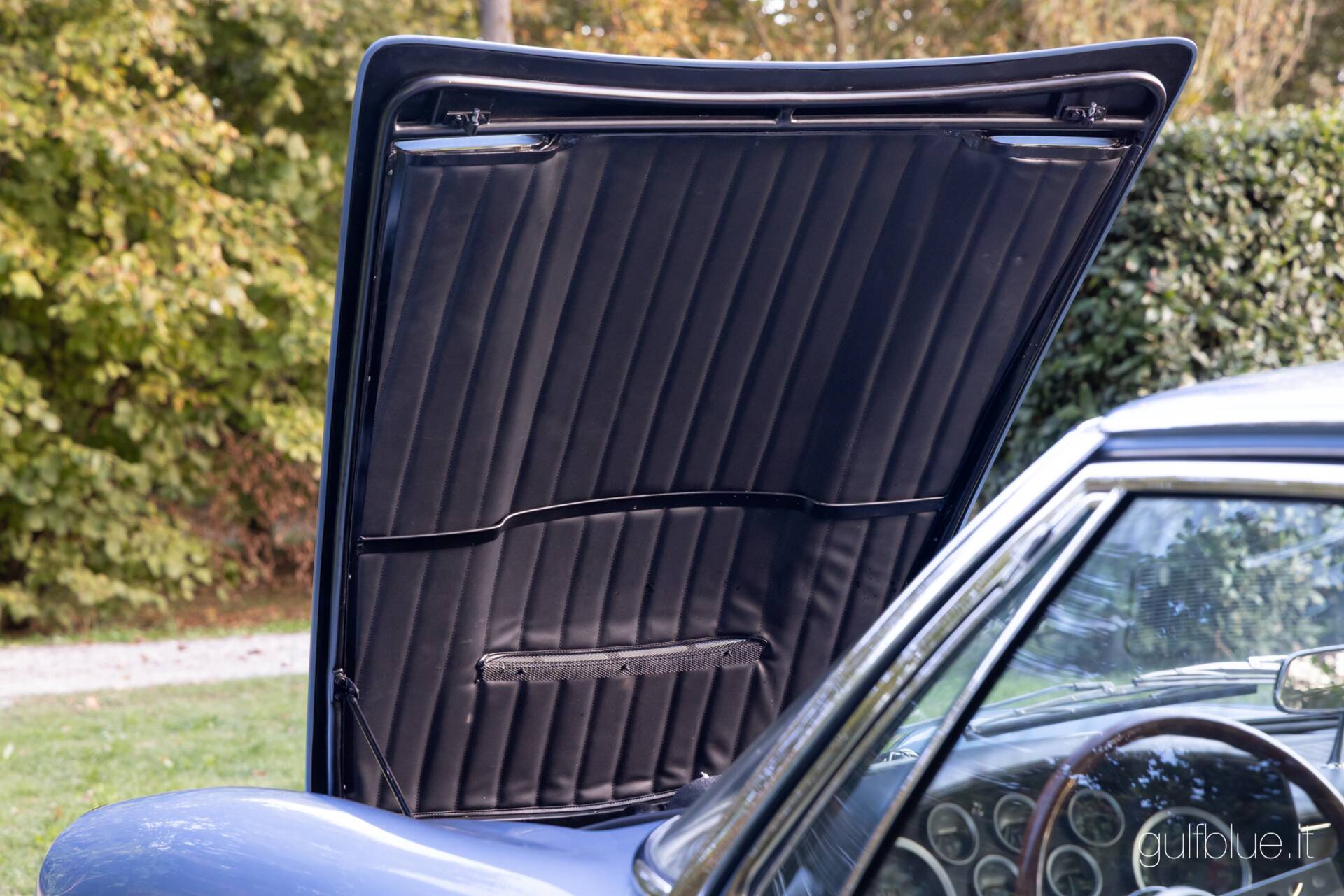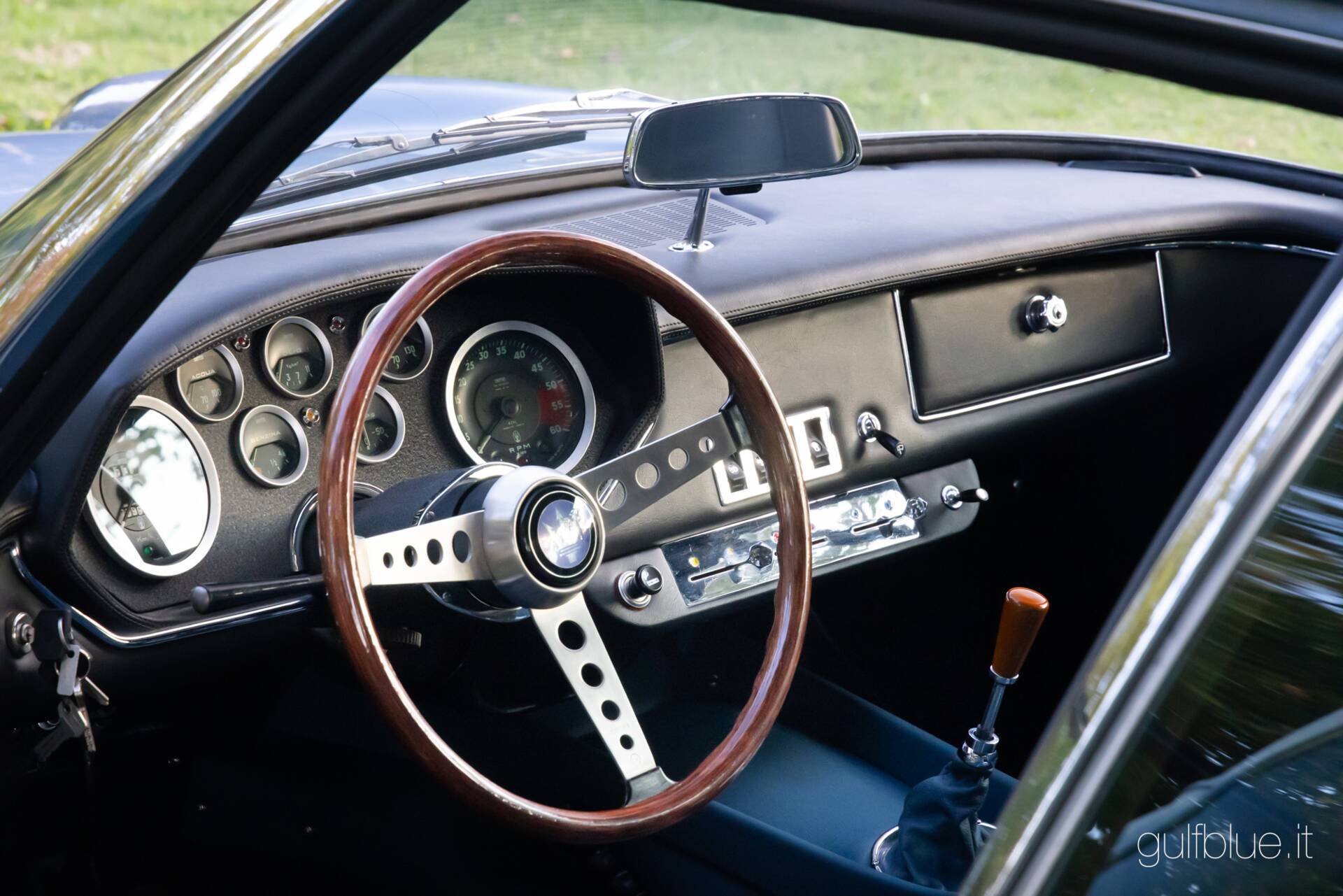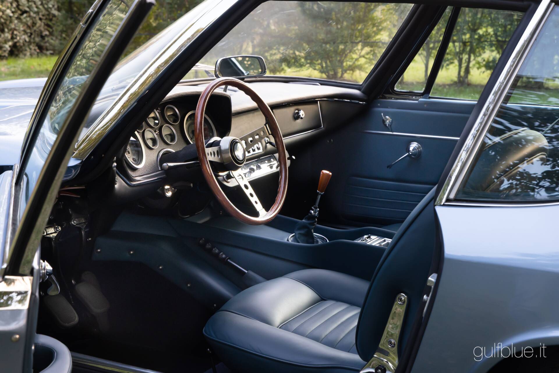 The aluminum bodywork, designed by Pietro Frua, is a masterpiece of elegance for a two-seater coupé: a distinctive feature is the high front bumper that separates the sloping hood from the horizontal, almost hidden air intake; furthermore, there is also the fully openable rear window, ideal for loading large amounts of luggage.