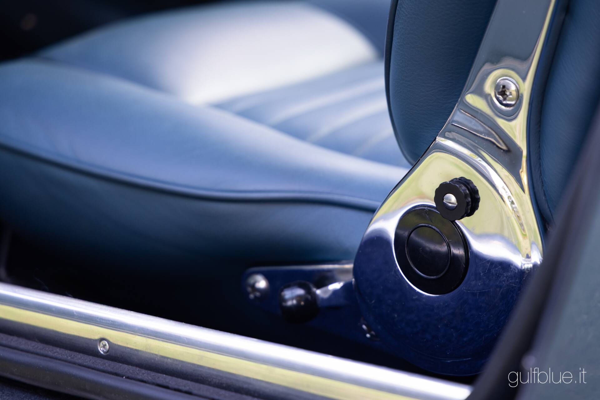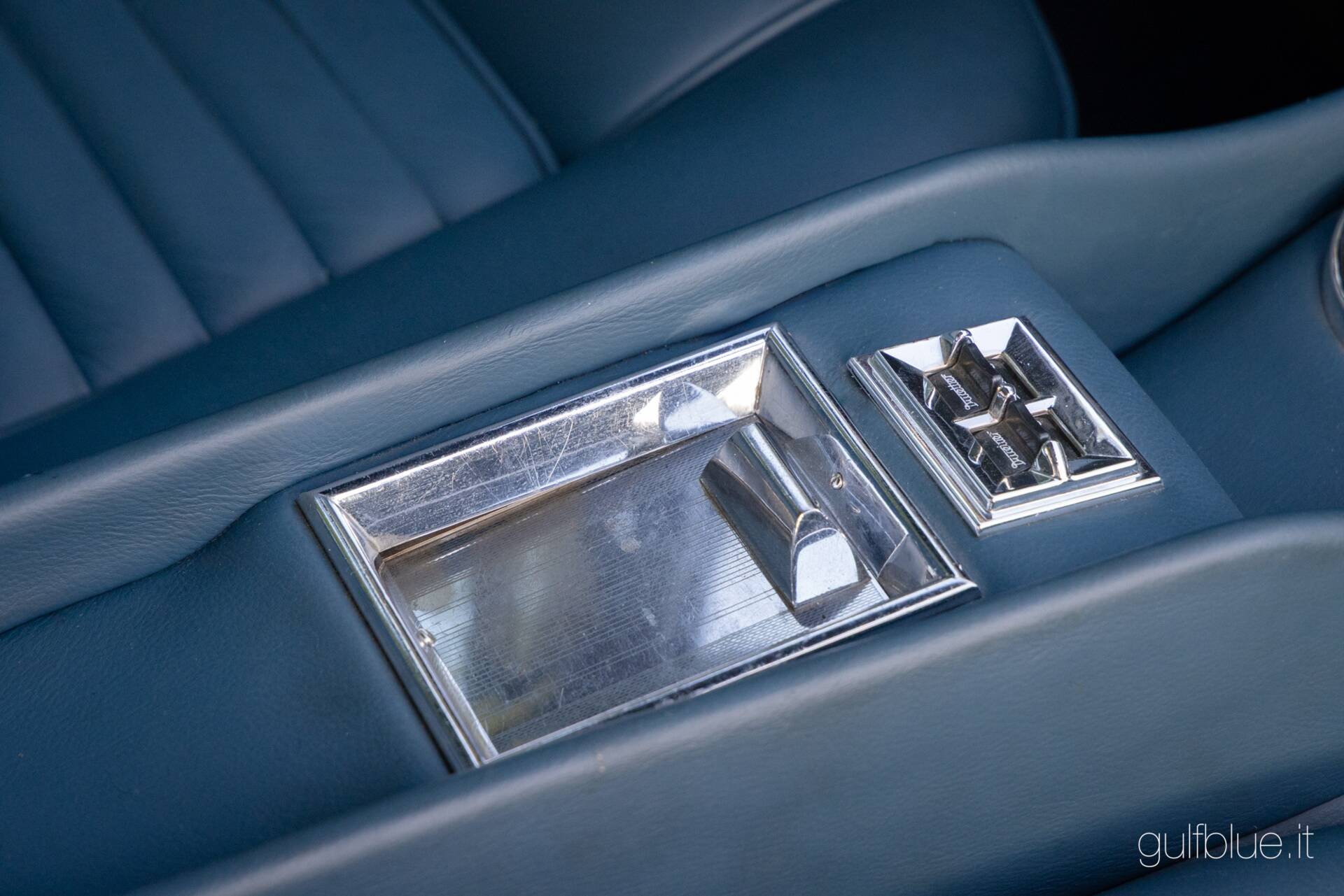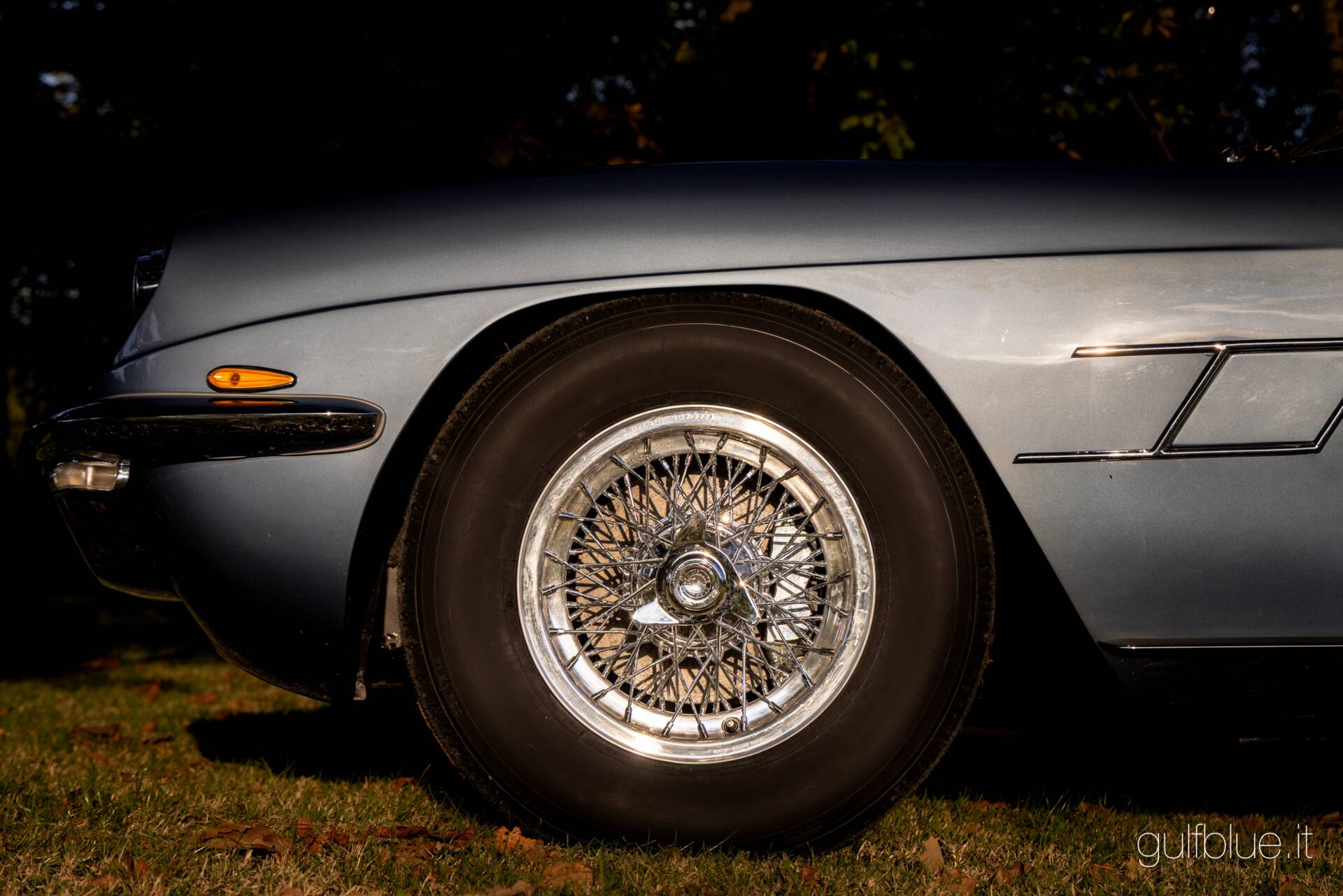 The light blue color combined with the blue leather interior is very distinctive and lends great personality to an already impressive car. Borrani spoked wheels mounted on Pirelli P400 tires frame this Mistral 4000.