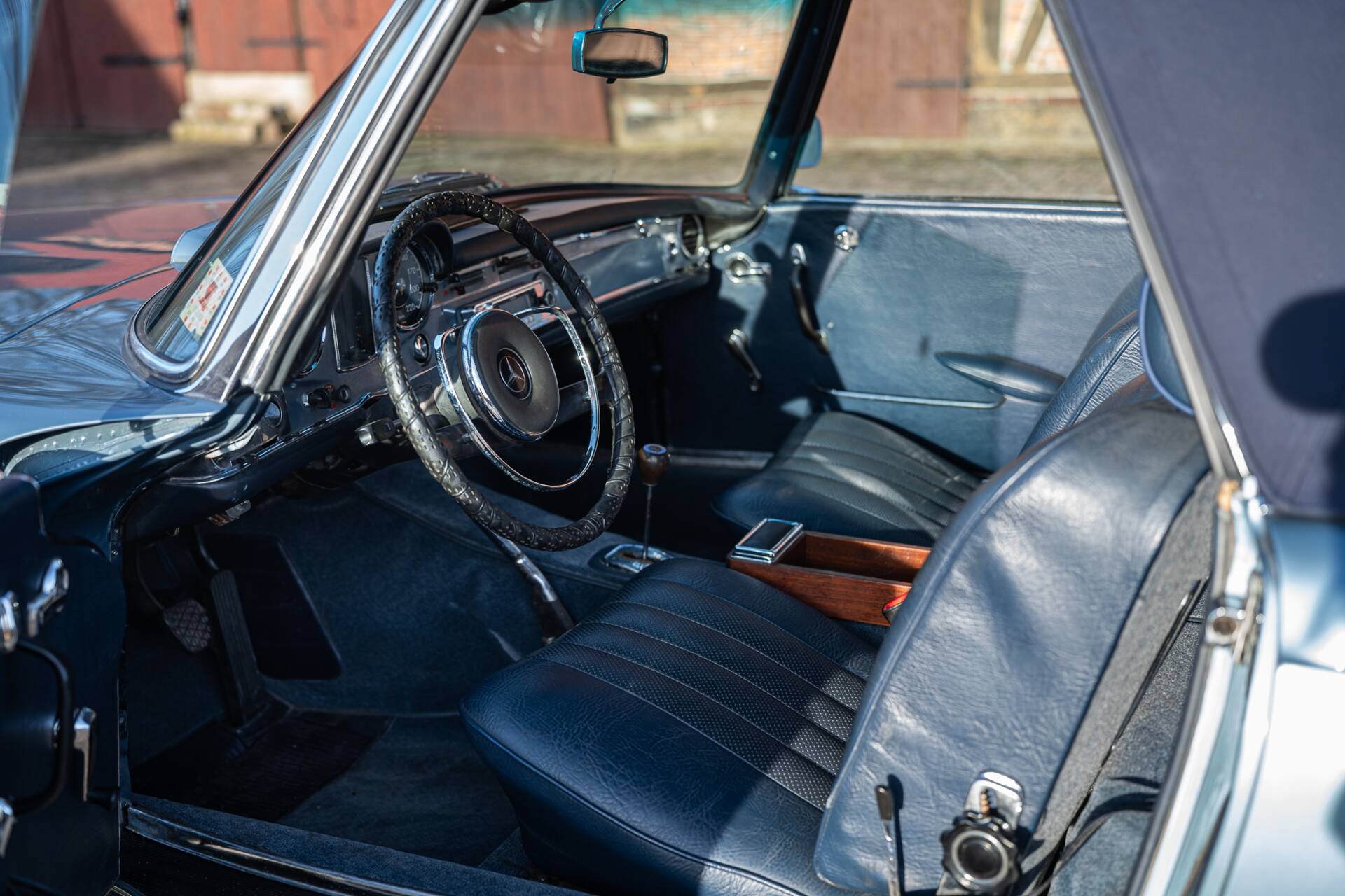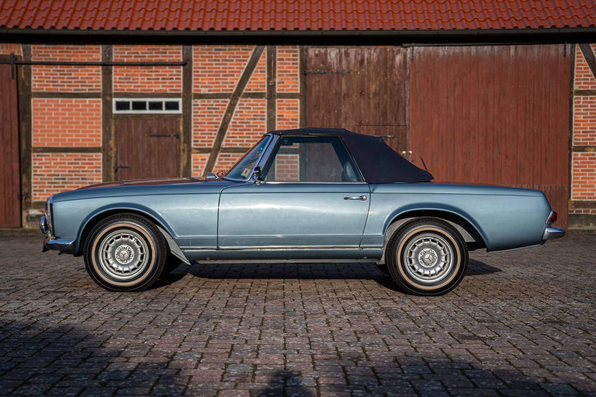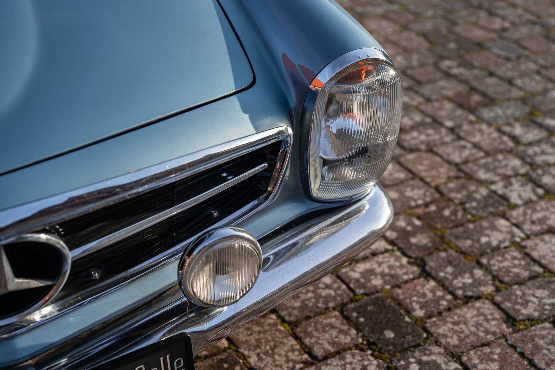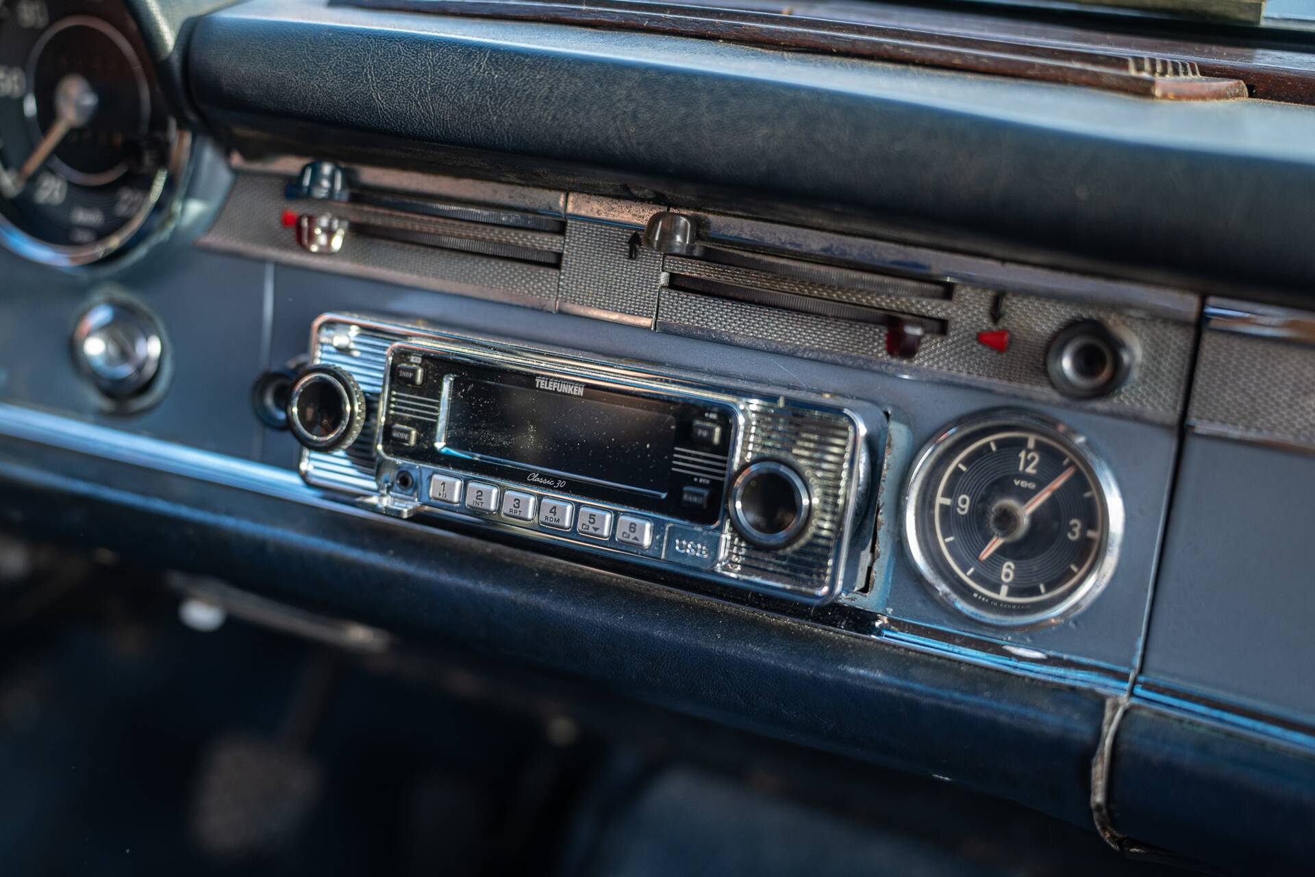 Ihr Design ist eher nüchtern und zurückhaltend, aber mit gelungenen Proportionen. Das Erscheinungsbild prägen die großen Scheinwerfer mit integrierten Nebelleuchten und Blinkern, die den breiten Grill umrahmen, während die aus heutiger Sicht zierlichen Rückleuchten das Heck filigran wirken lassen. Noch ungewöhnlicher mutet heute der Tankeinfüllstutzen ohne Klappe an. Immerhin, er ist verchromt. Den Beinamen „Pagode” verdanken die SLs dem als Sonderausstattung für 623 Mark erhältlichen Hardtop, weil das Dach seitlich höher war als in der Mitte. Das extra Dach gehört selbstverständlich auch zu dieser 67er Pagode welche bis 2016 in Mississippi leben durfte. In Deutschland angekommen wurde der SL umfangreich überholt und neu lackiert. Eine deutsche Zulassung inklusive H-Abnahme liegt vor. Wer allerdings ein perfektes Auto mit lupenreiner Historie sucht, braucht uns nicht anzurufen. Weder der KM Stand ist nachweisbar, noch liegt ein Scheckheft vor. Ob der Motor oder das Getriebe noch original ist, bleibt unbekannt. Dafür gibt es ein Aktenordner mit vielen handschriftlichen Notizen der durchgeführten Arbeiten und ein paar Rechnungen. Besichtigung auf der Hebebühne ist kein Problem. Der Verkauf erfolgt im Kundenauftrag.