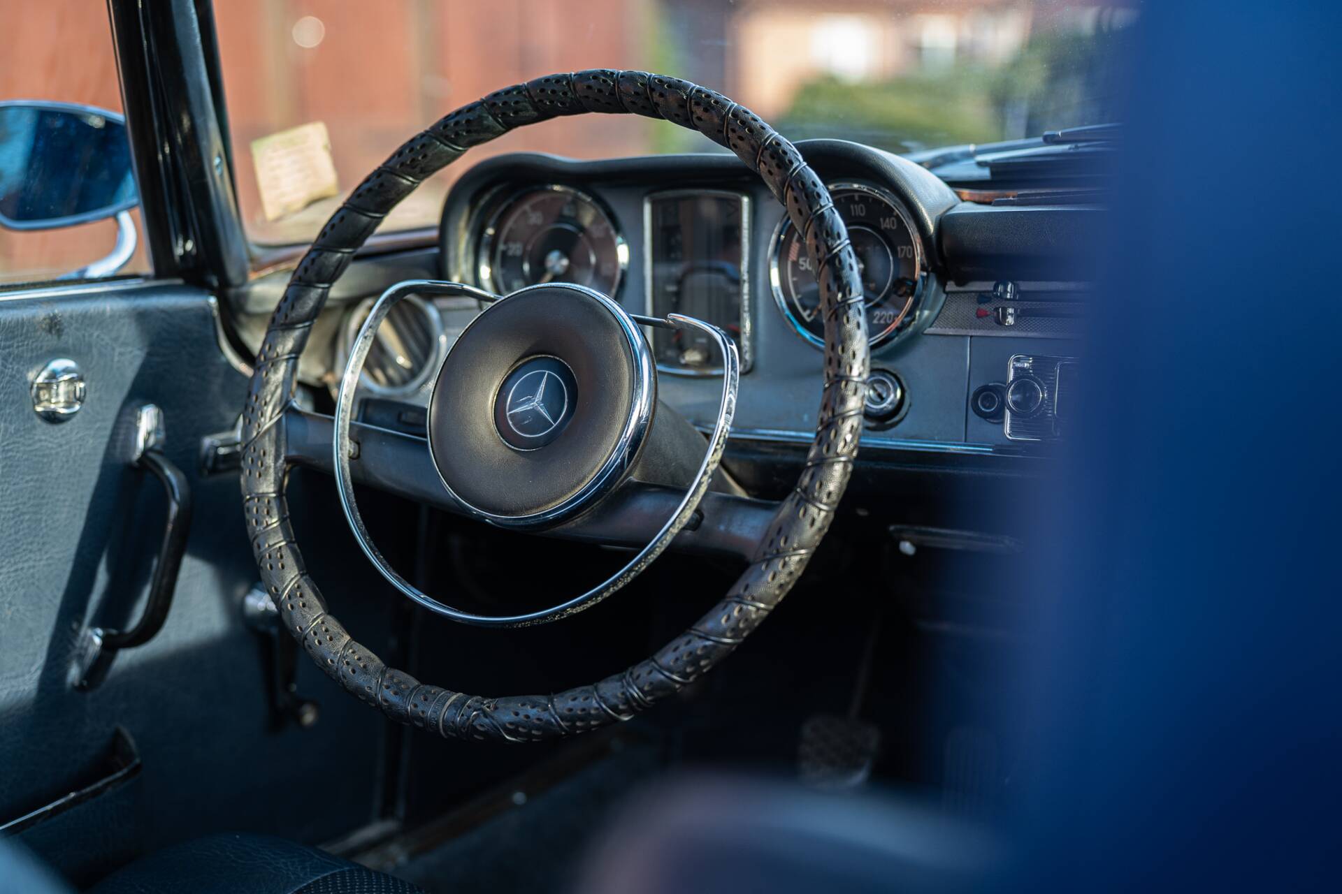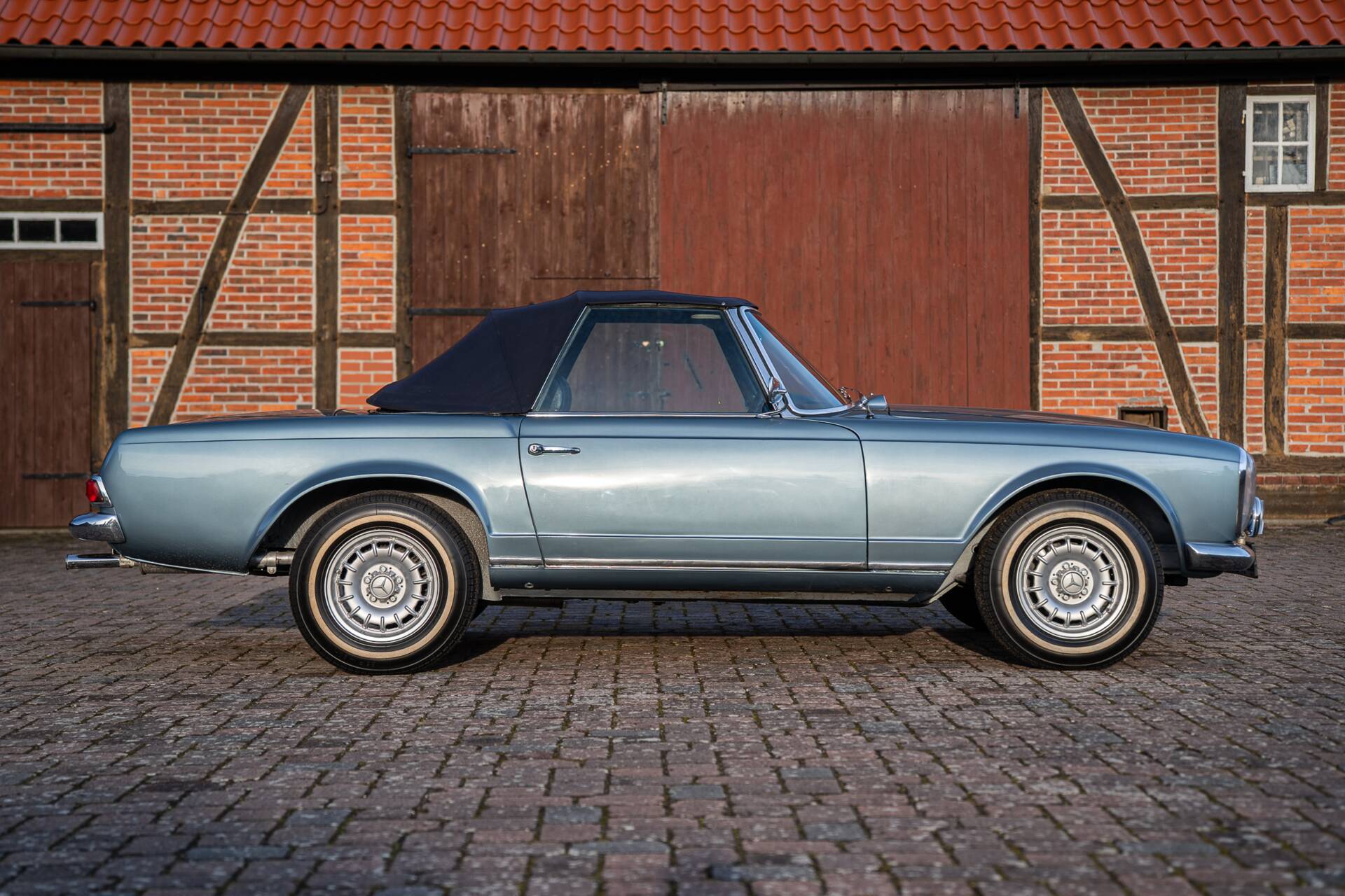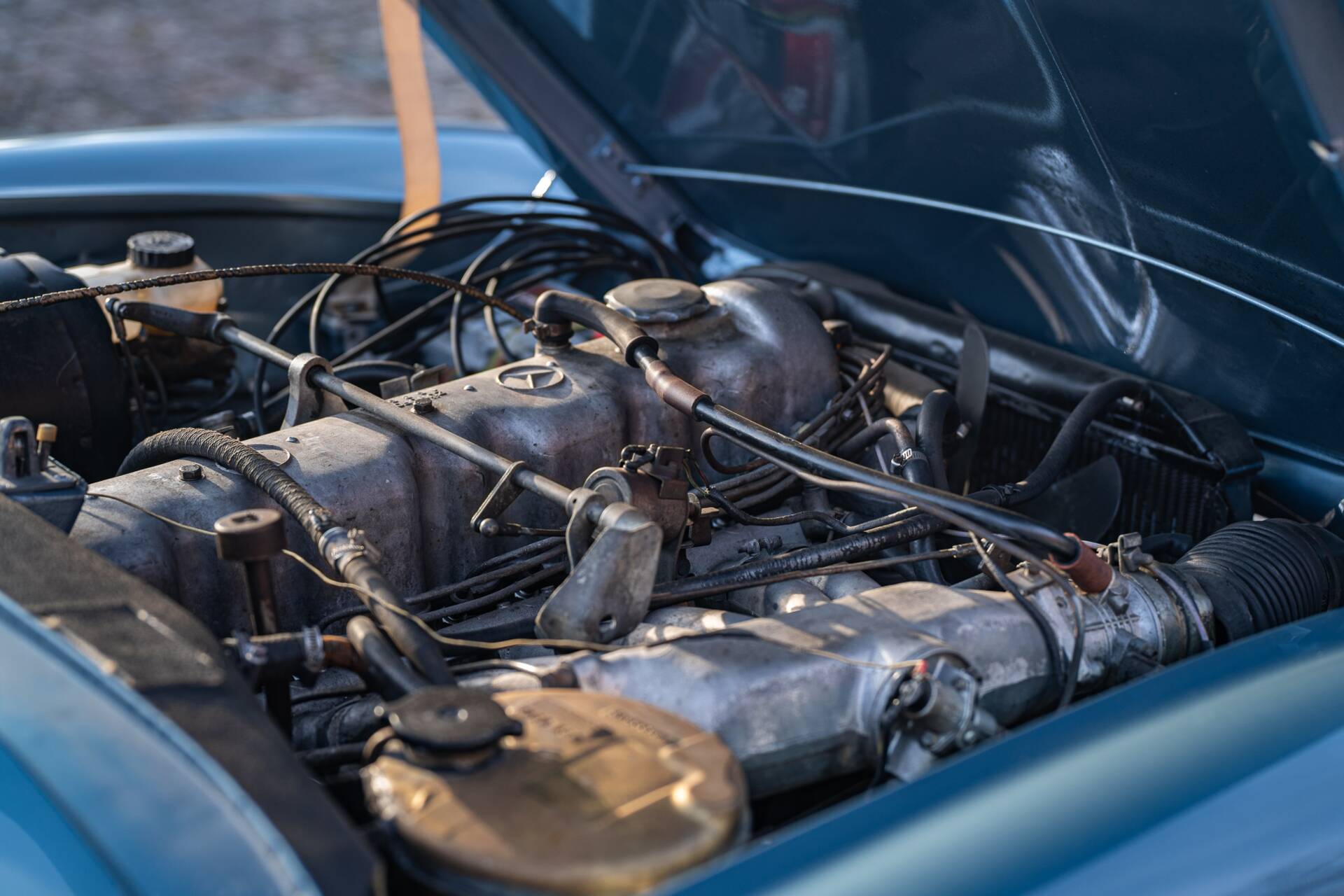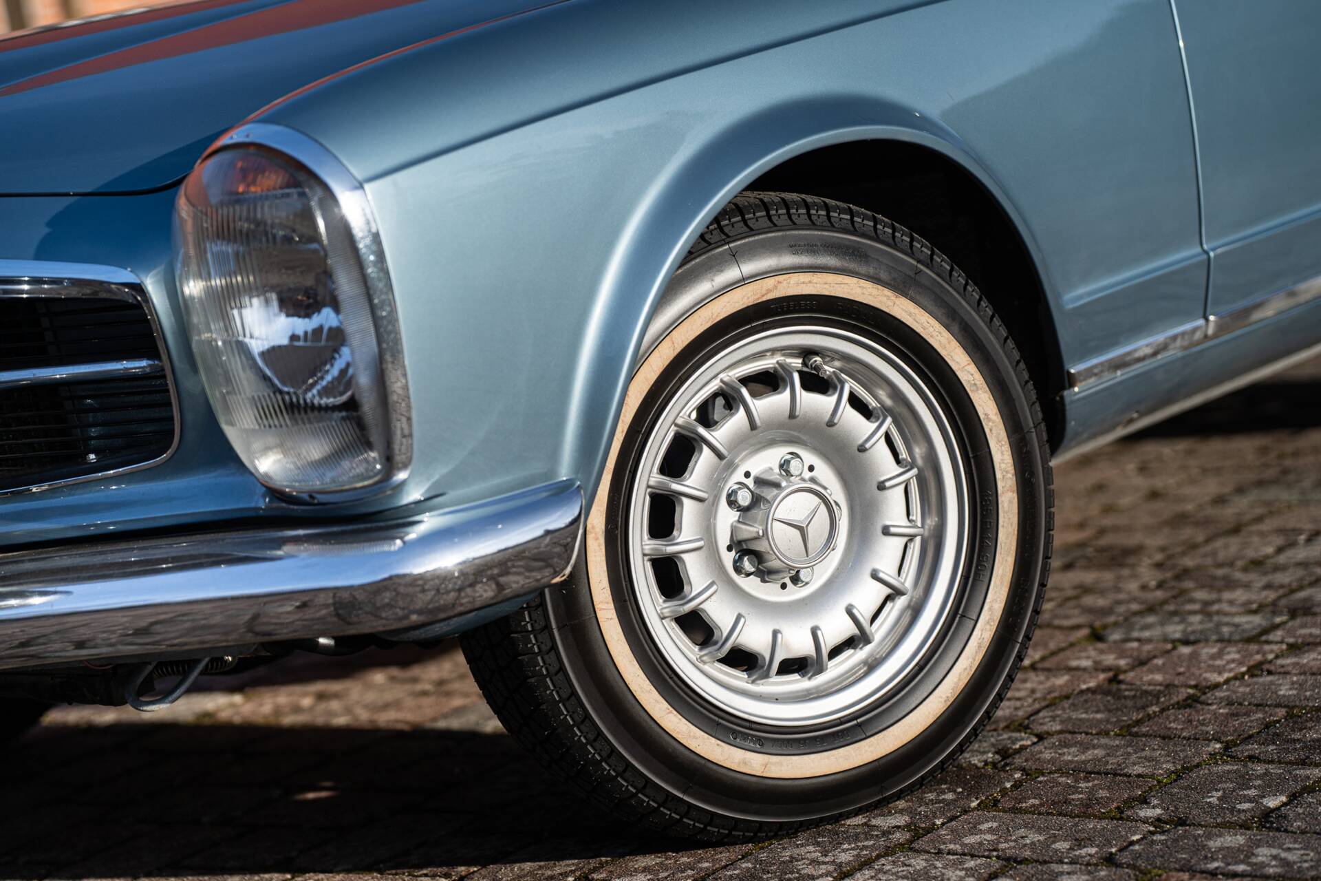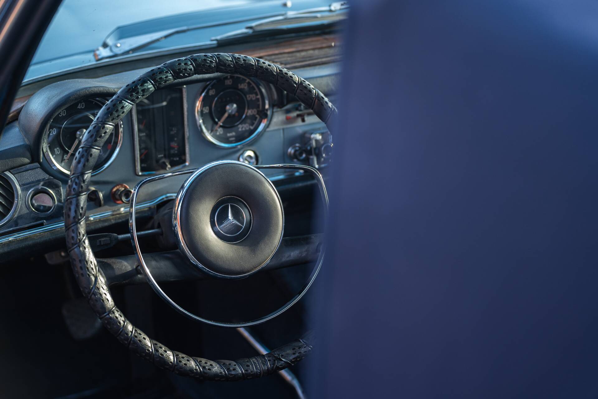 Ihr Design ist eher nüchtern und zurückhaltend, aber mit gelungenen Proportionen. Das Erscheinungsbild prägen die großen Scheinwerfer mit integrierten Nebelleuchten und Blinkern, die den breiten Grill umrahmen, während die aus heutiger Sicht zierlichen Rückleuchten das Heck filigran wirken lassen. Noch ungewöhnlicher mutet heute der Tankeinfüllstutzen ohne Klappe an. Immerhin, er ist verchromt. Den Beinamen „Pagode” verdanken die SLs dem als Sonderausstattung für 623 Mark erhältlichen Hardtop, weil das Dach seitlich höher war als in der Mitte. Das extra Dach gehört selbstverständlich auch zu dieser 67er Pagode welche bis 2016 in Mississippi leben durfte. In Deutschland angekommen wurde der SL umfangreich überholt und neu lackiert. Eine deutsche Zulassung inklusive H-Abnahme liegt vor. Wer allerdings ein perfektes Auto mit lupenreiner Historie sucht, braucht uns nicht anzurufen. Weder der KM Stand ist nachweisbar, noch liegt ein Scheckheft vor. Ob der Motor oder das Getriebe noch original ist, bleibt unbekannt. Dafür gibt es ein Aktenordner mit vielen handschriftlichen Notizen der durchgeführten Arbeiten und ein paar Rechnungen. Besichtigung auf der Hebebühne ist kein Problem. Der Verkauf erfolgt im Kundenauftrag.