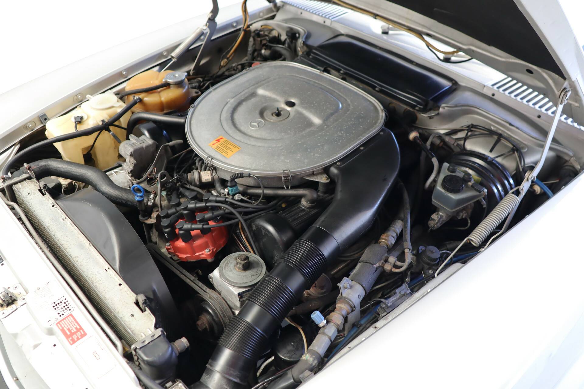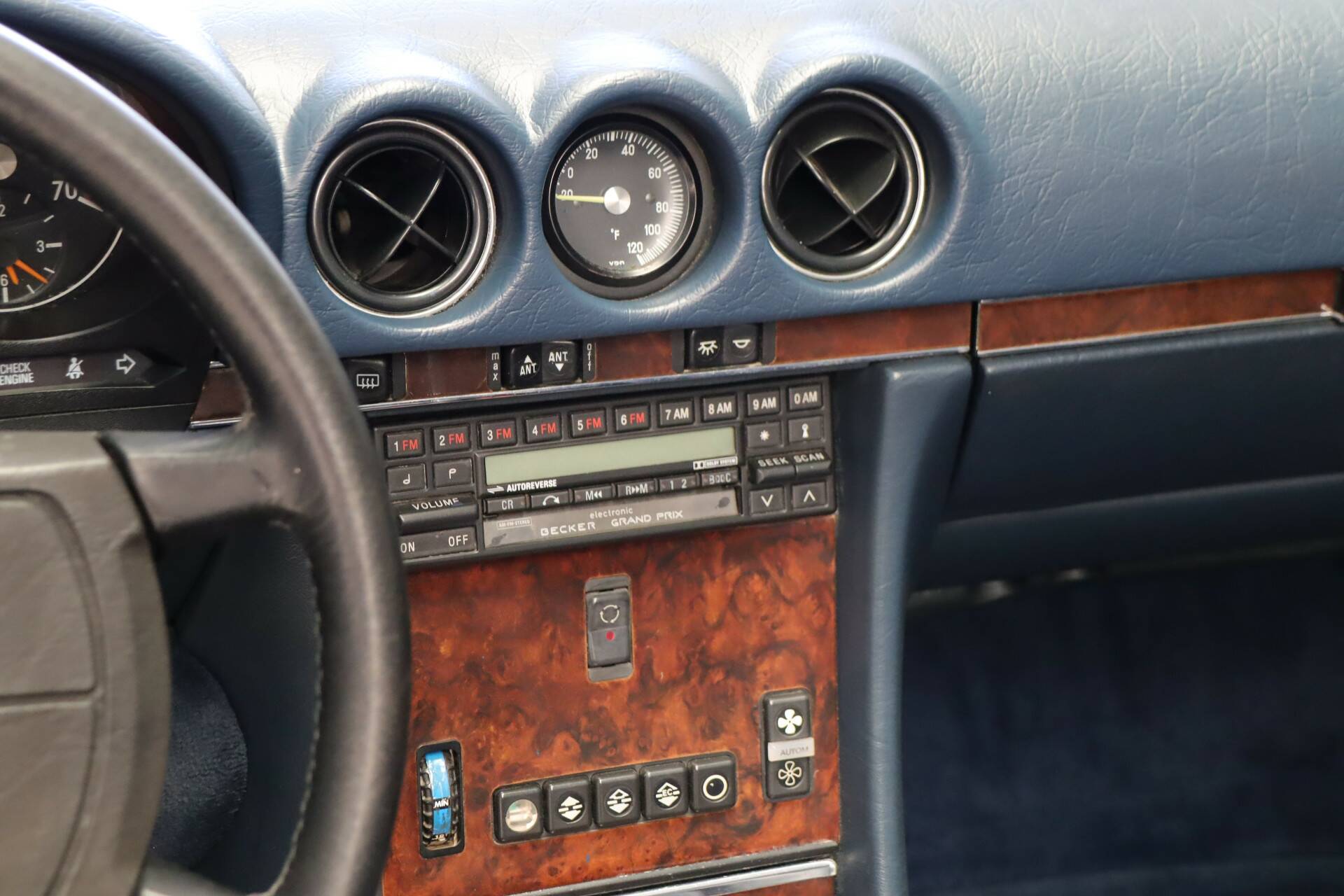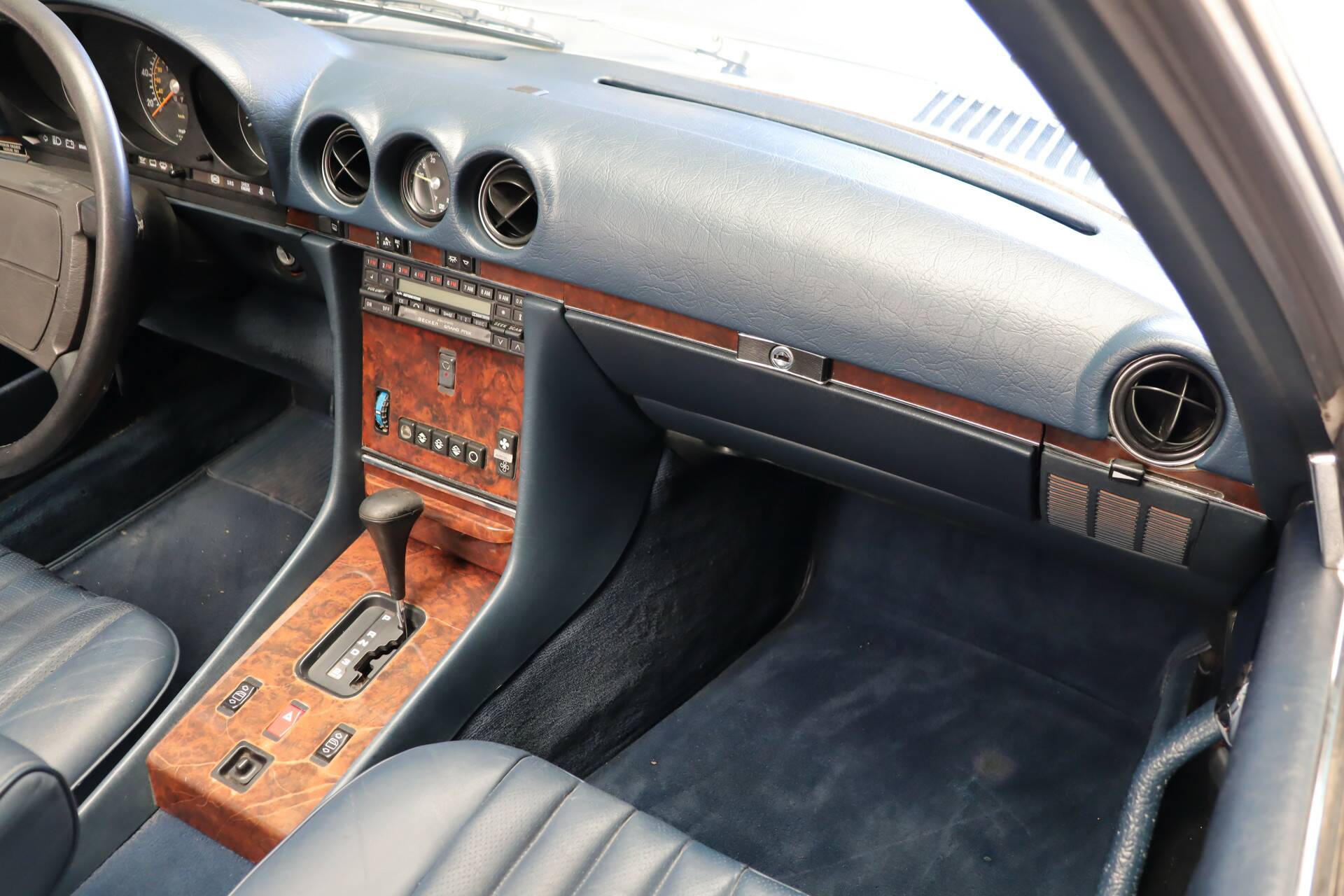 Das Interieur ist wunderschön in einem stilvollen Blau mit Intarsien aus Holz gehalten. Neben der Lederausstattung ist der Rest des Innenraums mit blauem Velours und einem weißen Dachhimmel ausgekleidet. Zu den Komfortoptionen gehören elektrische Fensterheber und Spiegel, Mittelarmlehne, Heckscheibenheizung, Klimaautomatik und das originale Becker Grand Prix Radio. Das Leder ist frei von Rissen und auch der Rest ist in einem ordentlichen Zustand. Das Auto ist ein vielseitiges Fahrzeug, das sich dank seines hohen Komforts gut für Touren und Urlaubsreisen eignet. Aber auch sportliche Fahrer kommen auf ihre Kosten, denn mit 204 PS und hervorragenden Fahreigenschaften ist das Auto flott und wendig. Viele Menschen wissen nicht, dass der C107 (Coupé) eine erfolgreiche Rennkarriere hatte. Kurz gesagt, ein zeitloses Schmuckstück in außergewöhnlichem Zustand, das jede Sammlung oder jeden Autoliebhaber bereichert.