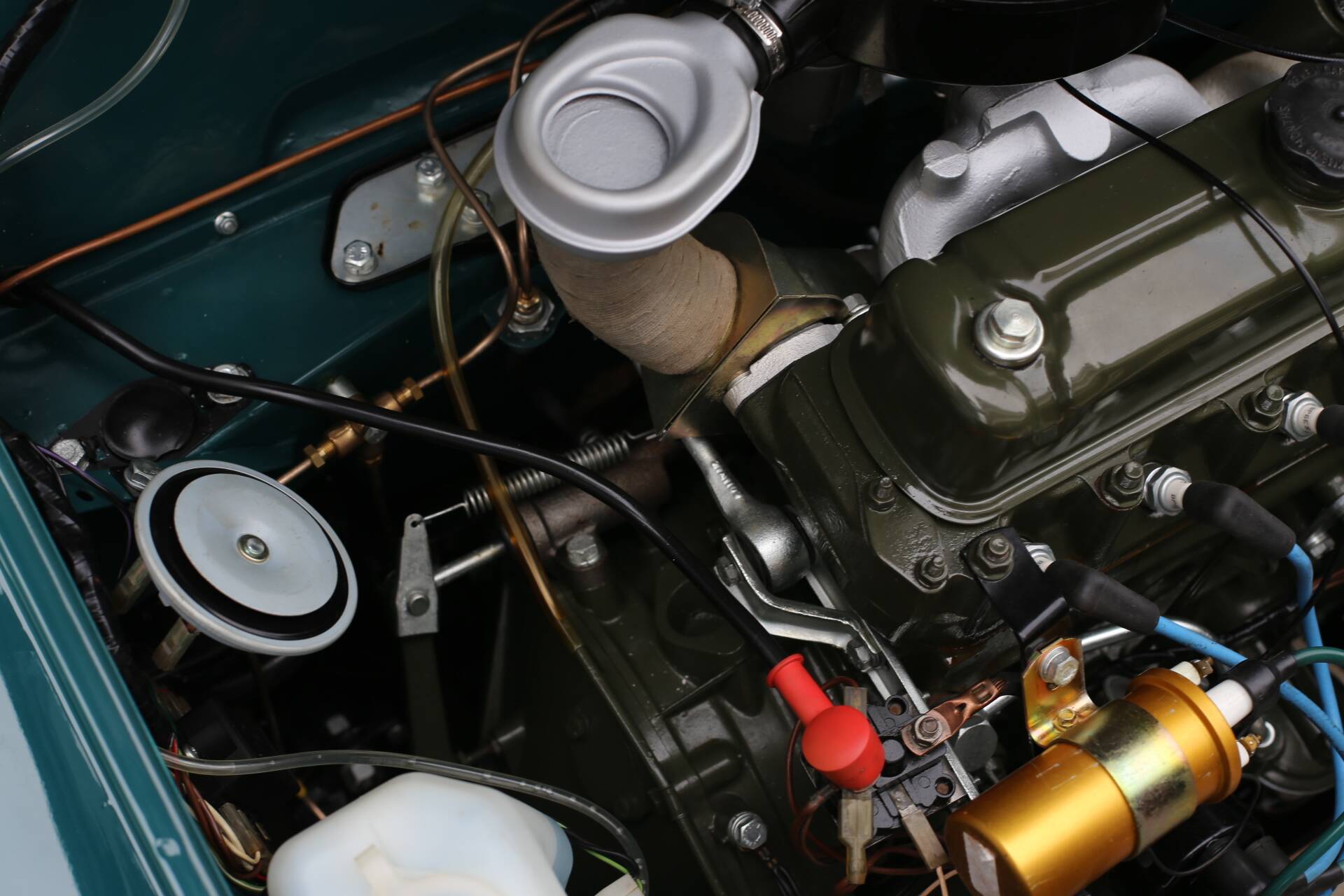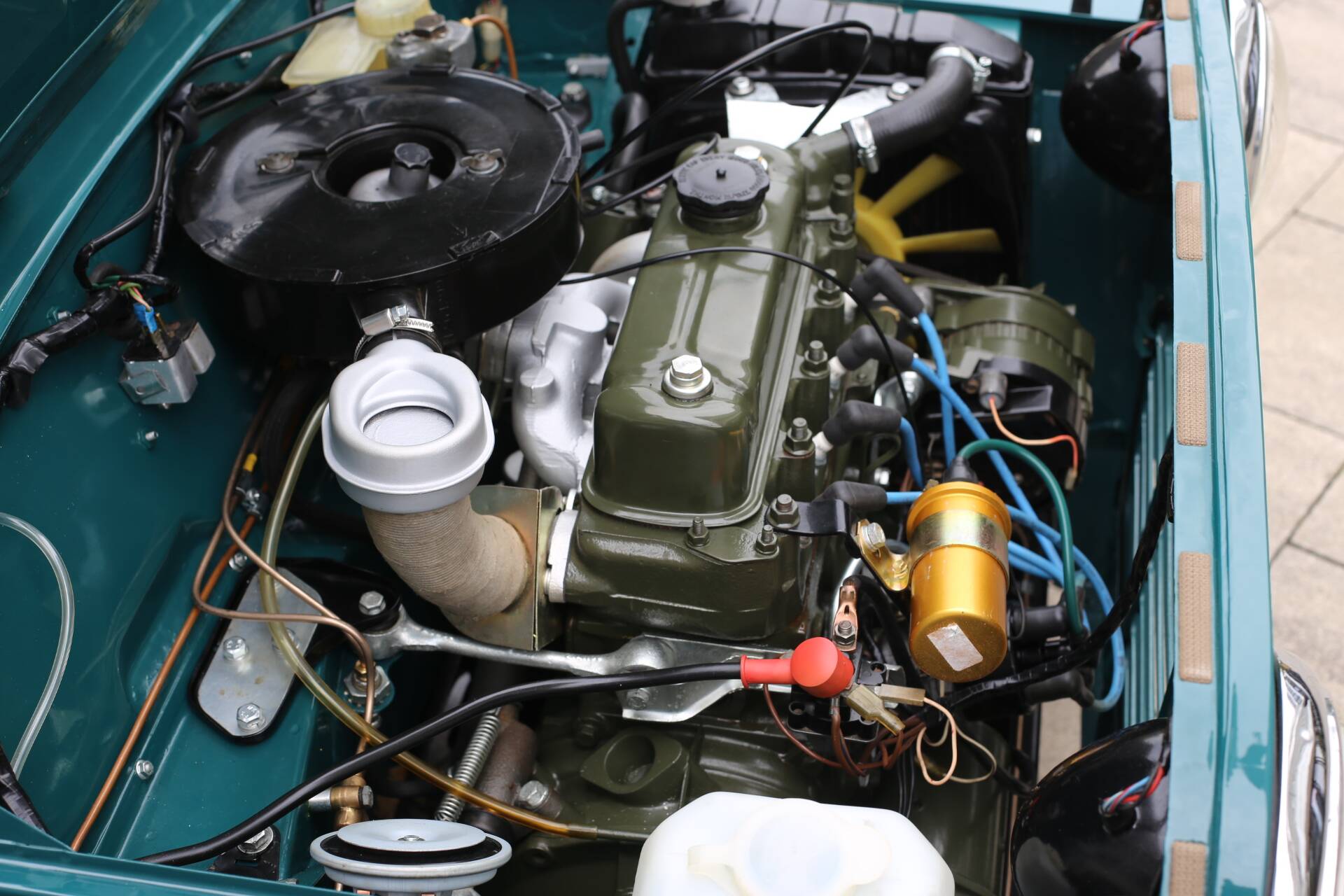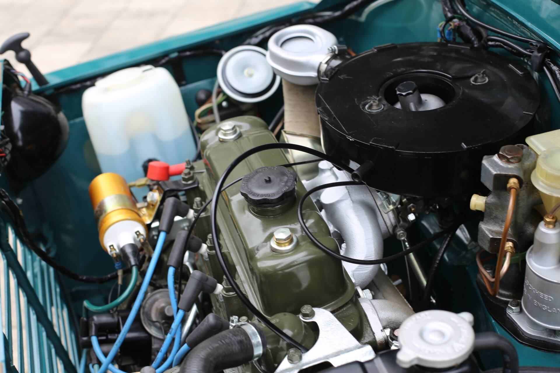 · Originalmotor und Getriebe in hervorragendem Zustand, frisch lackiert im legendären BMC „Engine Green“ – die Werkskompression ist ausgezeichnet (siehe Bild).