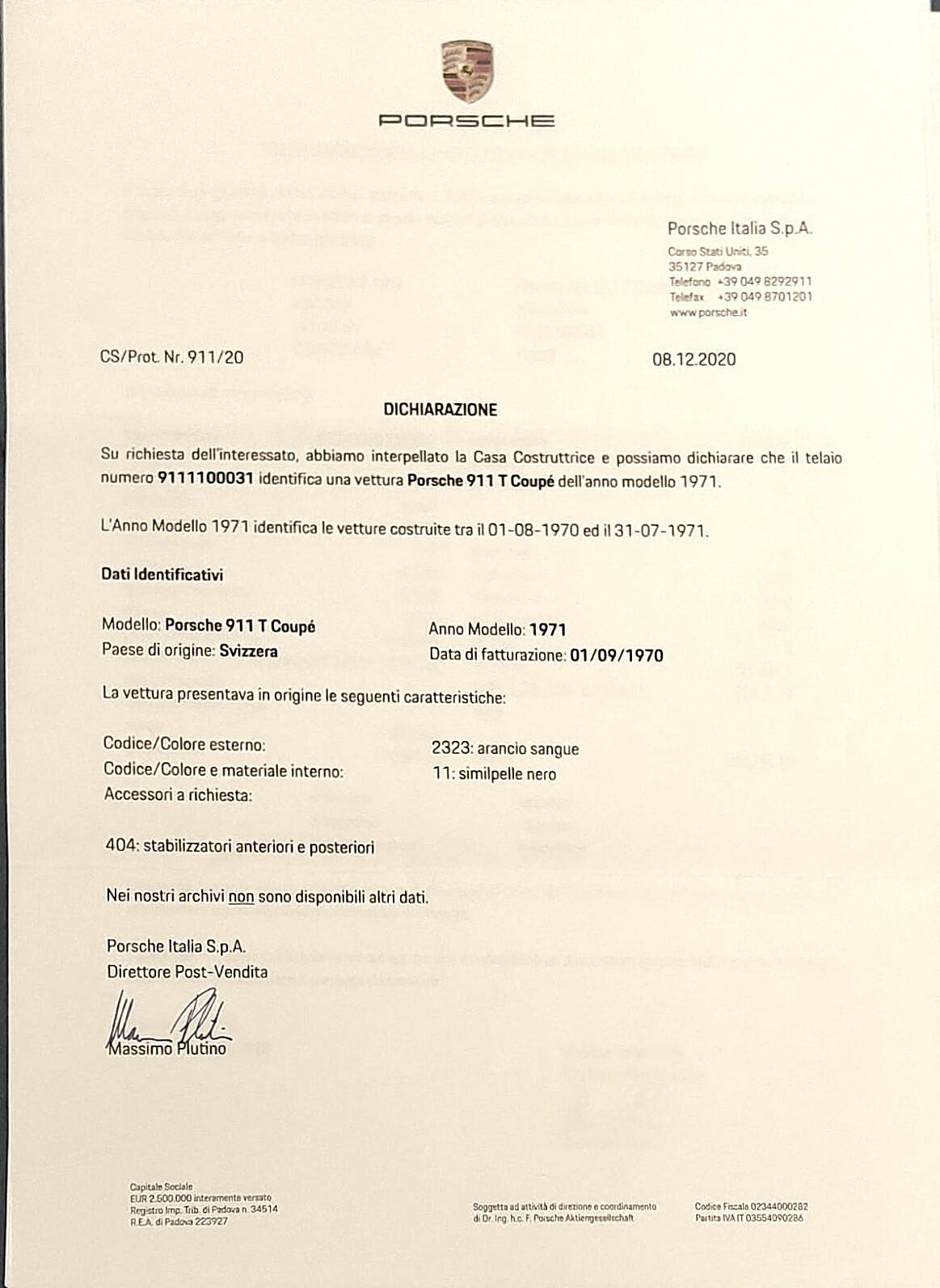 This 1970 Porsche 911 2.2 T Coupé, corresponding to the 1971 Model Year, is a highly collectible example, as confirmed by its Porsche Certificate of Origin issued on 8 December 2020. The certificate places the car within the official production range from 1 August 1970 to 31 July 1971.