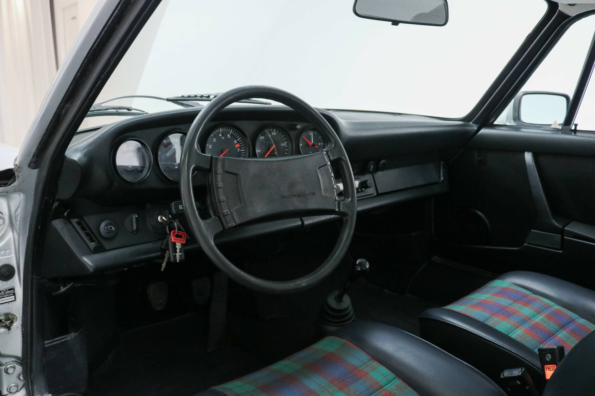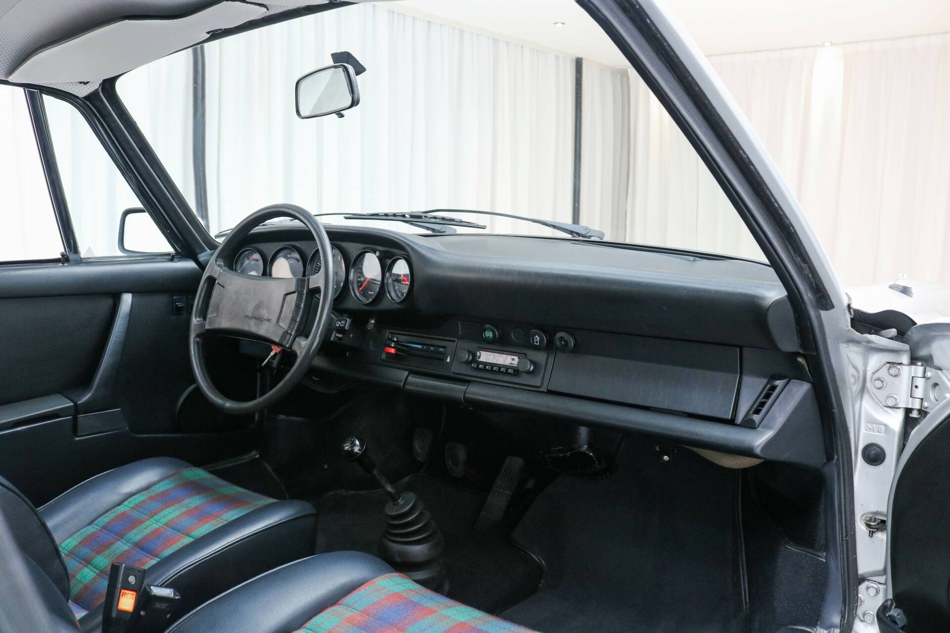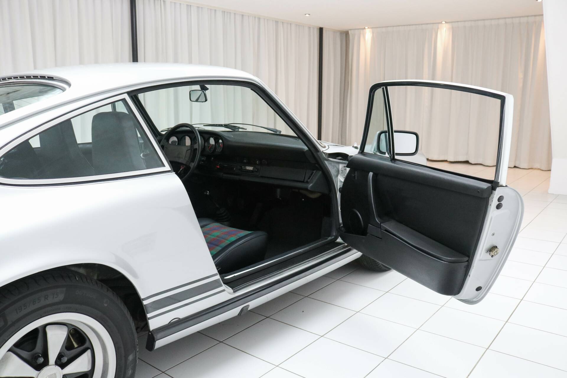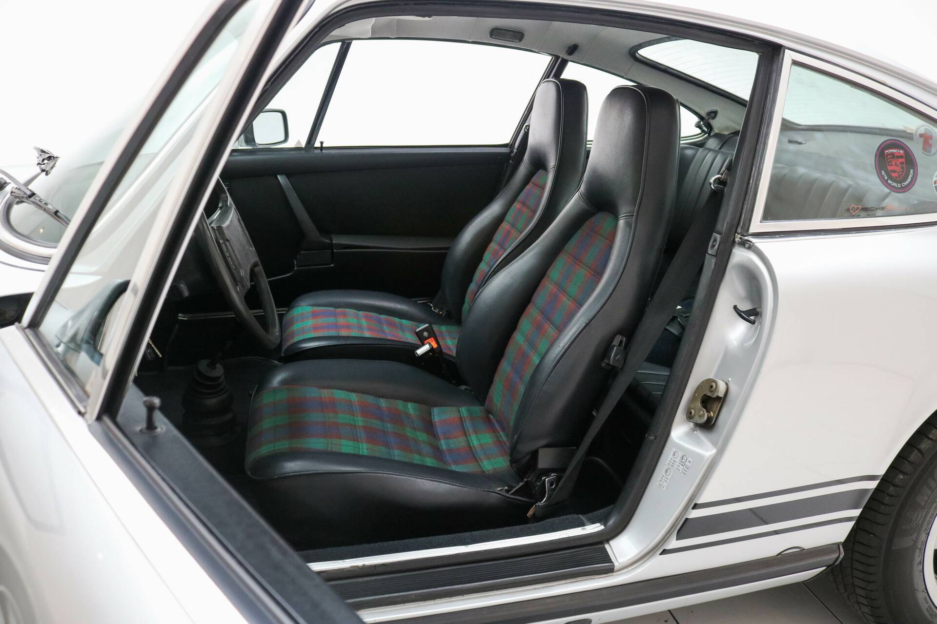 Das Interieur ist in schwarzem Vinyl mit werkseitiger Schottenkaro Grün Polsterung ausgeführt – eine Option, die nur auf Sonderbestellung erhältlich war. Diese seltene Ausführung macht dieses Exemplar besonders; von den 1.888 gebauten 911 2.7 Coupés 1976 wurden nur sehr wenige mit dieser Innenausstattung geliefert. Außerdem verfügt das Fahrzeug über elektrisch betriebene Fenster, eine Luxusausstattung zu dieser Zeit, die Exklusivität und Sammlerwert unterstreicht.