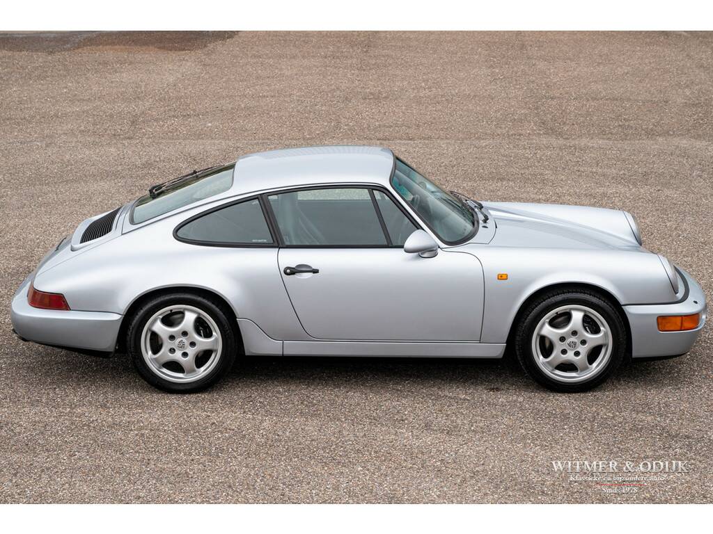 Ze willen het niet weten maar ook Porsche liefhebbers worden iedere dag ouder. Dat was tien jaar terug natuurlijk ook al zo. Toch is er een voor ons sterk merkbare ontwikkeling gaande, de meeste liefhebbers van nu groeide op met stuurbekrachtiging, veiligheidsvoorzieningen en bijvoorbeeld airco in de auto. Dus vindt men de spartaans rijdende klassieker minder interessant. Tegelijkertijd ontwikkelde ze een grote sympathie voor de luchtgekoelde Porsche, geen motor klinkt immers zoals een boxermotor en roept de daarbij behorende emotie op. Juist omdat de 964 nog wel grotendeels de iconische lijnen van het origineel volgt, nieuw meestal onbereikbaar was én voorzien is van de eerder genoemde voorzieningen is dit type een rijzende ster onder 911 fans. De naar hedendaagse begrippen zeer bescheiden productieaantallen en de grote vraag maken het daarom zeer gezochte auto's. Een zuiver en mooi exemplaar vinden is zeker met een lage kilometerstand dan ook geen eenvoudige opgave. Een klein vreugdesprongetje maakte ik dan ook na de vondst en aankoop van deze 964 Carrera 4. Een keurig exemplaar zoals de kenner haar wenst; schadevrij, grotendeels in de eerste lak, origineel en compleet met de onderhoudshistorie. Afkomstig van een arts die de auto meer dan twintig jaar in bezit had en er de laatste jaren niet veel meer mee reed. De voorklep heeft nog de eerste lak en laat nauwelijks steenslag zien, dat zegt iets over rustig en zorgvuldig gebruik. Kijk ook eens naar de foto's van het bijzonder fraaie interieur. De auto is uitgeleverd op 10 december 1993 dus een van de laatst geproduceerde, origineel voorzien van de Cupvelgen en spiegels. De motor van de 964 werd in 1991 door Porsche gemodificeerd waardoor de latere exemplaren minder last hebben van de bij boxermotoren vaak voorkomende olielekkage. Deze 964 is optioneel voorzien van climat control, volledig elektrisch verstelbare stoelen, een ruitenwisser achter, twee airbags en een modernere muziekinstallatie. De carrosserie heeft geen vermeldenswaardige gebruikssporen, het interieur en vooral het leer lijkt als nieuw, de velgen zijn onbeschadigd en de bumpers hebben geen kras. Bij auto aanwezig is de originele boordmap met instructie- en serviceboekjes. Iedere door de fabriek aangebrachte sticker kleeft nog in de auto. Een inmiddels klassieke Porsche, zonder de nadelen ervan, dat is de Porsche 964. Gebruik de volgende link voor meer foto's; https://witmerodijk.nl/te-koop/porsche-964-carrera-4-coupe-'93-1/2574