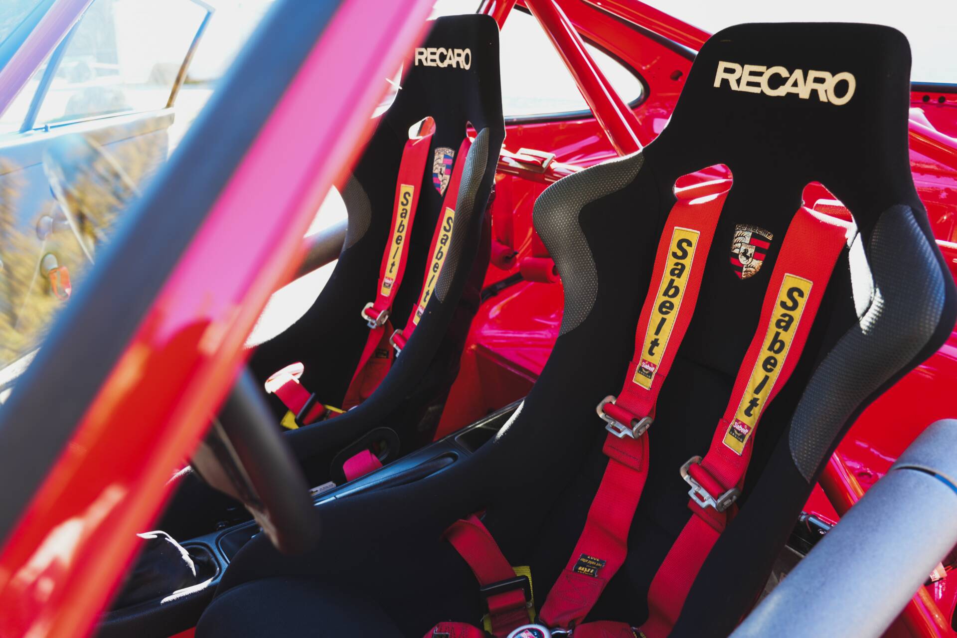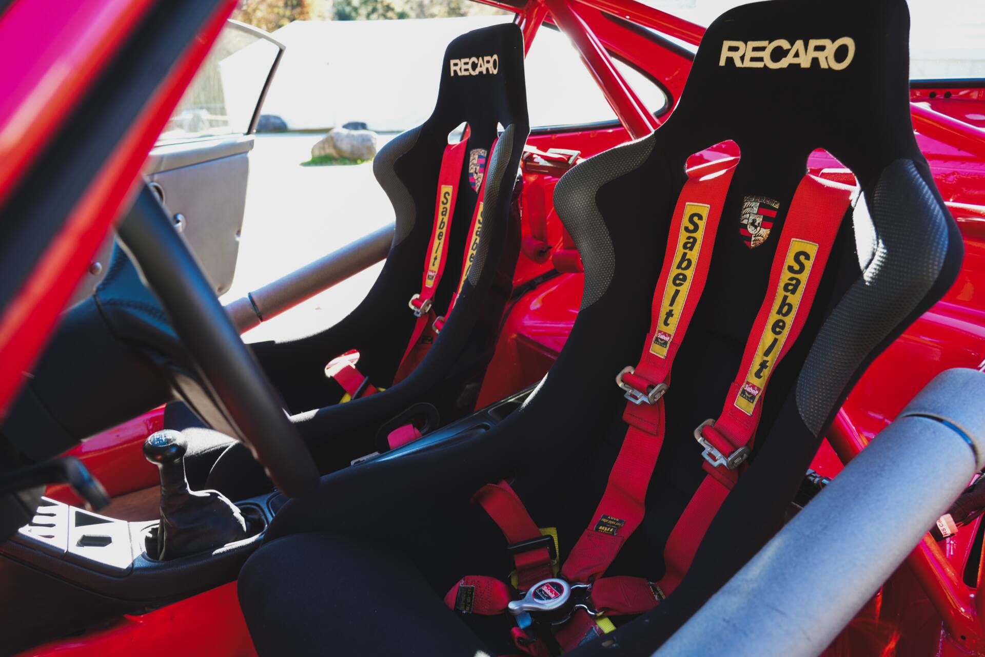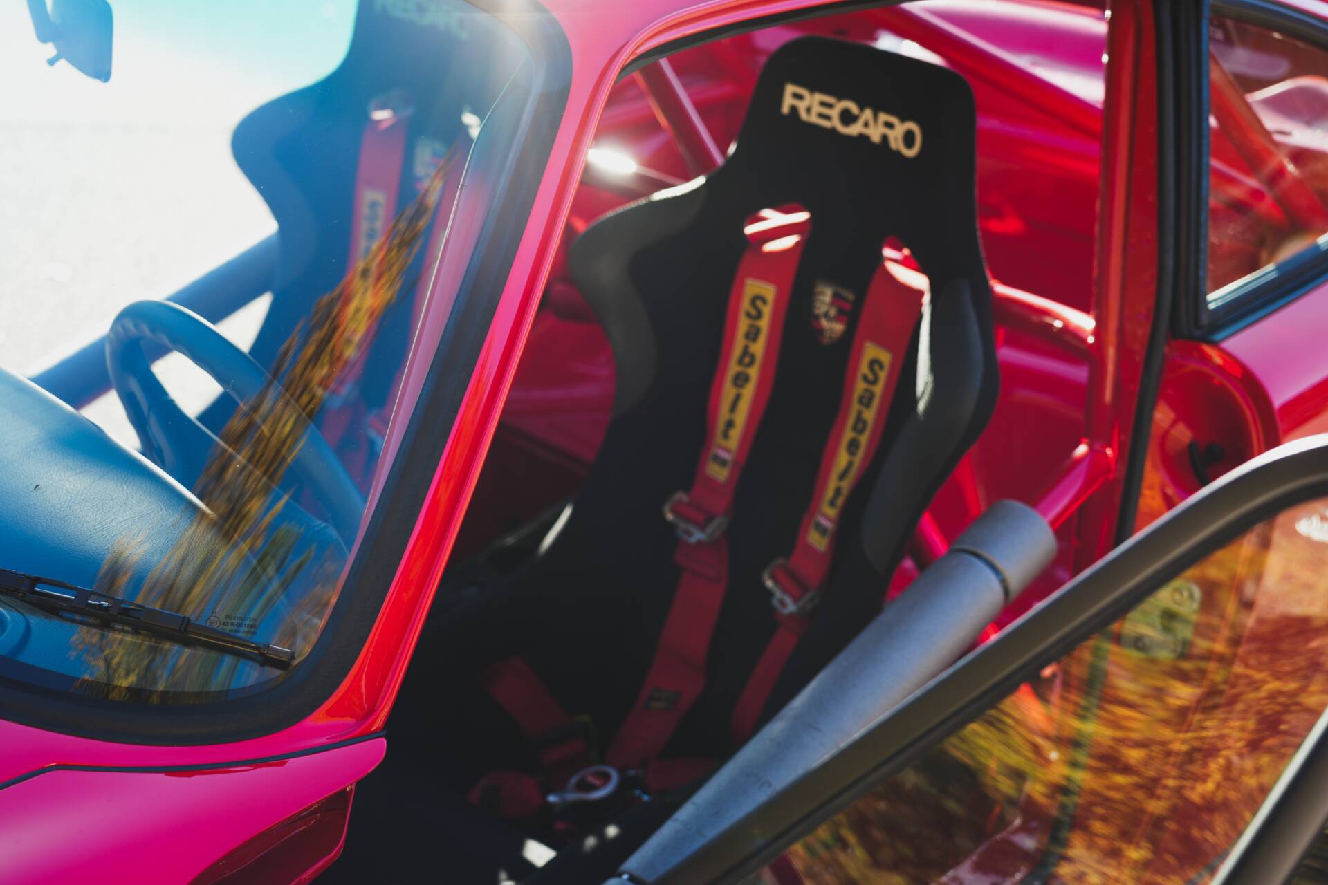 Der N/GT ist ein echter Rennwagen mit Strassenzulassung: Leichtbau, kein Komfort, dafür absolute Präzision. Der Innenraum ist auf das Wesentliche reduziert – Recaro-Vollschalensitze, Überrollkäfig, 6-Punkt-Gurte, Feuerlöscher und Batterie-Hauptschalter sind serienmässig. Das straffe Fahrwerk, die grosse Bremsanlage vom 964 Turbo und das Gewicht von nur rund 1.220 Kilogramm sorgen für ein unmittelbares, unverfälschtes Fahrerlebnis.