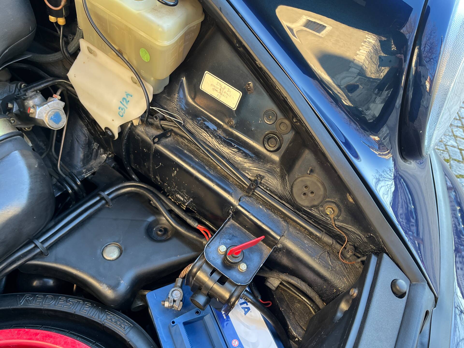 • Lackierung : Die Lackierung wurde laut dem Besitzer vor dem Kauf komplett und hochwertig erneuert. Die gemessene Lackstärke beträgt überwiegend 350 - 500 mü auf den beiden vorderen Kotflügeln rechts 130 mü und links ca. 200 mü.