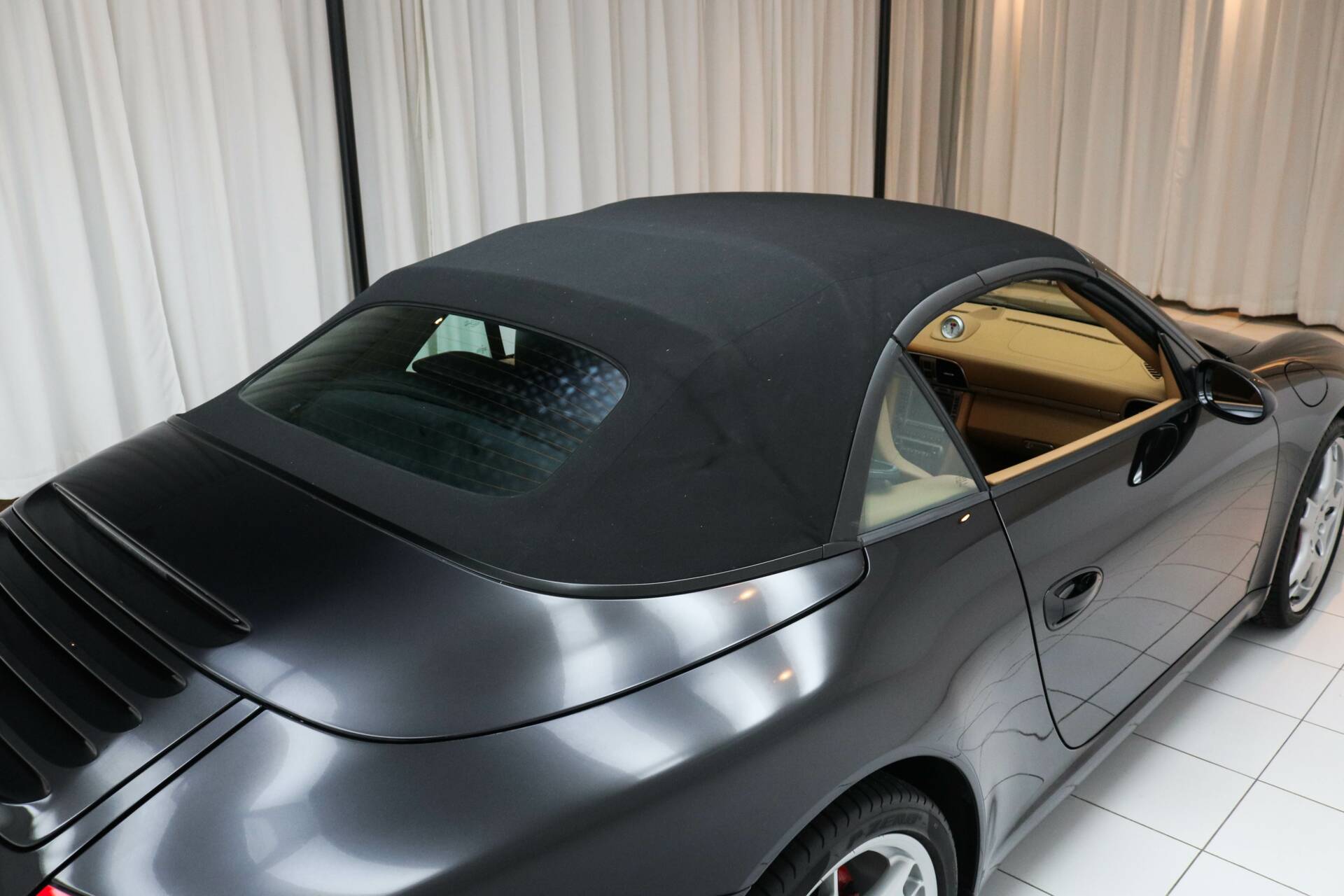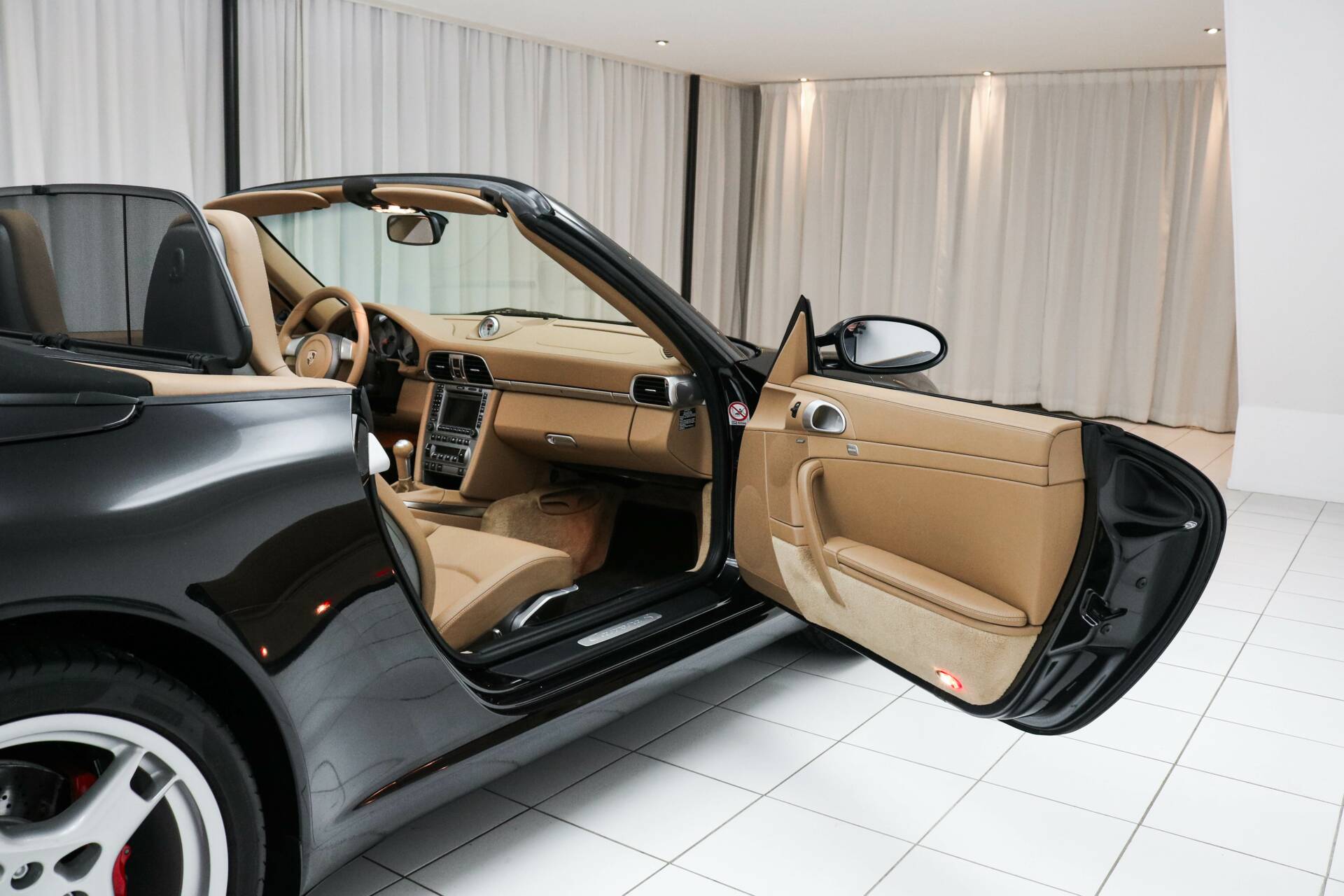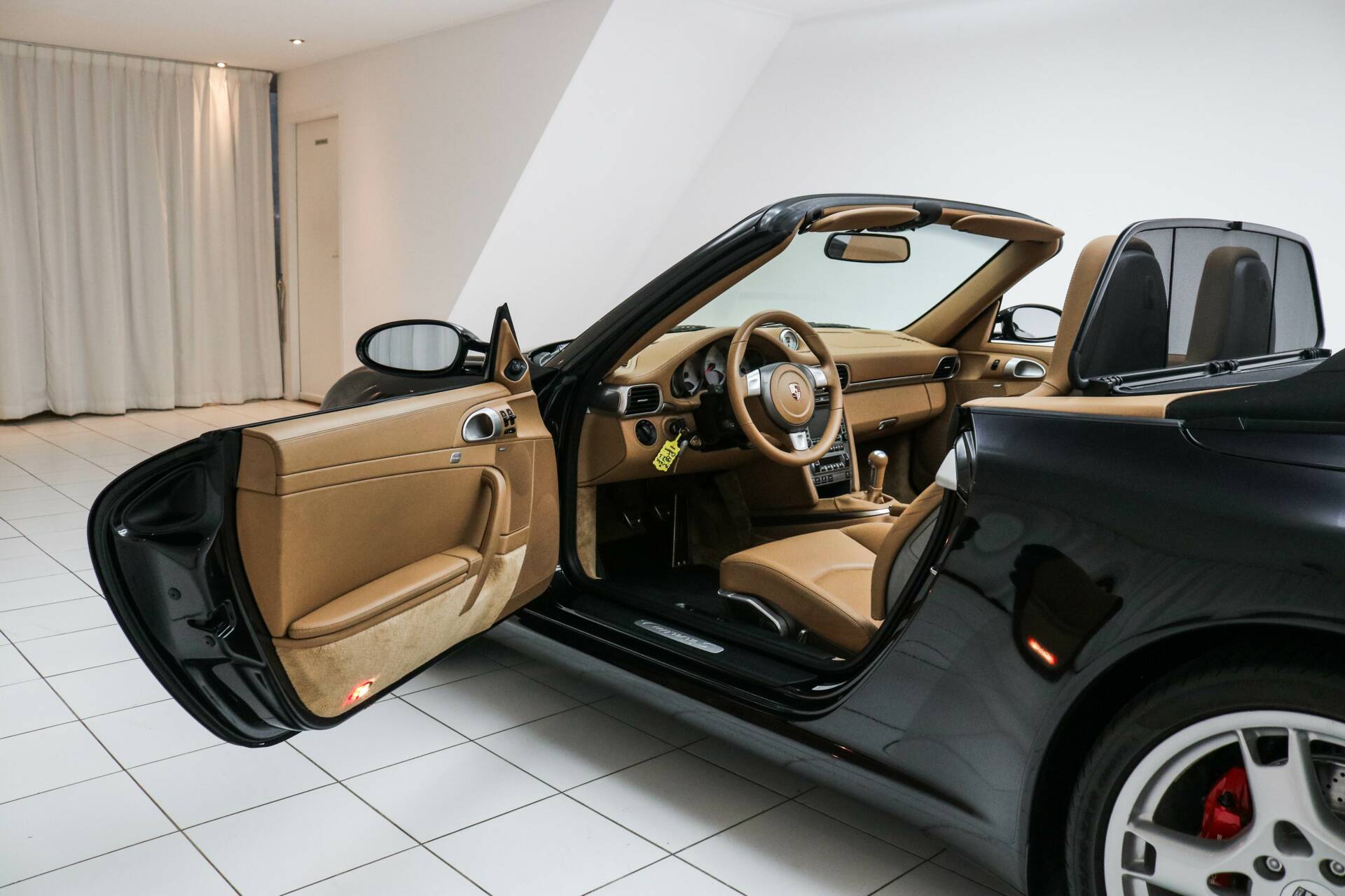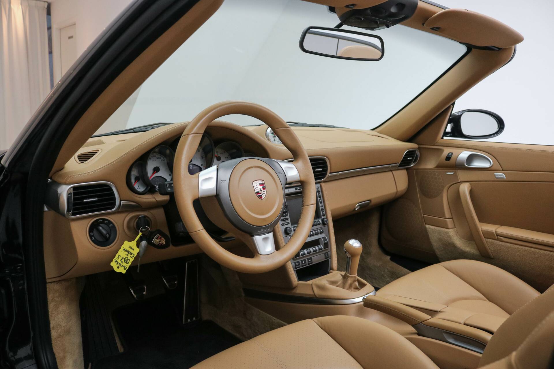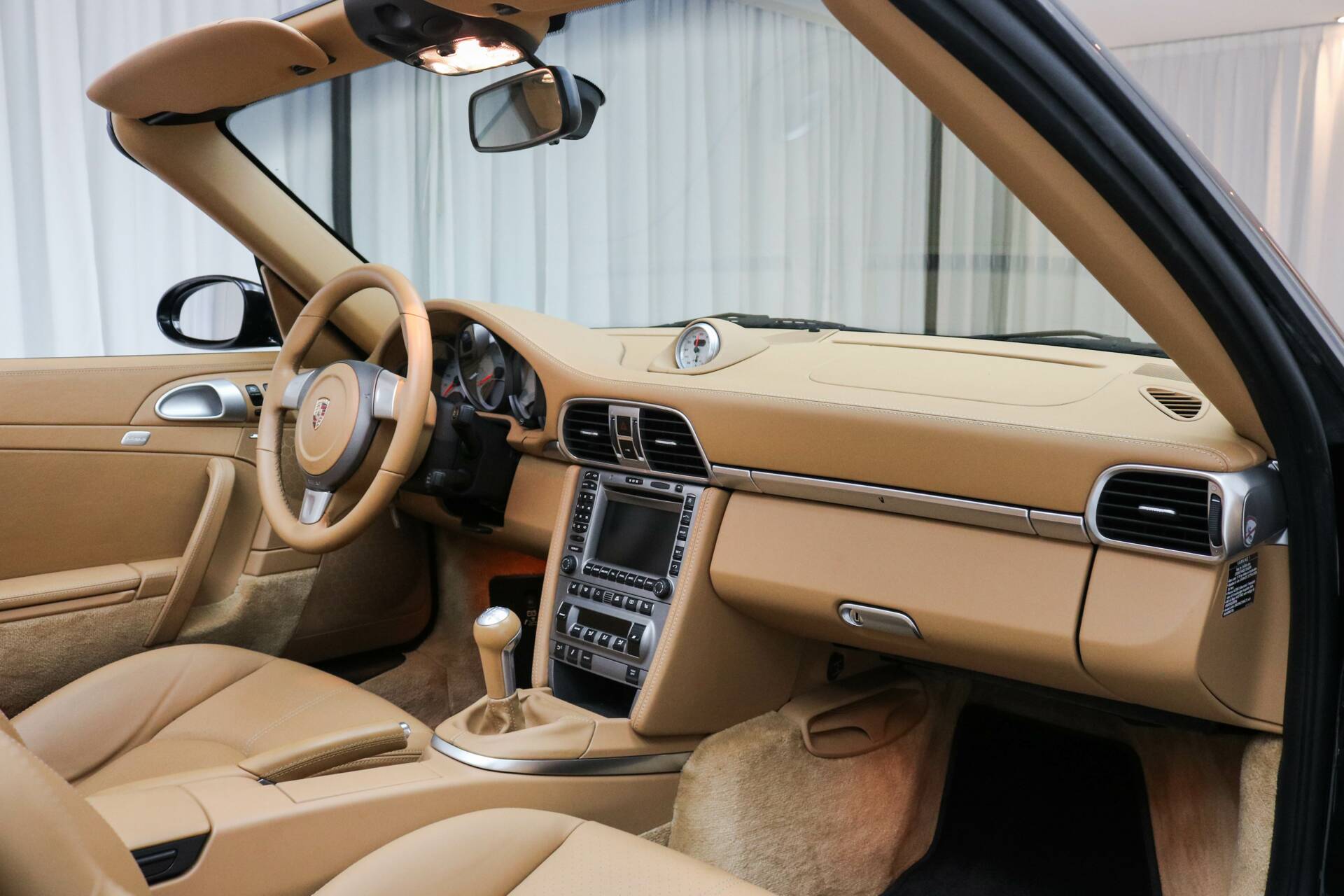 Das Interieur ist in hellbraunem Leder ausgeführt, ein wunderschöner Kontrast zum schwarzen Exterieur. Die Kopfstützen sind mit dem Porsche-Wappen versehen. Das Fahrzeug verfügt über das Chrono-Paket, Tempomat und alle originalen Details, die den Charakter des 997.1 unterstreichen. Weitere Ausstattung: elektrisch verstellbare Sitze, Navigationssystem, elektrische Fenster und Spiegel, elektrisch bedienbares Cabrio-Verdeck sowie Sitzheizung.