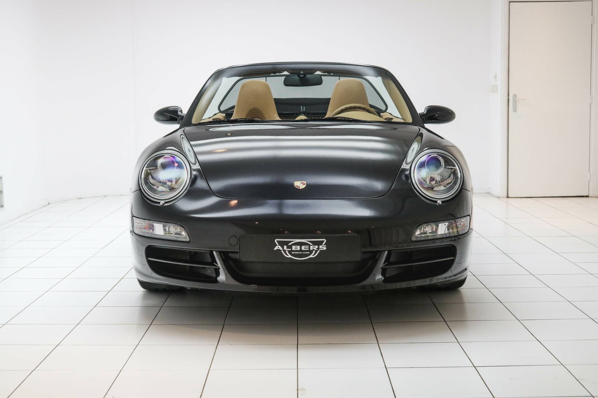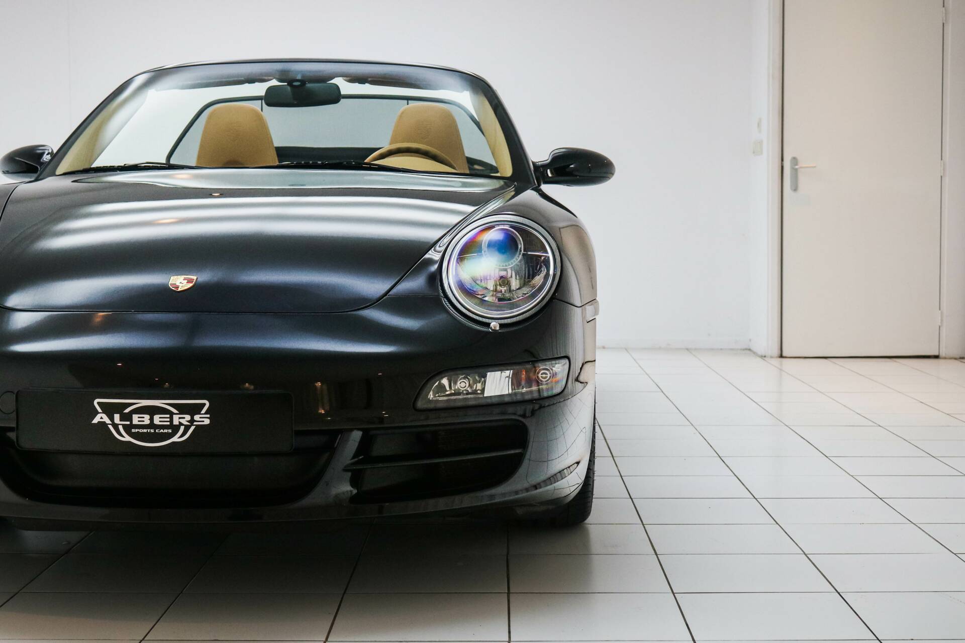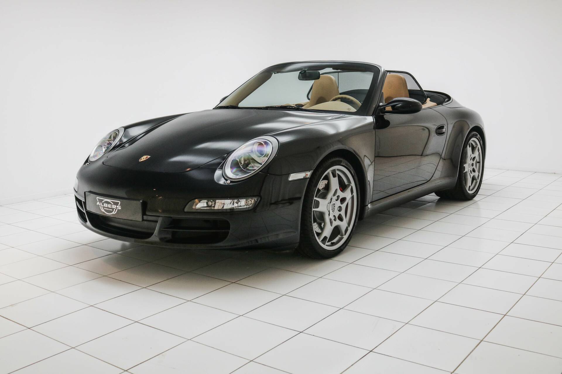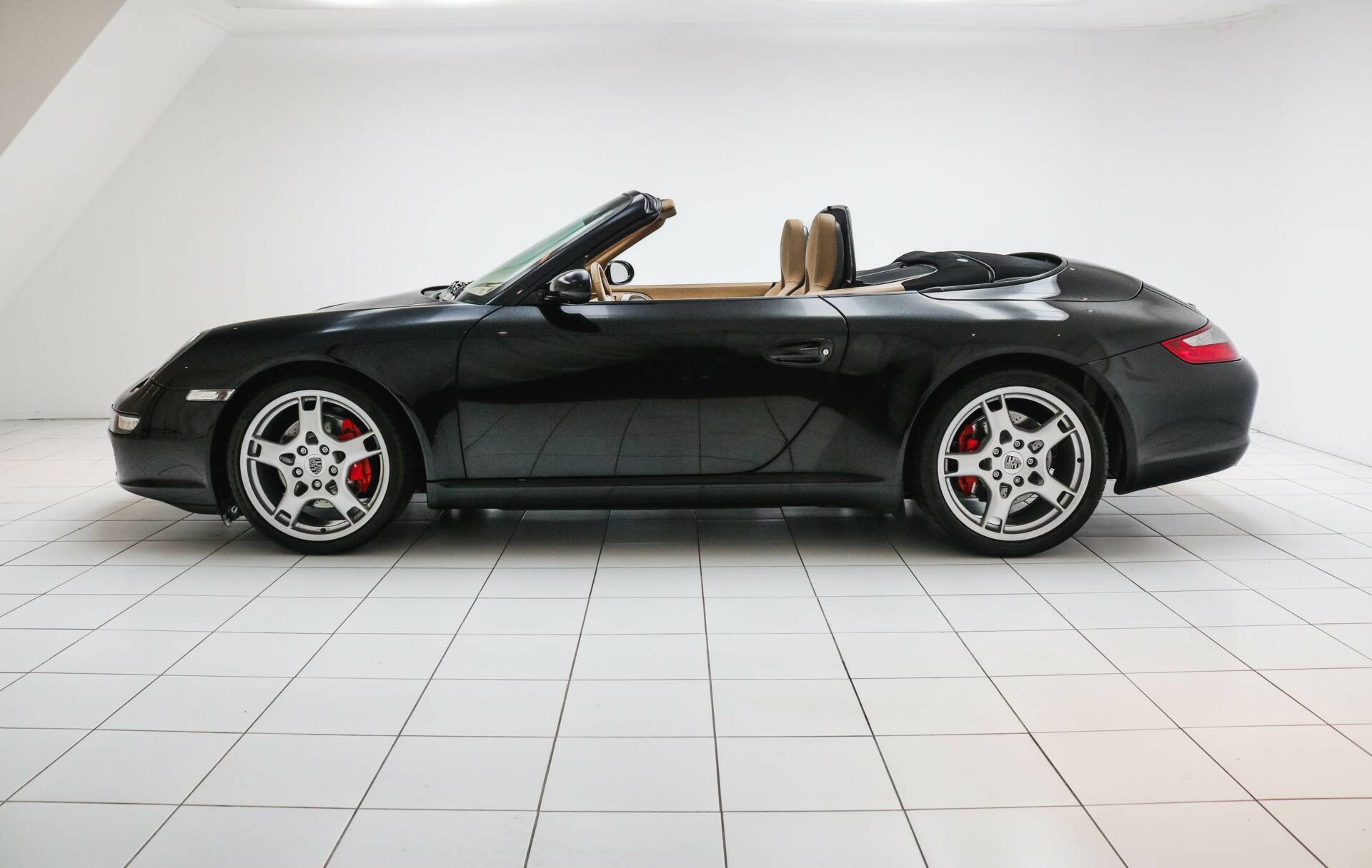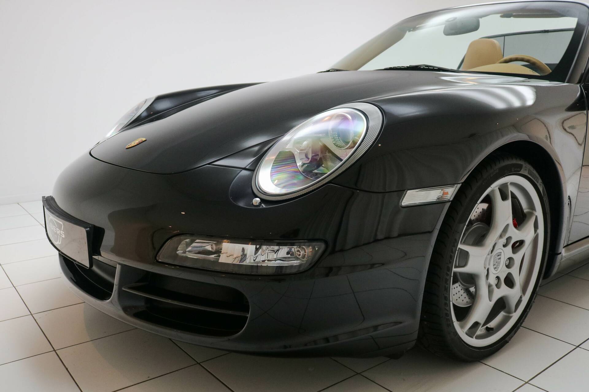 Das Interieur ist in hellbraunem Leder ausgeführt, ein wunderschöner Kontrast zum schwarzen Exterieur. Die Kopfstützen sind mit dem Porsche-Wappen versehen. Das Fahrzeug verfügt über das Chrono-Paket, Tempomat und alle originalen Details, die den Charakter des 997.1 unterstreichen. Weitere Ausstattung: elektrisch verstellbare Sitze, Navigationssystem, elektrische Fenster und Spiegel, elektrisch bedienbares Cabrio-Verdeck sowie Sitzheizung.