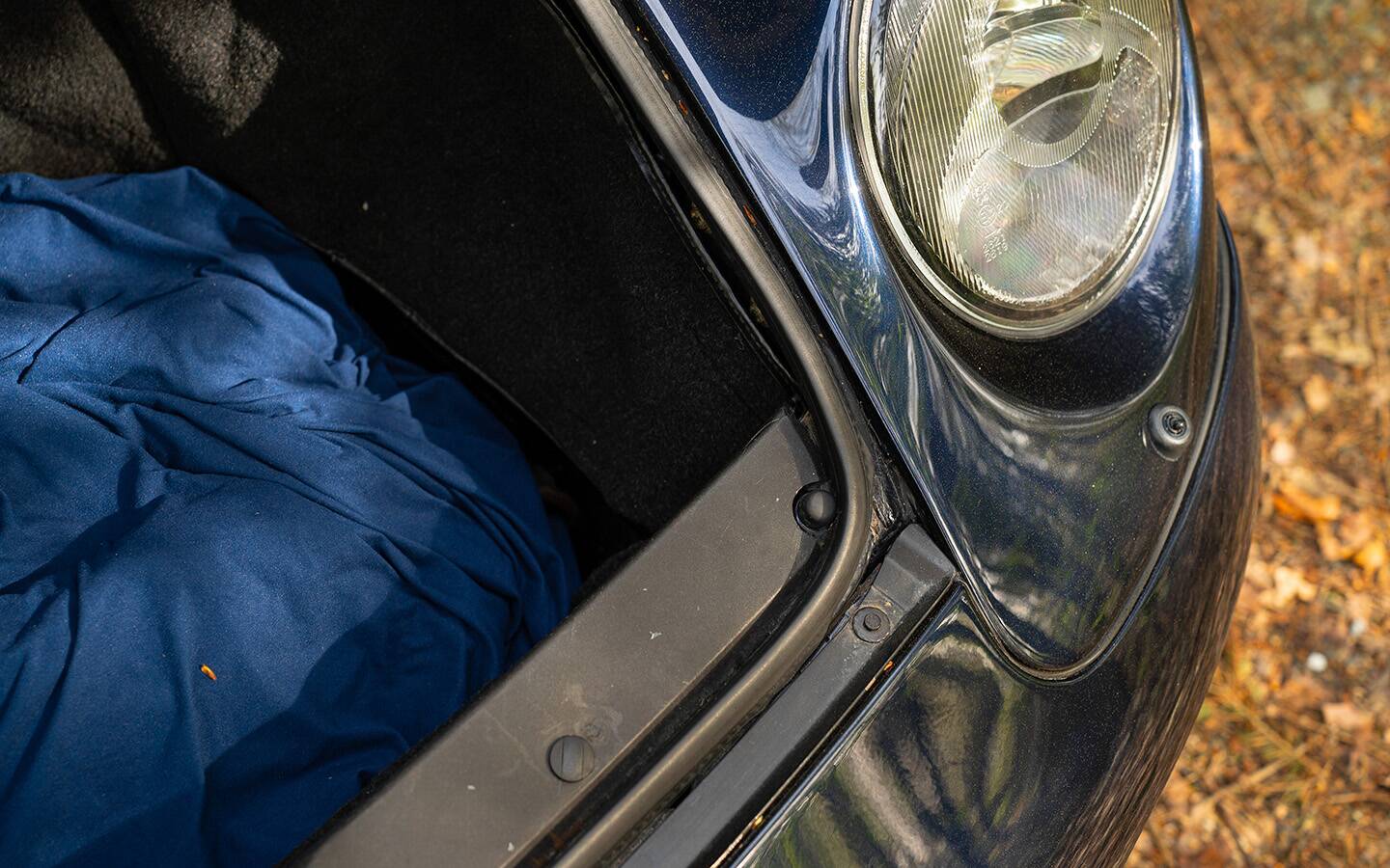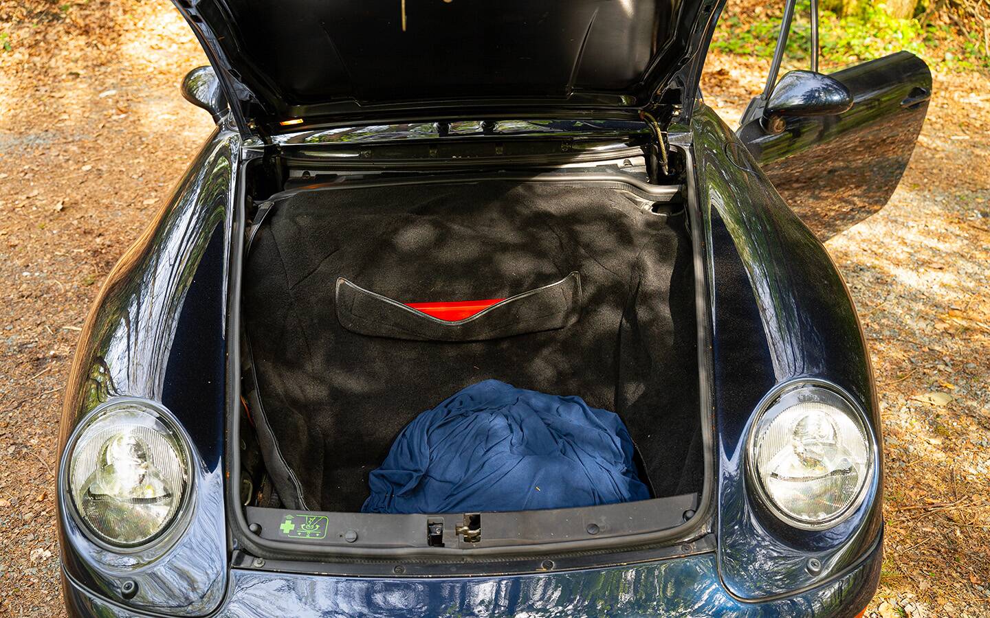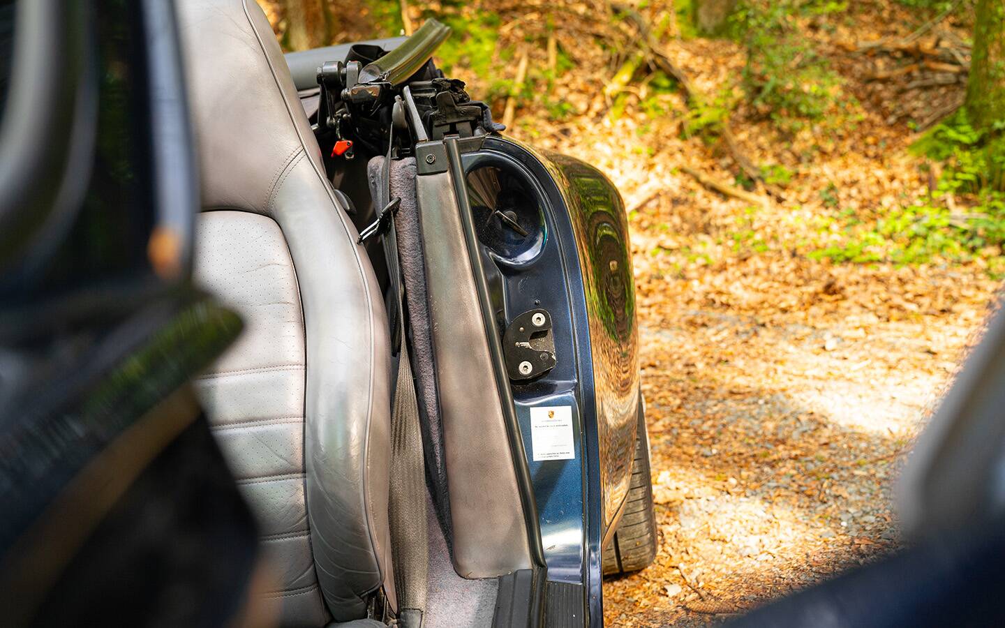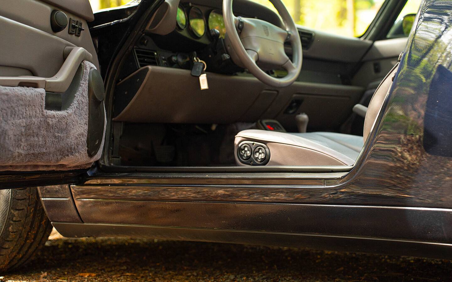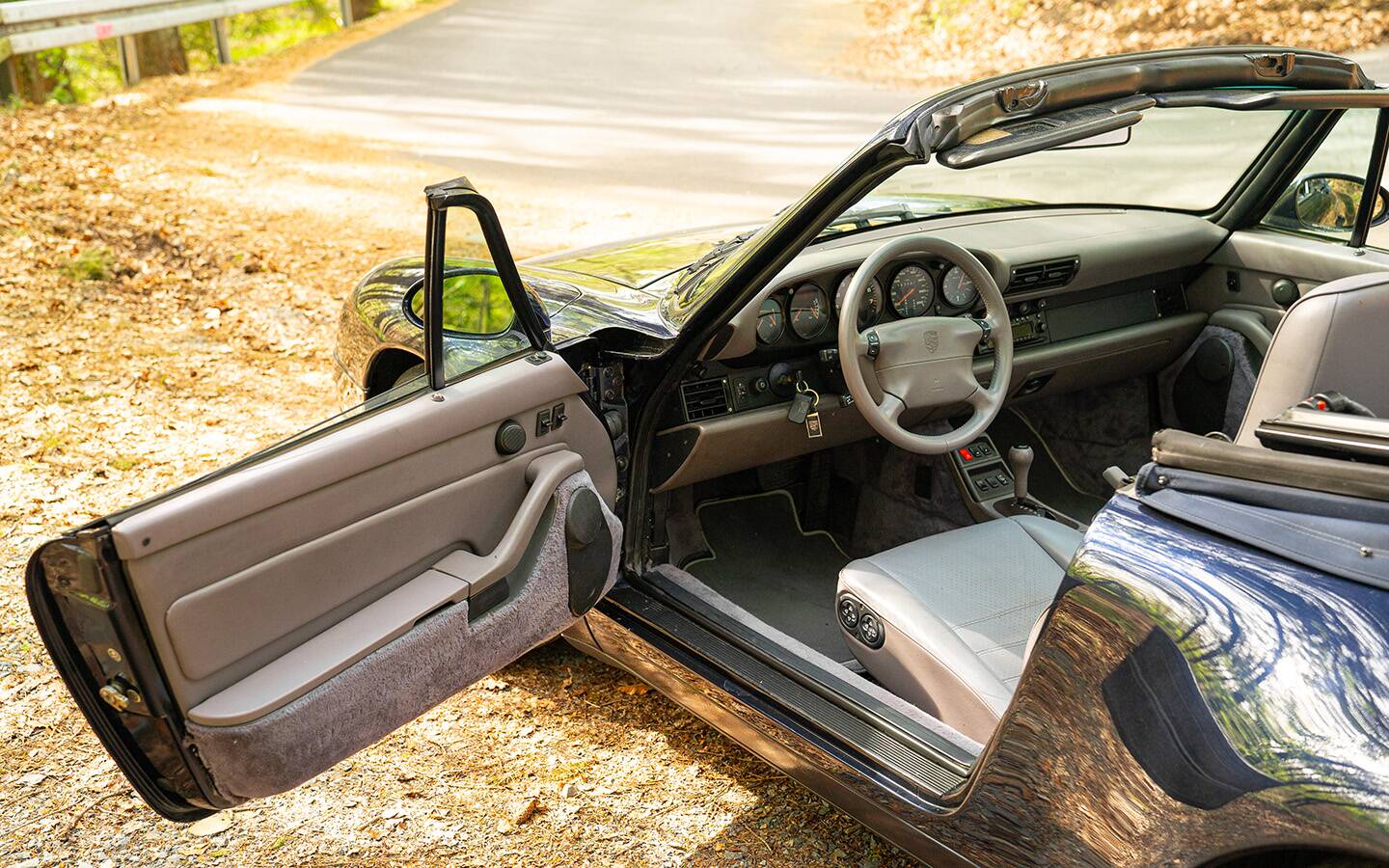 Das Fahrzeug präsentiert sich in der eleganten Farbe Midnight Blue mit grauer Lederausstattung im Innenraum – eine sehr stimmige und zeitlose Kombination, die die Linien des 993 besonders schön zur Geltung bringt.