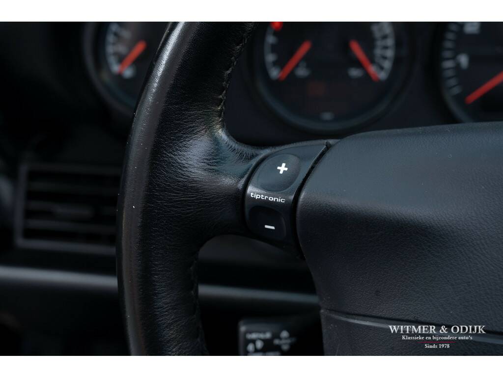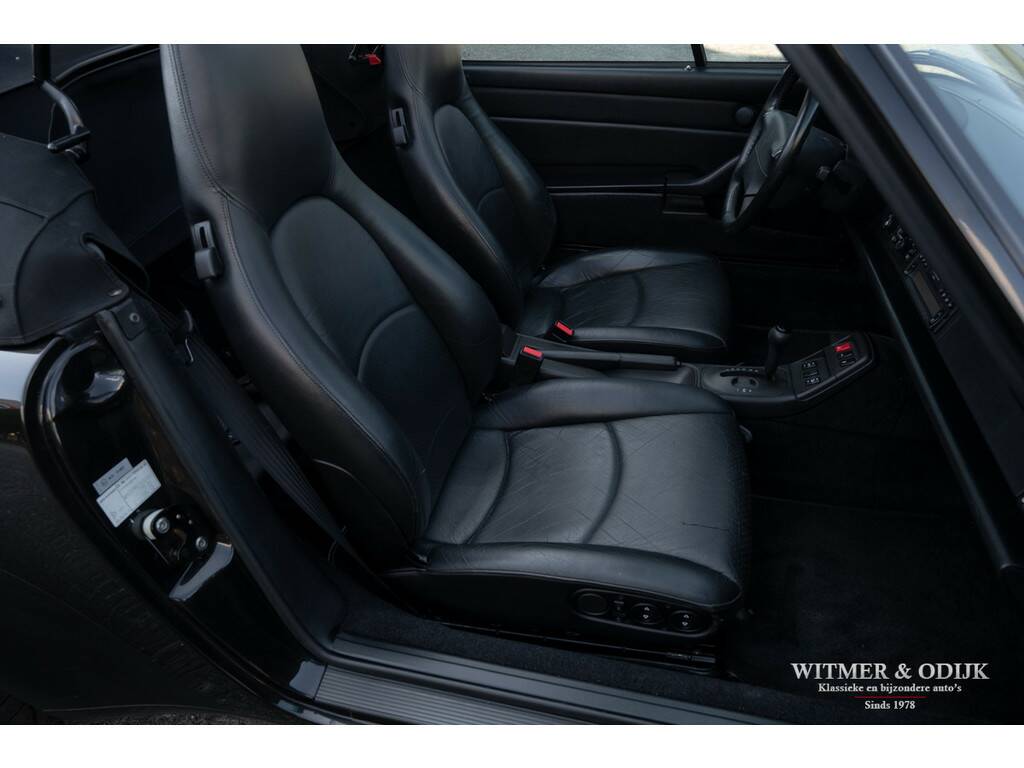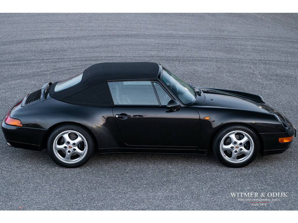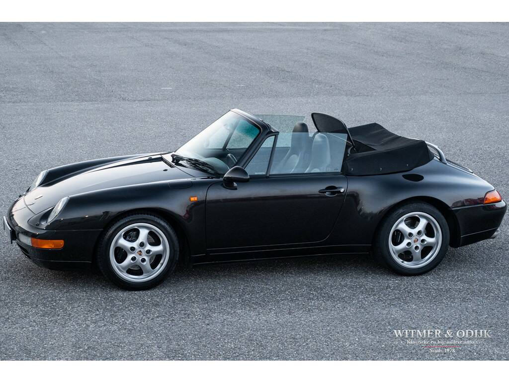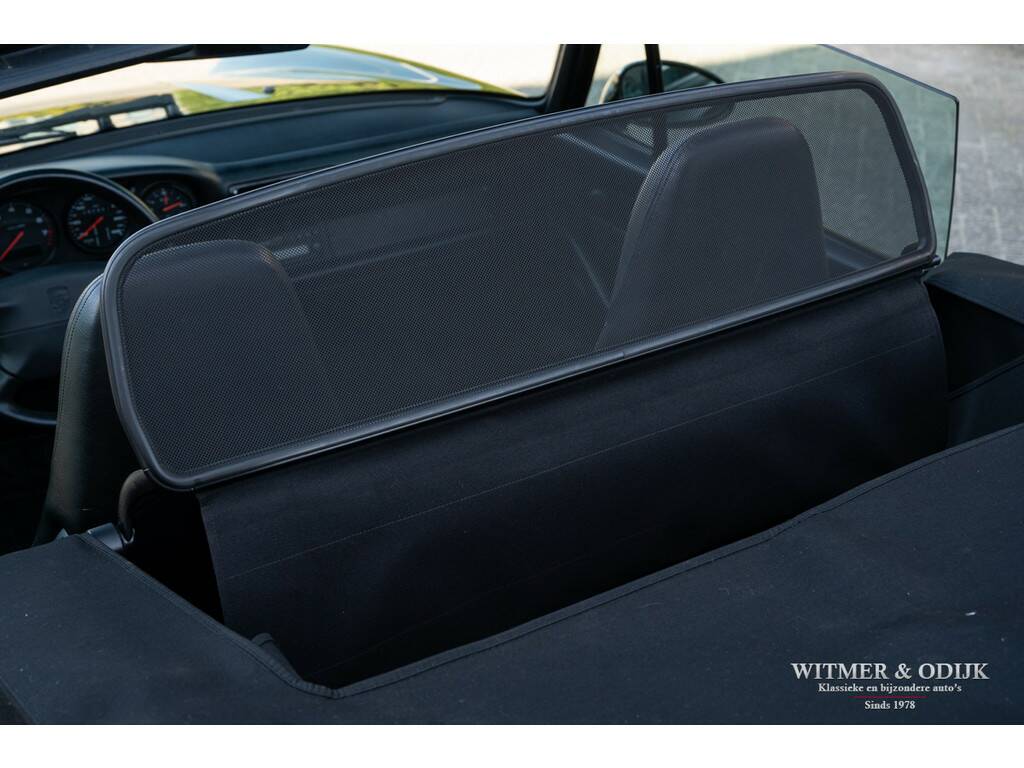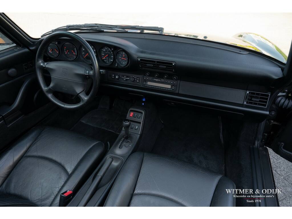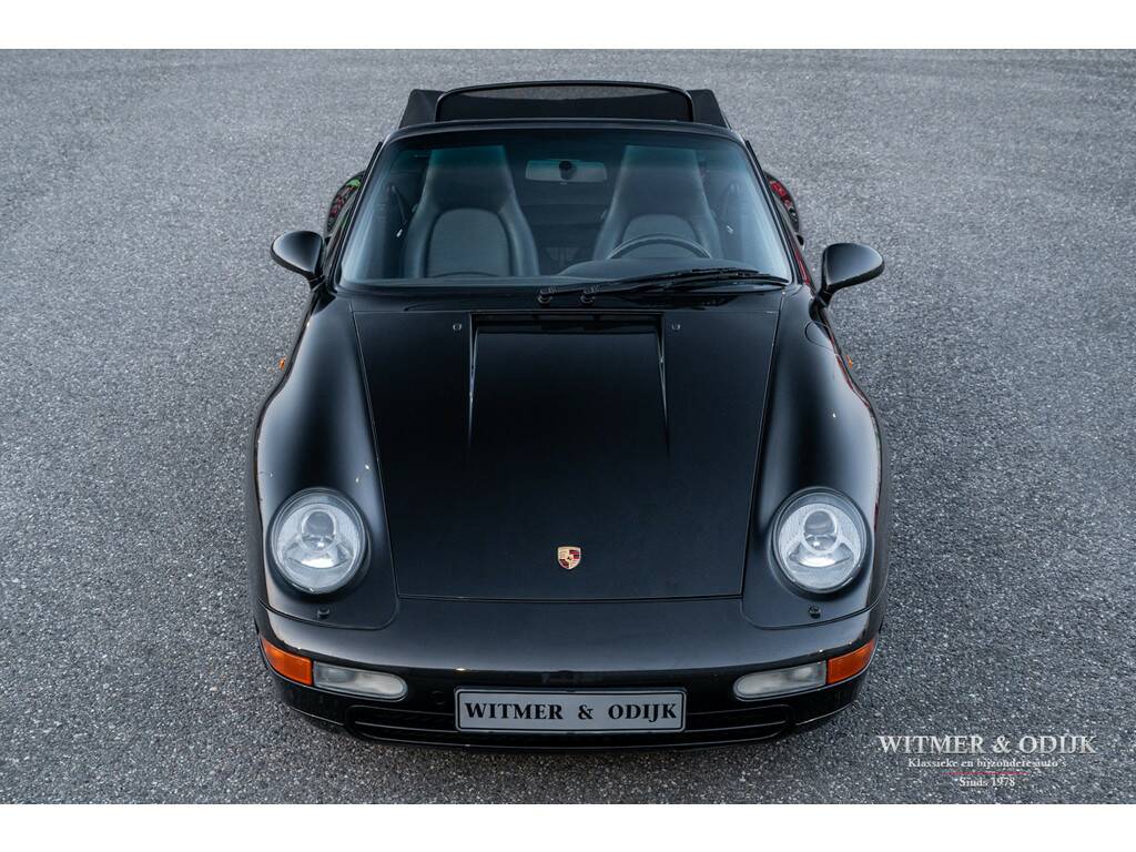 Porsche's perfectionering van de luchtgekoelde 911 is de in 1993 geintroduceerde 993. Van een ongeëvenaarde bouwkwaliteit, geweldige rijeigenschappen en dankzij de luchtgekoelde boxer een motorsound die de beleving optimaliseert. De Porsche liefhebber kent de positieve eigenschappen van de 993 maar al te goed en dat maakt dit type een zeer gezochte. Met name de zeldzame cabrioletversie heeft inmiddels een klassieker status die de waardeontwikkeling doet opstuwen. De rijeigenschappen zijn overigens zeker niet klassiek te noemen. Deze zeer precies sturende en van multilink wielophanging voorziene 911 laat zich controleren als een moderne auto die op rails lijkt te rijden. Met 285pk, dit is een exemplaar uit de tweede serie met de sterkere Varioram motor, op de achterwielen beleeft u sportief het mooiste van vrij autorijden. Genieten pur sang. Als de auto u dan als gevolg van goed onderhoud zorgeloos laat genieten en als nieuw rijdt is de pret dubbel zo groot. Dit zeldzaam mooie, complete en zorgvuldig gebruikte exemplaar is een investering met fun-factor. Er zijn slechts 17.900 cabriolet's van dit type gebouwd. In fraai strak en stijlvol Black Metallic met eveneens zwarte cabrioletkap en dito leer mag, gezien de bijzonder aantrekkelijke kilometerstand, met recht een bijzondere en zeldzame auto genoemd worden. En dat is dan weer goed voor de waardeontwikkeling. Leuker kan ik het niet maken. Compleet uitgevoerd; er zijn o.a. elektrische stoelverstelling links en rechts in hoogte verstelbaar, stoelverwarming, Tiptronic-S automatische versnelling met desgewenst stuurbediening, elektrisch cabriodak, originele Porsche CR11 radio/cassette, centrale deurvergrendeling met afstandsbediening, climat control, boordcomputer, 17 inch Porsche lichtmetalen velgen, windscherm, etc. In strak Black Metallic uitgevoerde carrosserie waarop geen krasje of zichtbare steenslag te bekennen is. Ook de bumpers zijn vrij van parkeerbeschadigingen. Goed doorzichtige achterruit in een cabrioletkap zonder beschadigingen. Deze 993 Cabriolet heeft een fraai originele uitstraling. Het betreft uiteraard een 993 die altijd schadevrij is gebleven. Het interieur verdient een bijzondere vermelding, een 993 is geen jonge auto en toch is het interieur vrij van zichtbare gebruikssporen. Dit is uiteraard afhankelijk van de wijze waarop deze auto werd gebruikt en de aantrekkelijk lage kilometerstand. Mooi soepel en sterk leer op de stoelen, er is ook geen slijtage aan de instapzijde van de linkerstoel. Alles mooi schoon en onbeschadigd. Vloerbekleding mooi schoon. Het met leer beklede stuur is mooi glad. Nooit in gerookt. Deze van oorsprong Belgische 993 Cabriolet kwam al in 2001 naar Nederland. Bij de auto aanwezig is een uitgebreid dossier waarvan zelfs de originele aankoopfactuur uit 1996 nog onderdeel uitmaakt. De onderhoudshistorie is dan ook volledig en keurig afgestempeld door de Porsche dealer en -specialist. Het eigenaren verleden is compleet, werkelijk het gehele leven van de auto is navolgbaar. De techniek is up-to-date, keurig uitgevoerd de laatste jaren door een bij ons bekende Porsche specialist. Wij leveren deze Porsche af inclusief nieuwe APK, garantie en onderhoudsbeurt.