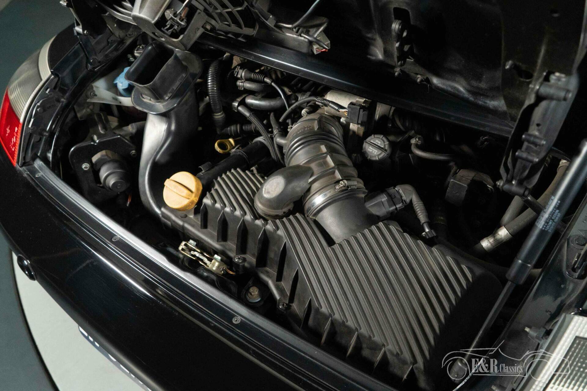 This Porsche is finished in stylish Triple Black: black paintwork, a black leather interior, and a recently replaced black soft top. The deep black bodywork blends beautifully with the alloy wheels and the wide, muscular lines of the 911. With the push of a button, you can open the power roof and enjoy open-top driving pleasure. The black leather interior exudes sportiness and luxury, with comfortable seats, climate control, a trip computer with navigation, and power windows and mirrors. Ease of use is also a priority, thanks to rear parking sensors, which make maneuvering easy. The interplay between the dark exterior and the stylish interior makes this 911 a timeless and highly desirable convertible.
