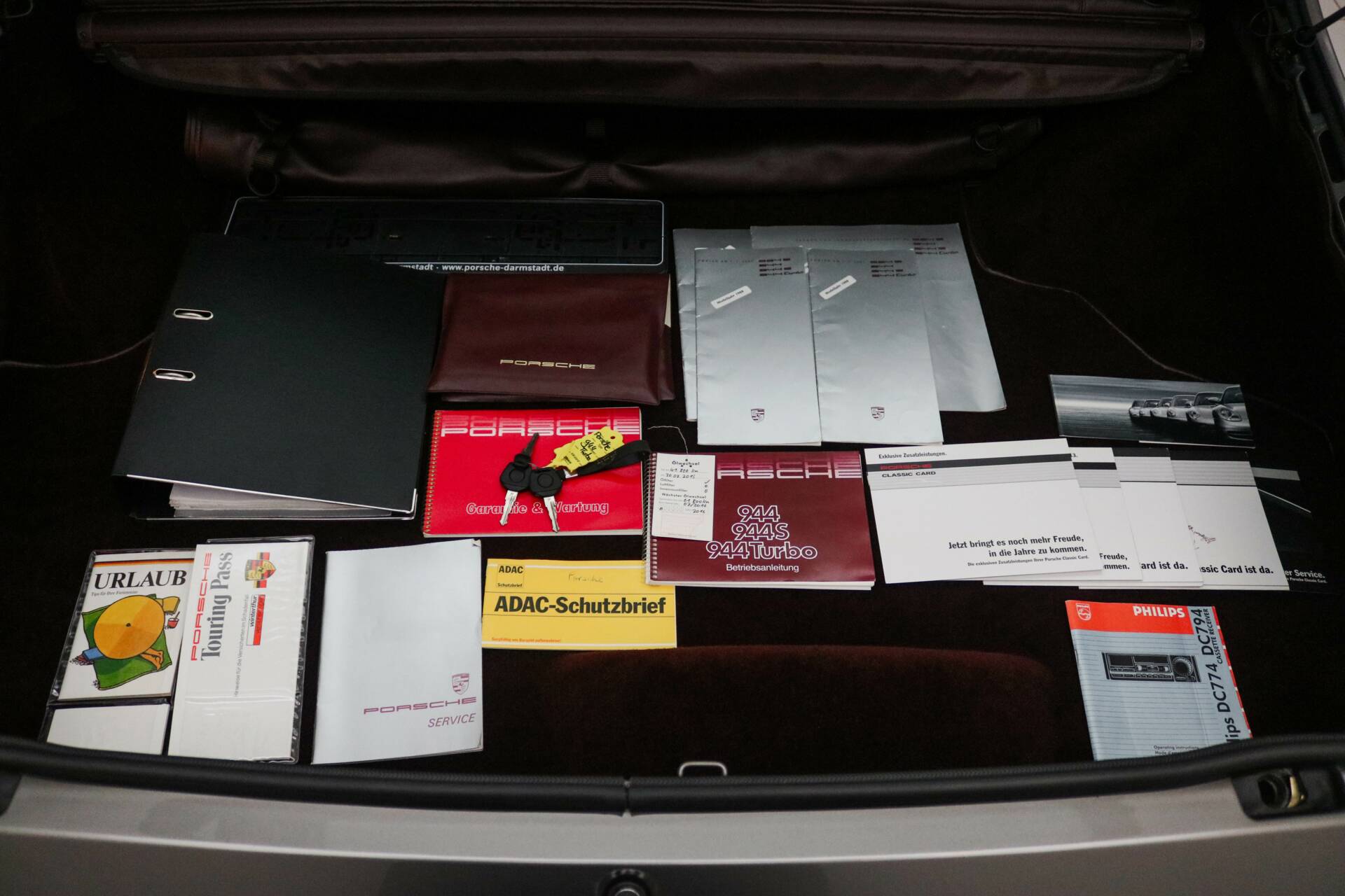 Ein einzigartiger Porsche 944 Turbo Coupé in Topzustand, neu ausgeliefert 1988 von Porsche Wiest in Darmstadt und vom ersten Eigentümer aus Heppenheim stammend. Das Fahrzeug wurde vollständig bei Porsche-Händlern gewartet und ist mit kompletter Dokumentation ausgestattet: alle Schlüssel, das originale Lederetui mit Wartungs- und Bedienungsanleitungen sowie ein zusätzlicher Ordner voller Service-Rechnungen. Die originale Neuwagenrechnung sowie originale Broschüren aus dem Jahr 1988 sind vorhanden.