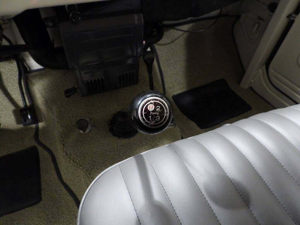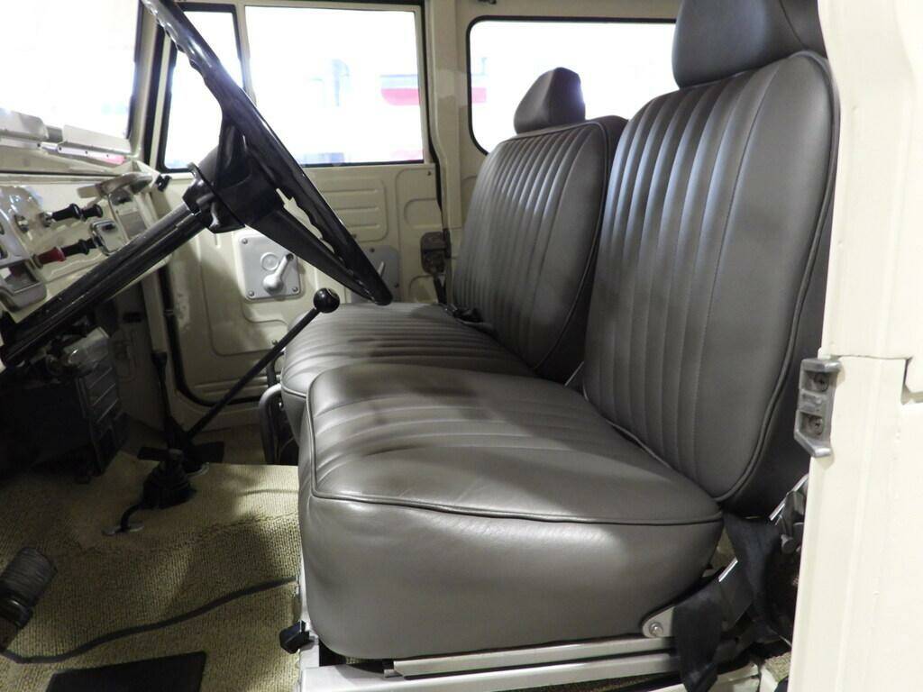 Gray sky blue seats and panels with driver and passenger front headrests, rear seat side benches, beige loop pile carpeting, original period three-spoke steering wheel, towbar, rear spare wheel, rear step board, chrome exterior mirrors, front winch, 3-speed transmission with low gear, additional spotlights on the front fenders