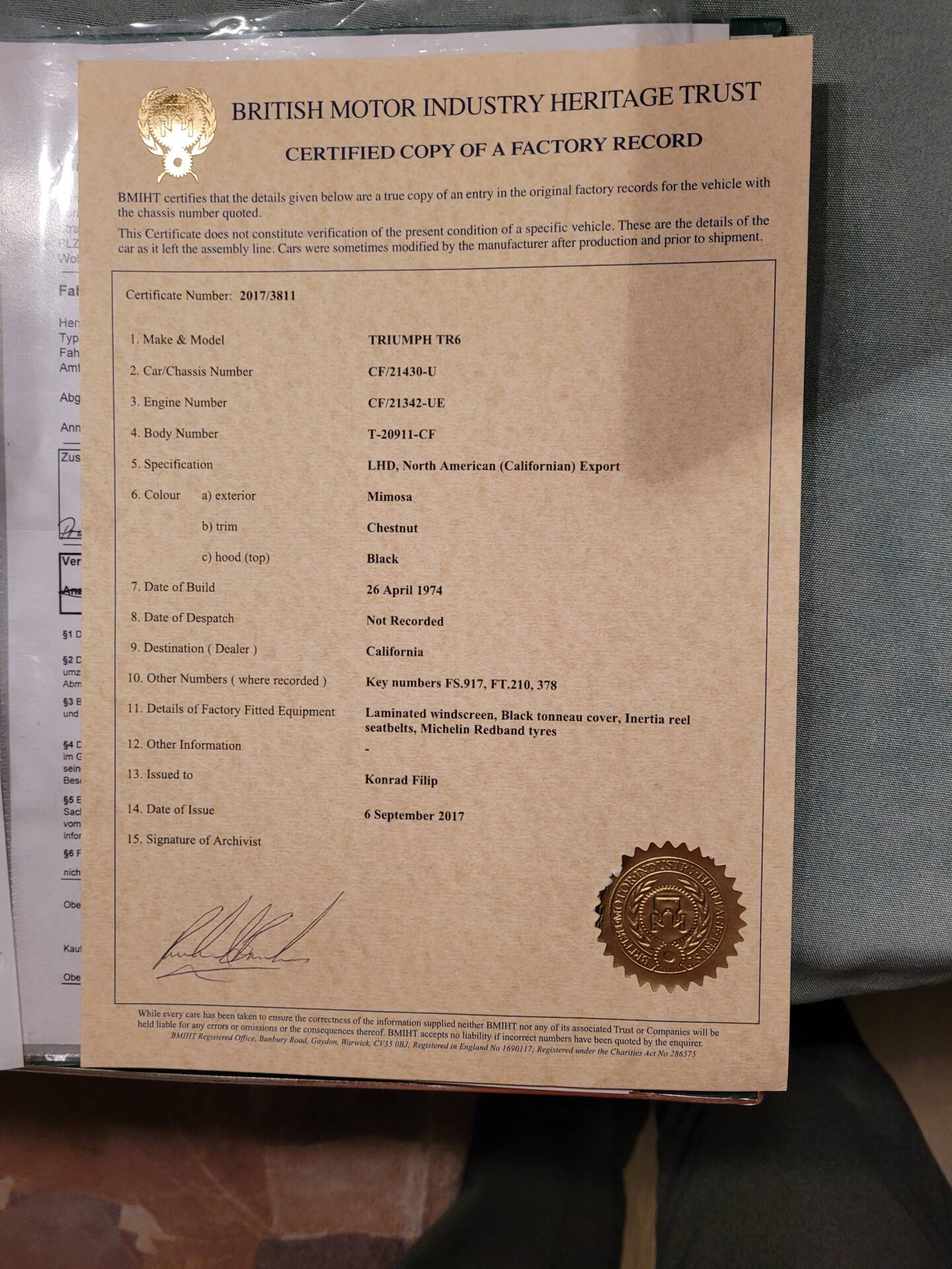 Zusammenfassung / Fazit Dieser Triumph TR6 vereint das klassische britische Roadster-Feeling mit den Vorteilen eines kalifornischen Imports: rostfreie Karosserie, gepflegtes Erscheinungsbild und eine technisch relevante Motorüberholung. Für Sammler und Fahrer, die einen TR6 mit authentischem Charakter und schöner Farbgebung suchen, stellt dieses Exemplar eine interessante Option dar – insbesondere vor dem Hintergrund der stetig wachsenden Nachfrage nach klassischen, unverfälschten Sechszylinder-Cabrios. Mit BMIHT-Urkunde und sportiver Individualisierung empfiehlt sich dieser TR6 sowohl als Wertanlage als auch als Genussobjekt für kurvige Landstraßen.