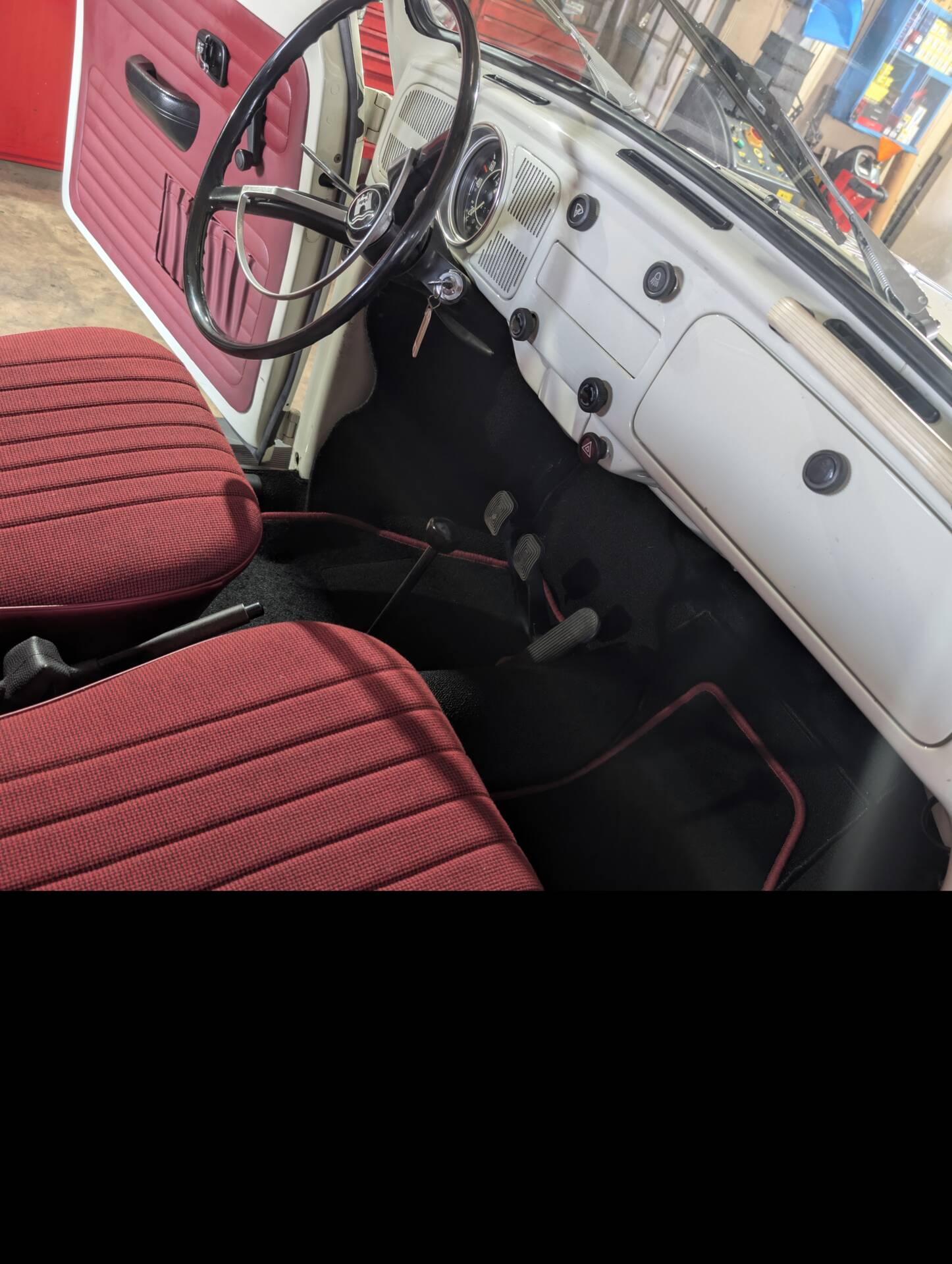 • Sitze: Originaler Stoffbezug in markantem Rot.