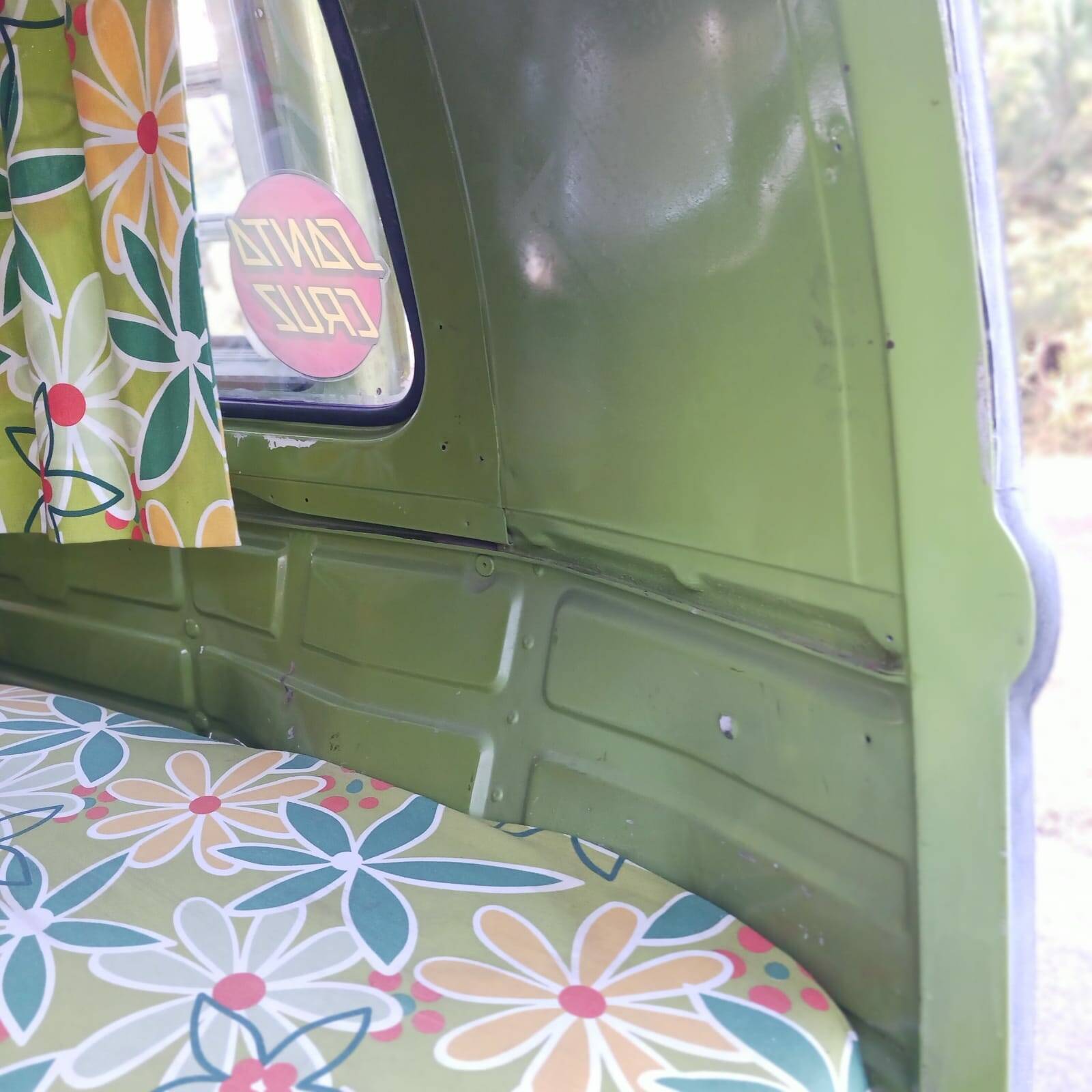 El interior la tapicería y los muebles son originales muy bien conservados, así como la parte superior elevable, cama, lona y accesorios.