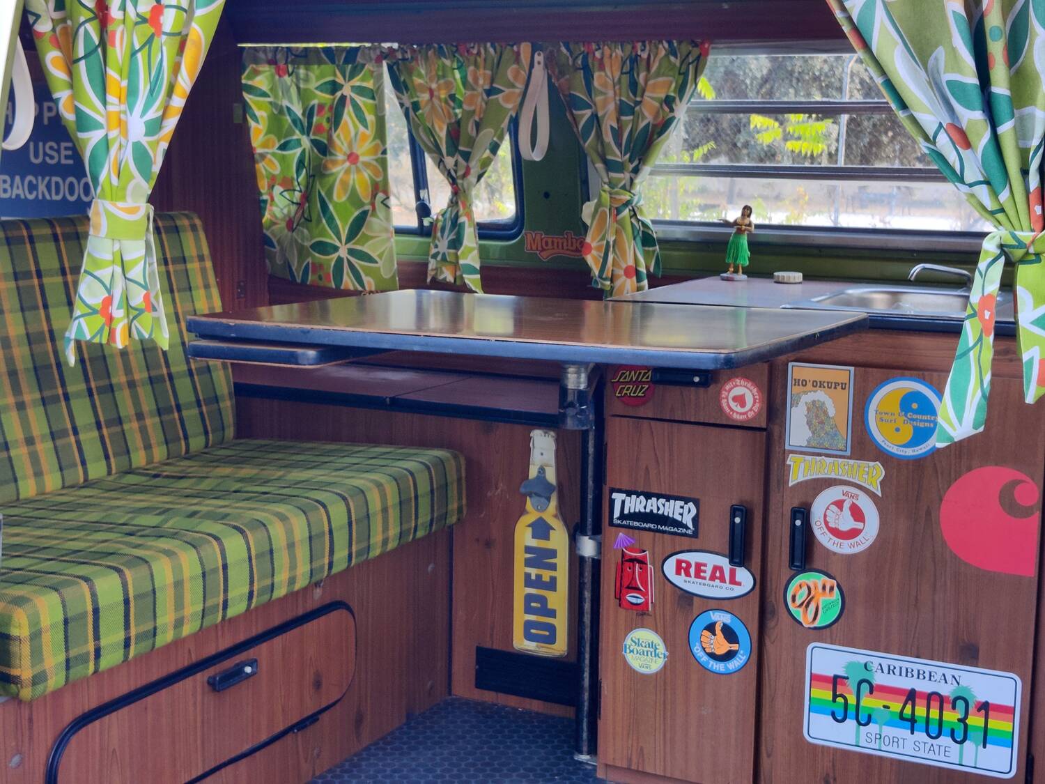 The interior upholstery and furniture are original and very well preserved, as are the pop-top roof, bed, canvas, and accessories.