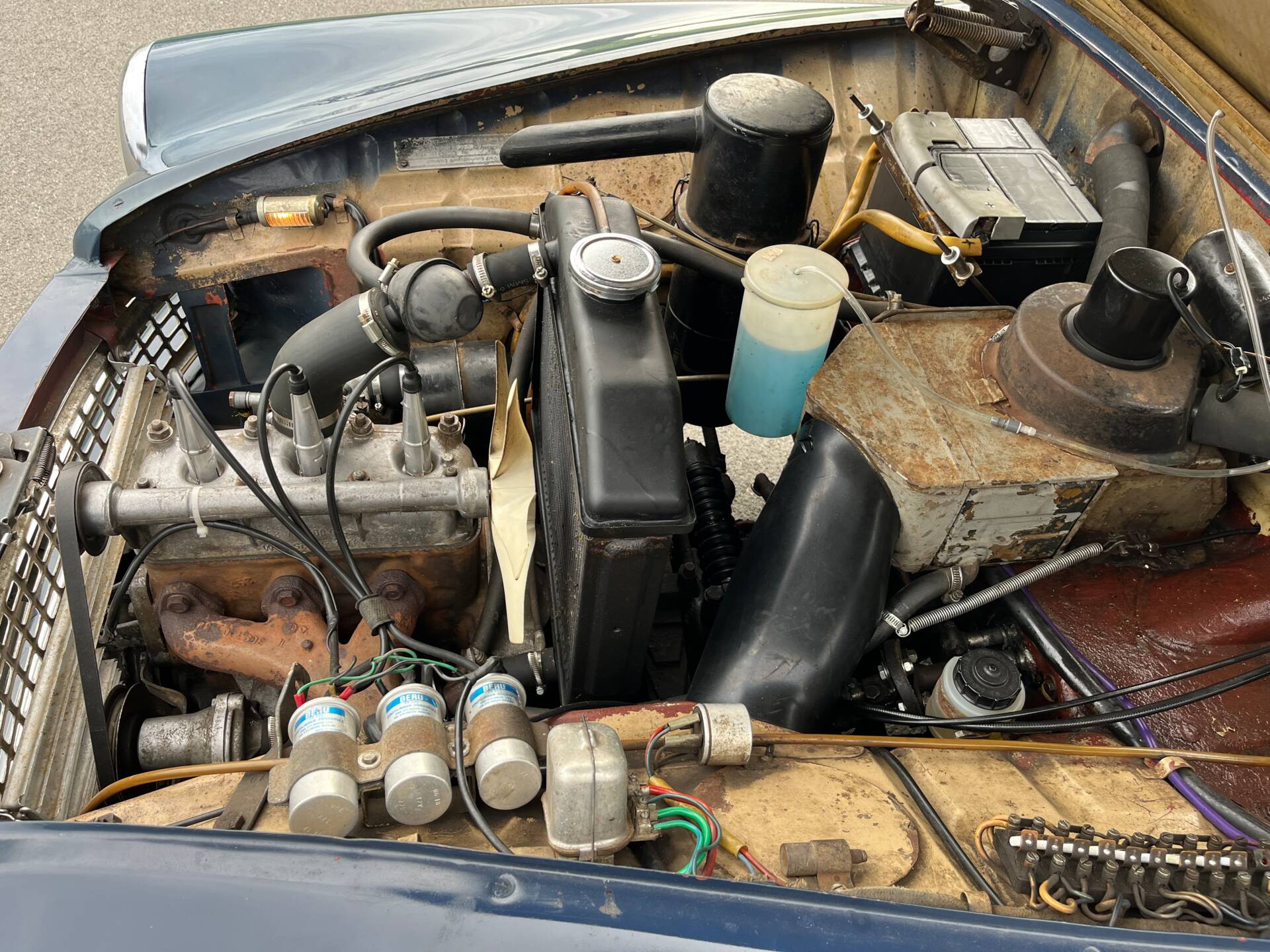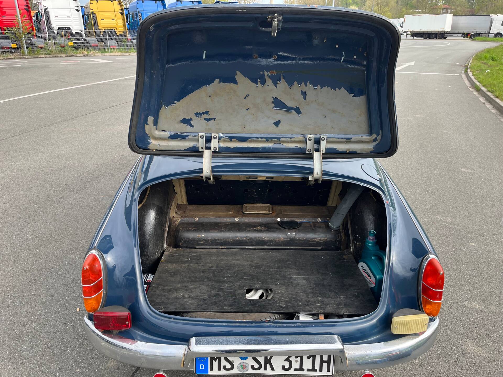 Das Fahrzeug fährt, hat TÜV und sieht auf den ersten Blick gut aus. Einige Lackstellen und die Sitzpolster sind überarbeitungsbedürftig. Technisch sind in jüngster Vergangenheit zahlreiche Dinge überarbeitet und repariert worden.