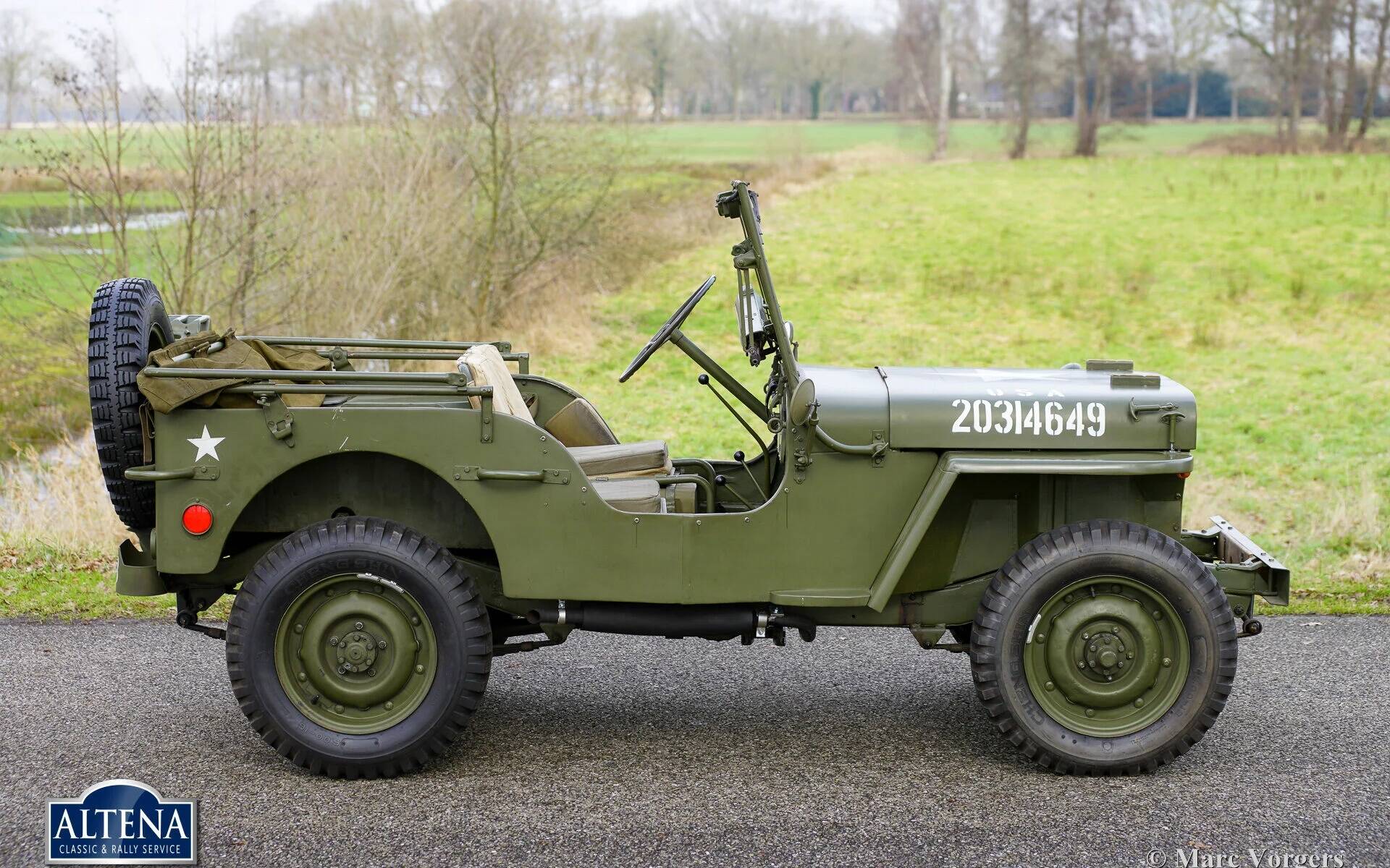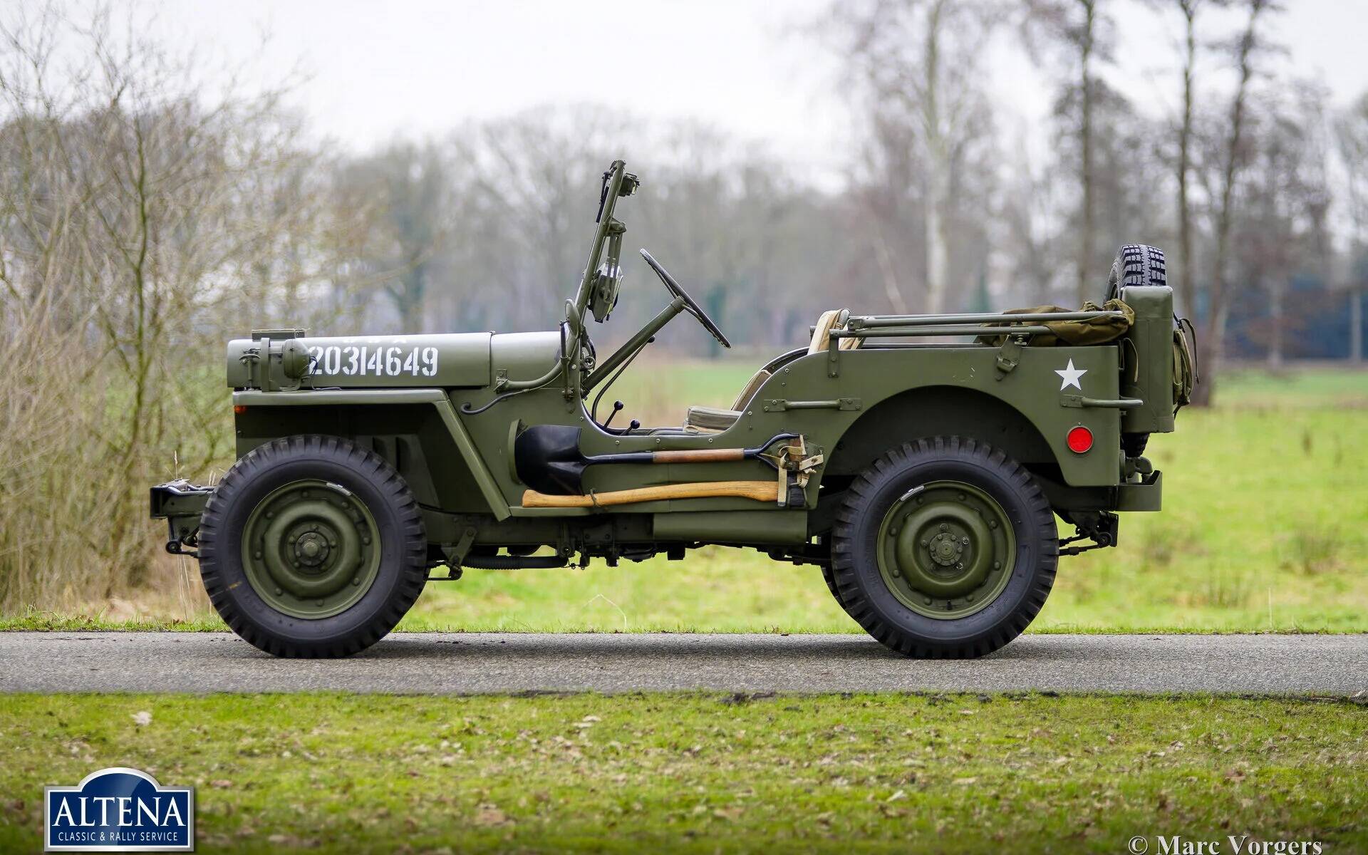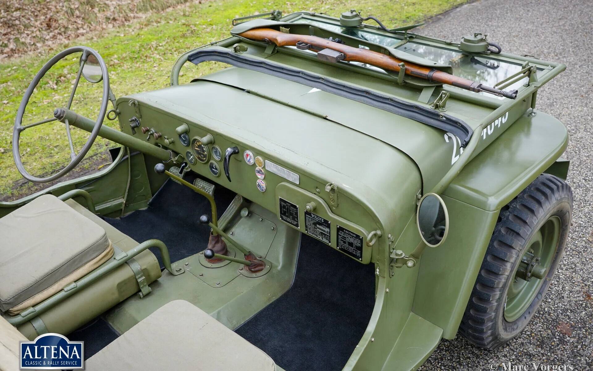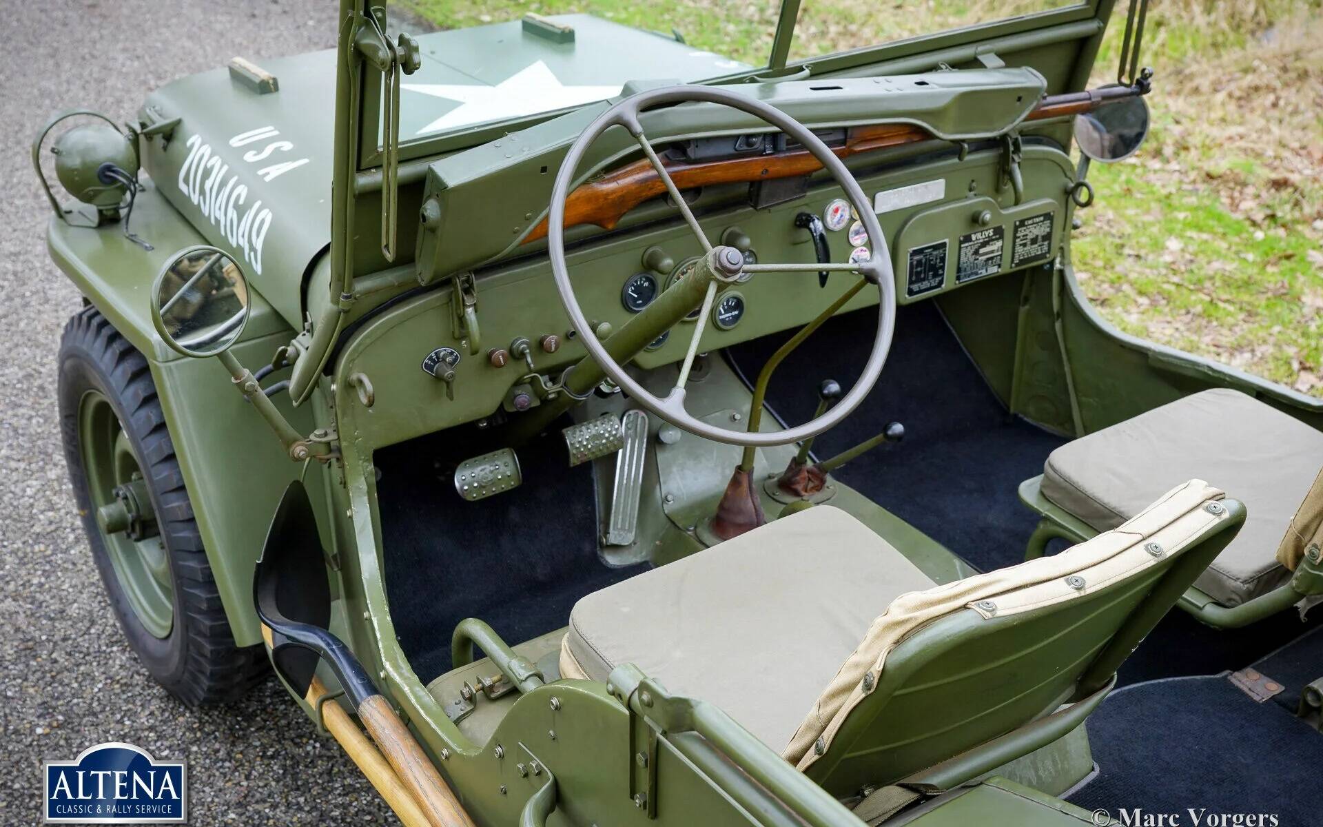 Willys MB Jeep, built in 1944. Color: army green combined with light green/beige canvas seats and loose black carpet. This Willys MB Jeep is an original 1944 example in very good and complete condition! The car has fantastic details (including a rifle in the correct place) and drives excellently! This Willys Jeep was imported from California to Germany in 2002. The car was thoroughly restored in Germany. Last year, the Jeep was fully updated by Altena Classic Service. The cost of this extensive service was €7.500. The car comes with the correct paperwork for registration. A very well-maintained example!