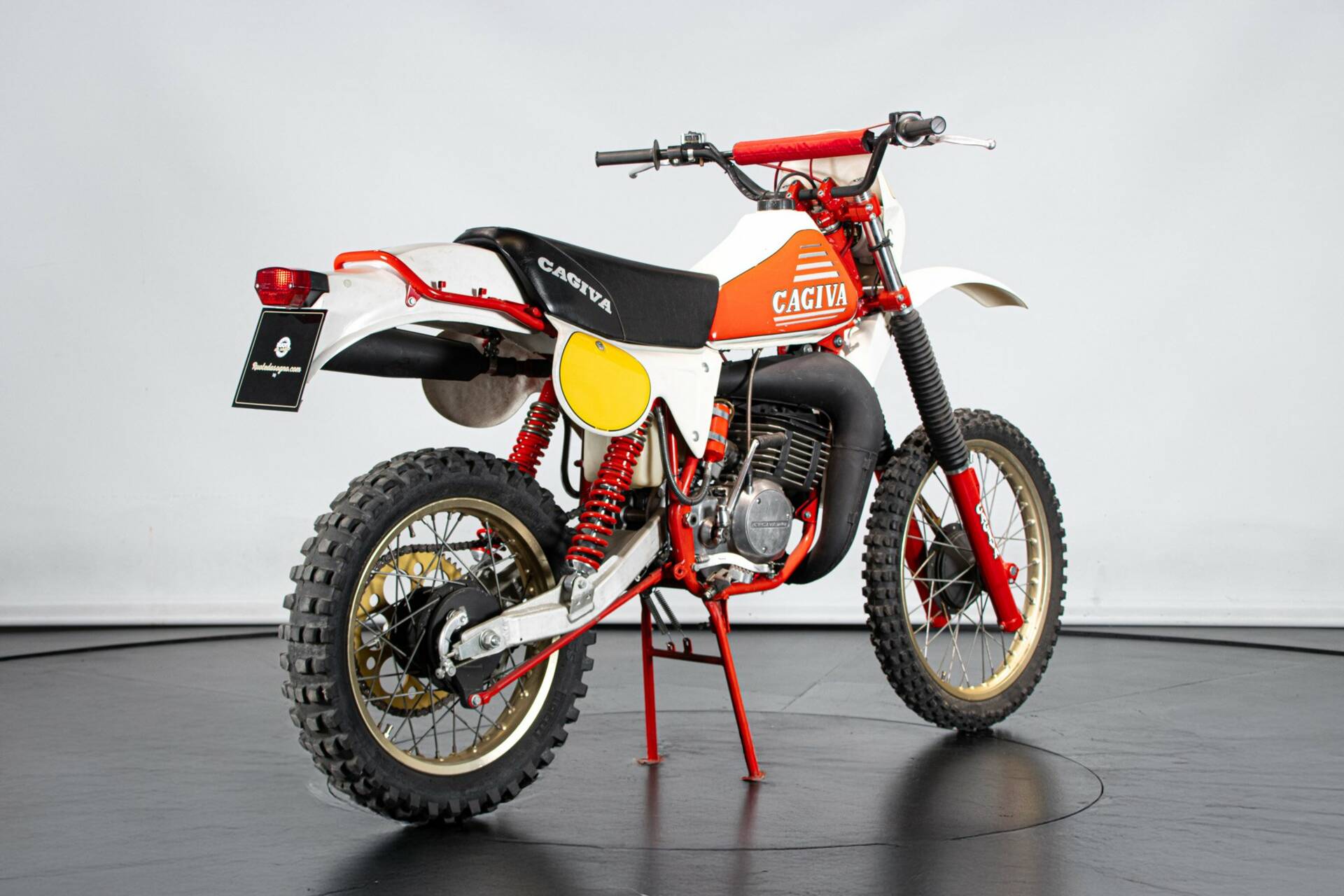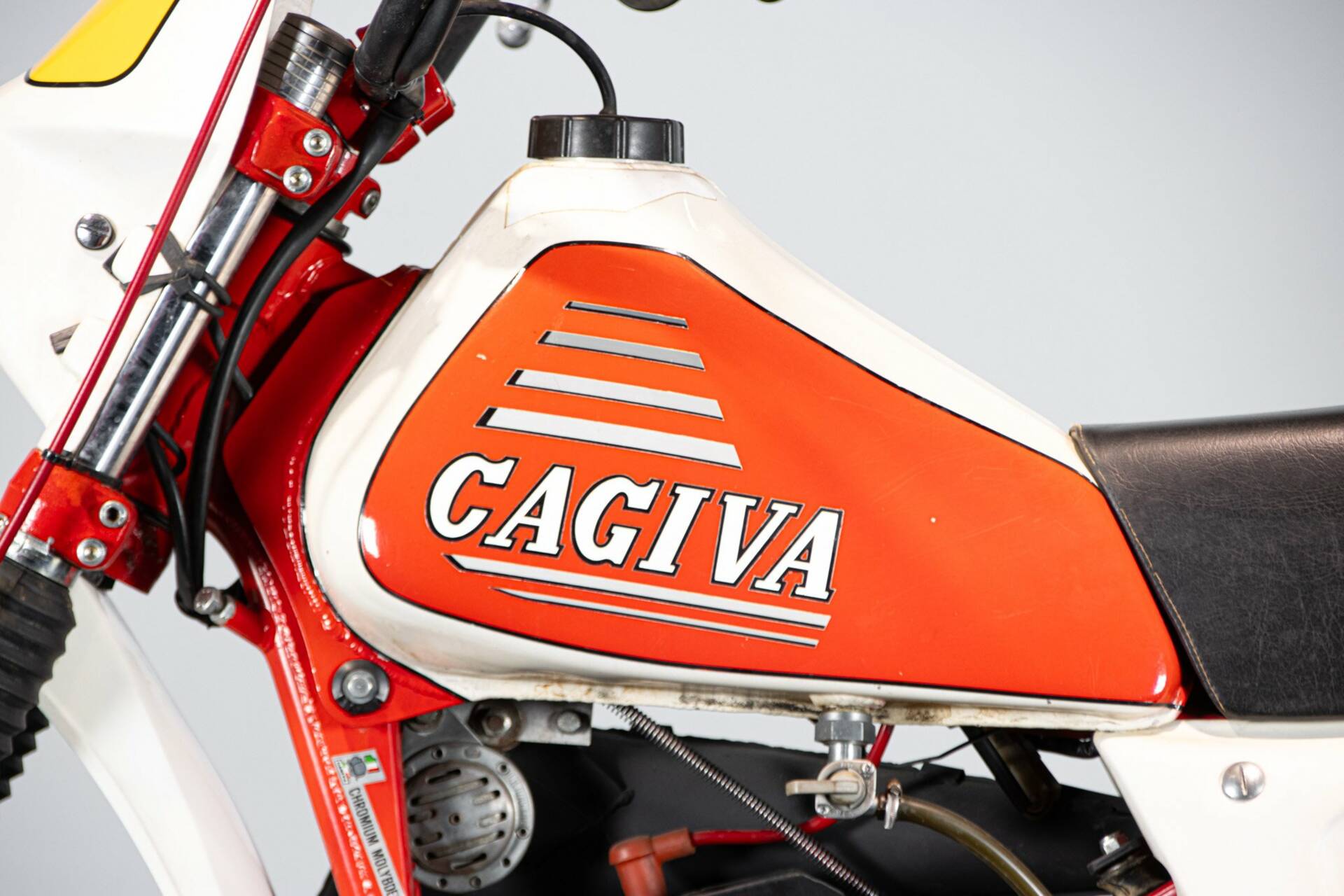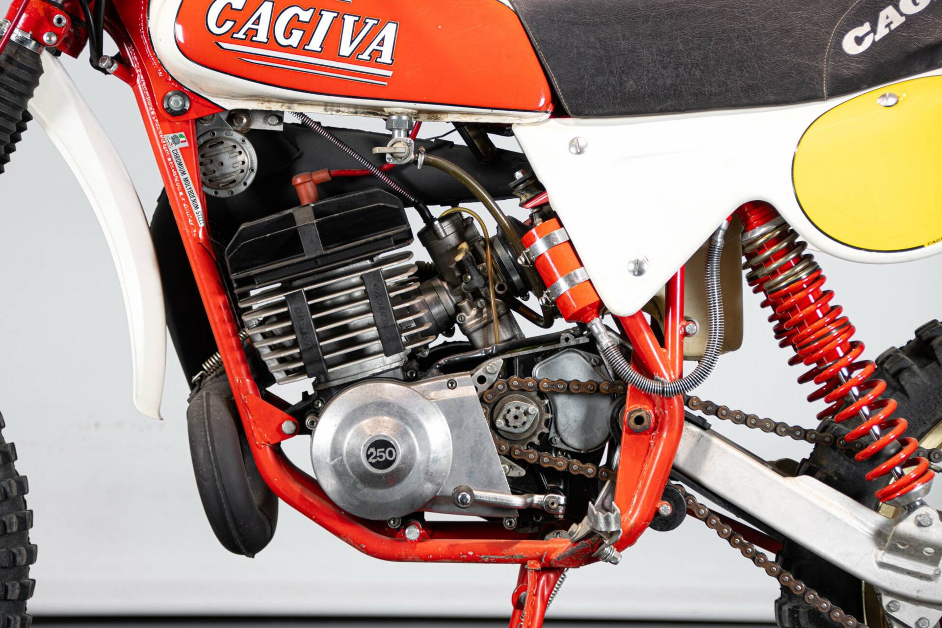 Presentata nel 1977 al salone di Milano, questo monocilindrico due tempi da 35 CV, originariamente in seno alla Harley davidson Aermacchi, viene ripreso dalla nuova gestione Cagiva (Castiglioni Giovanni Varese). Il progetto viene ripreso ed aggiornato in ogni aspetto. Linea moderna, componentistica di alto livello (Magura, Akront, Grimeca, Marzocchi, Sachs-ammortizzatori). La novità, rispetto al progetto originale, è il motore: monocilindrico, corsa corta, cambio ad innesti frontali: 32 CA a 8.000 giri. Ai tempi della presentazione era disponibile un kit fatto da cilindro, carburatore e scarico, capace di incrementare la potenza oltre i 36CV. Esemplare restaurato e da ammirare.