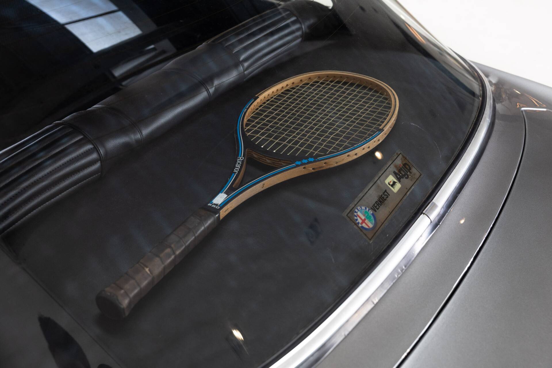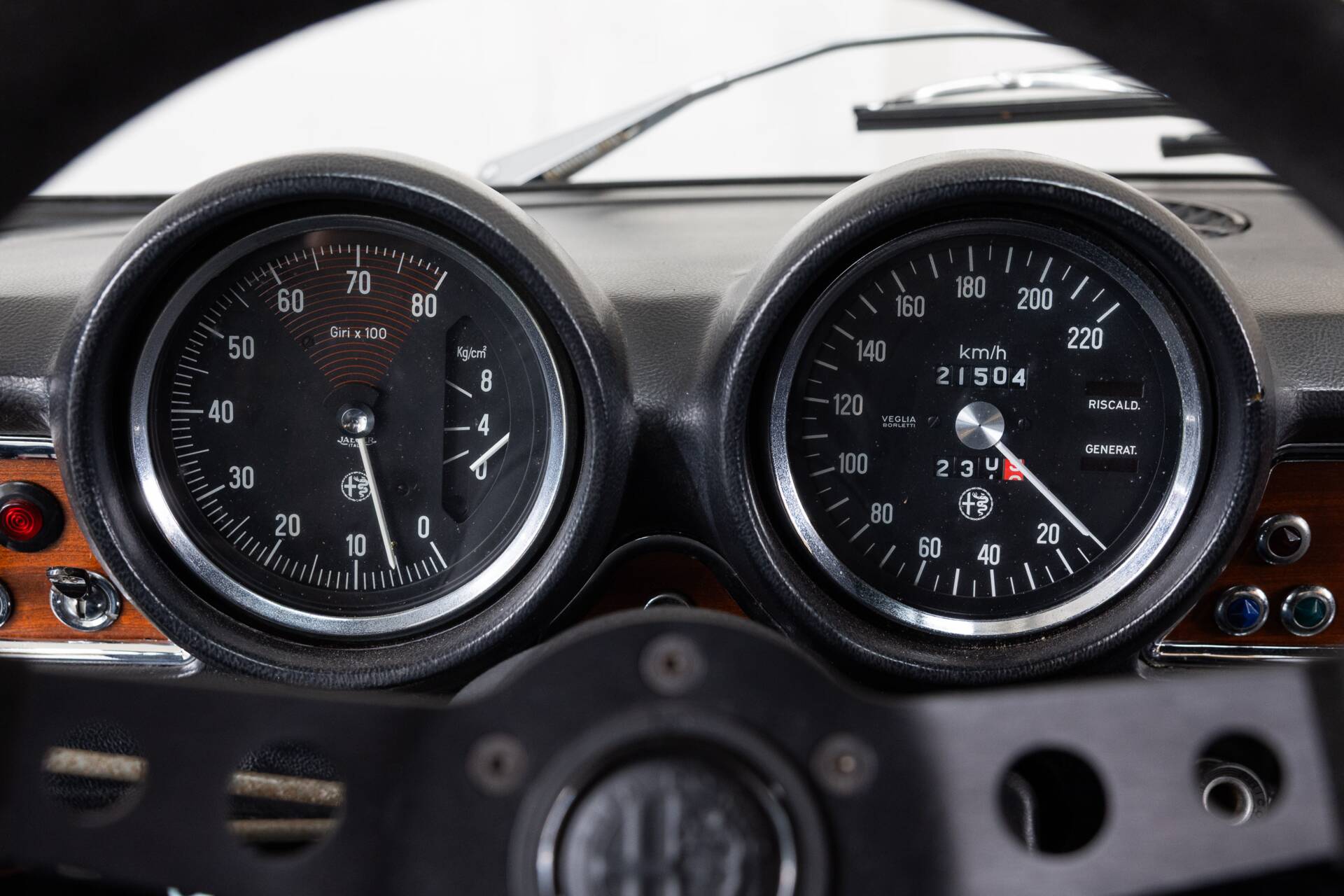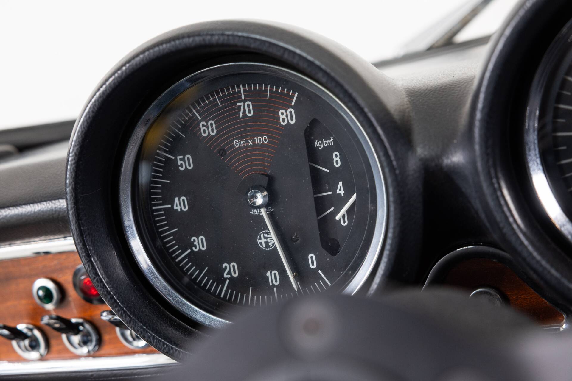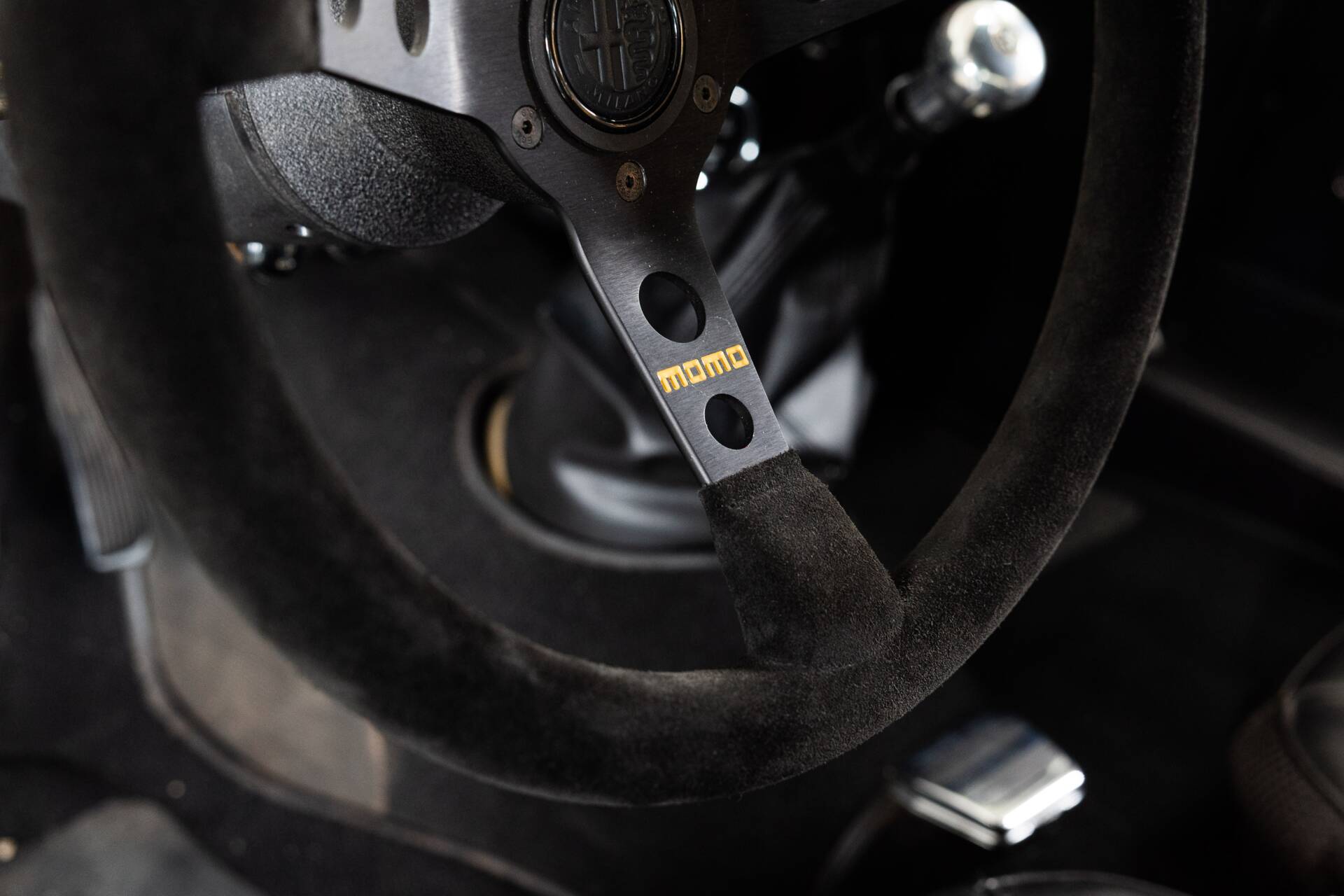 The previous owner also focused on improving the driving experience with carefully chosen upgrades. A Momo MOD.07 steering wheel in black suede, mounted on a vintage race hub with a custom Alfa Romeo horn button, gives the cockpit a purposeful feel. The gear lever has been replaced with a solid aluminium Alfaholics shifter, widely considered one of the best upgrades available for classic Alfa Romeos. Importantly, the original steering wheel and gear lever are still present with the car.