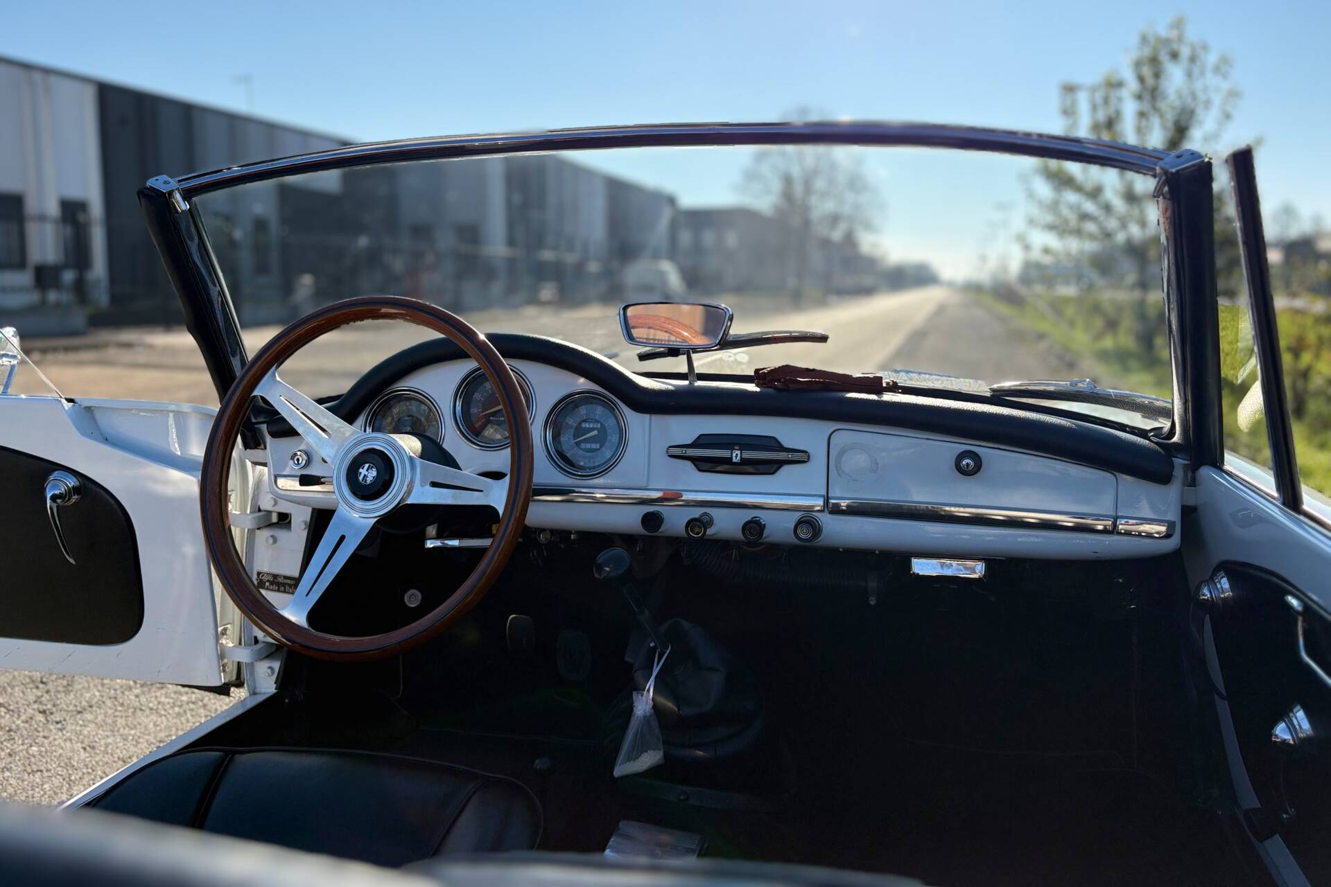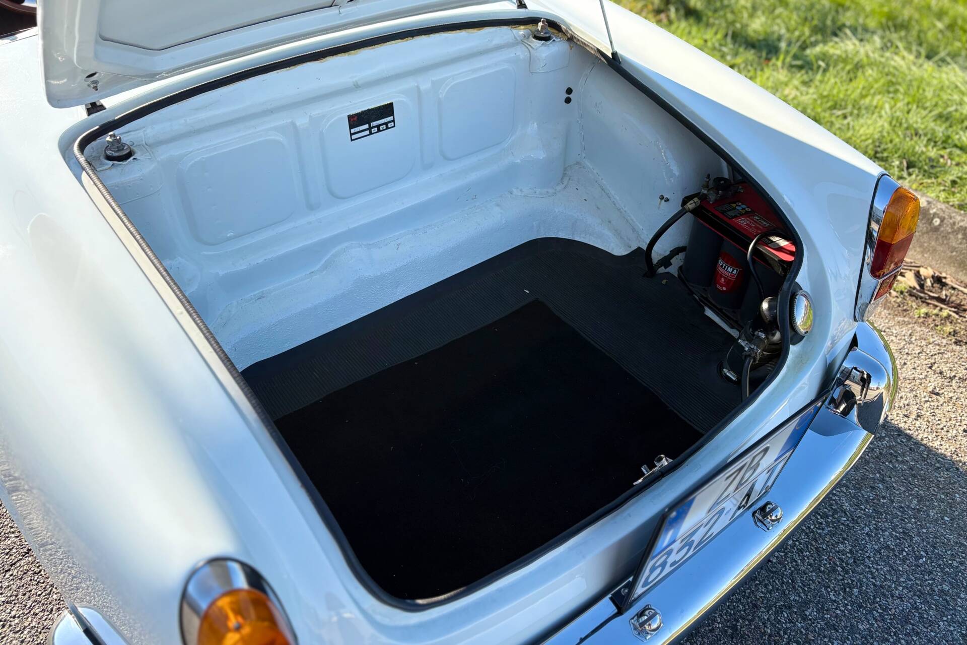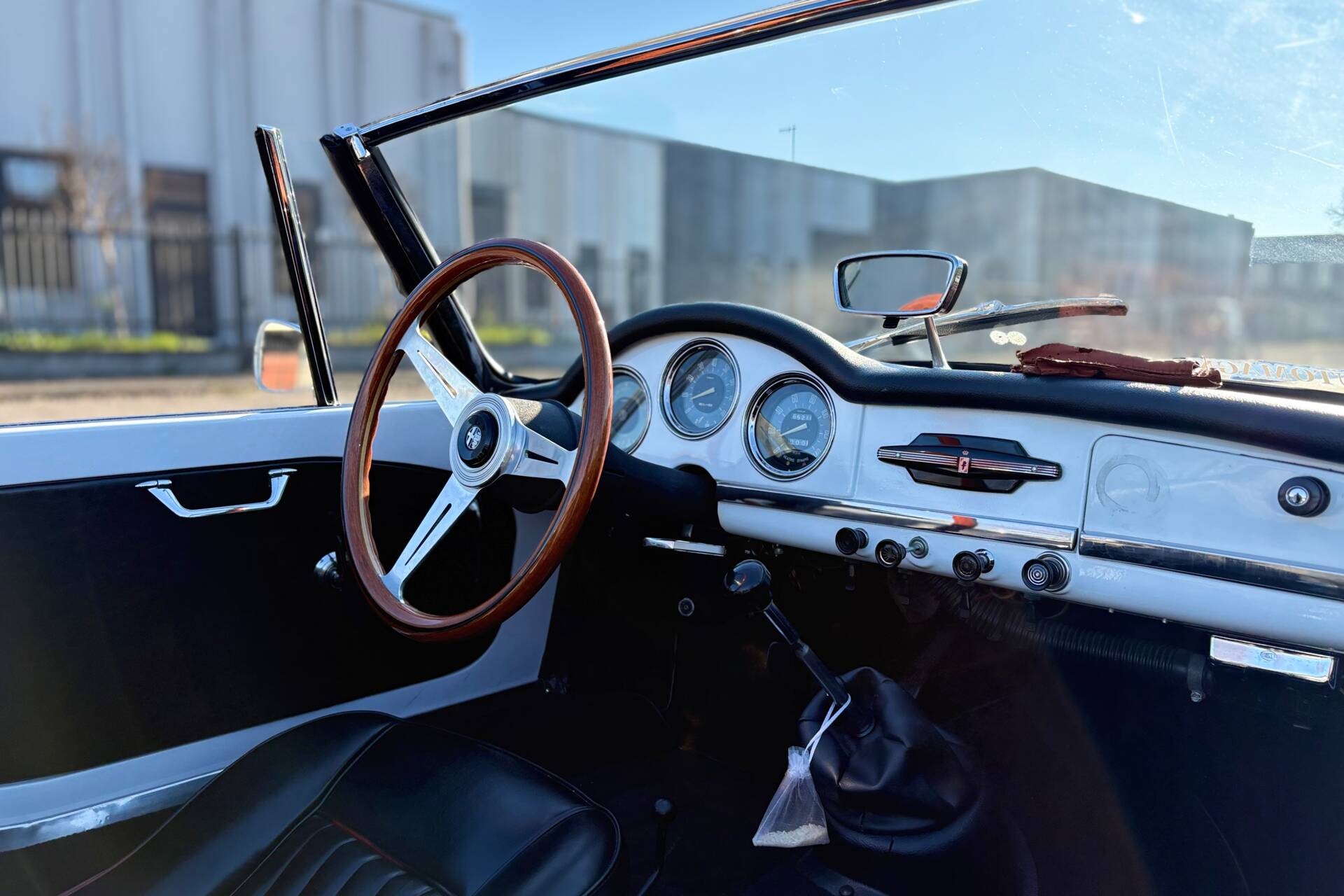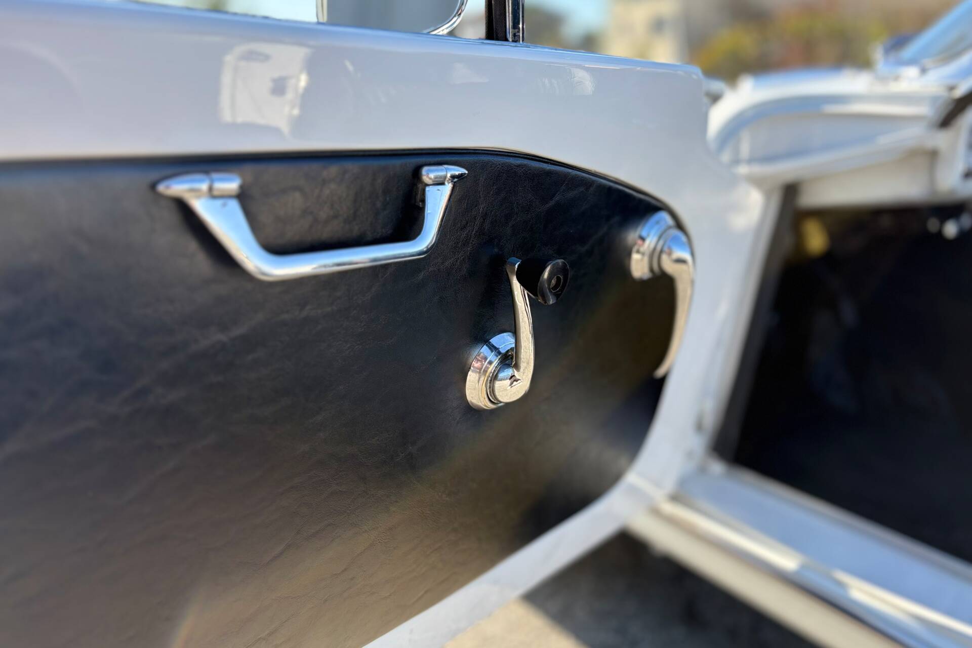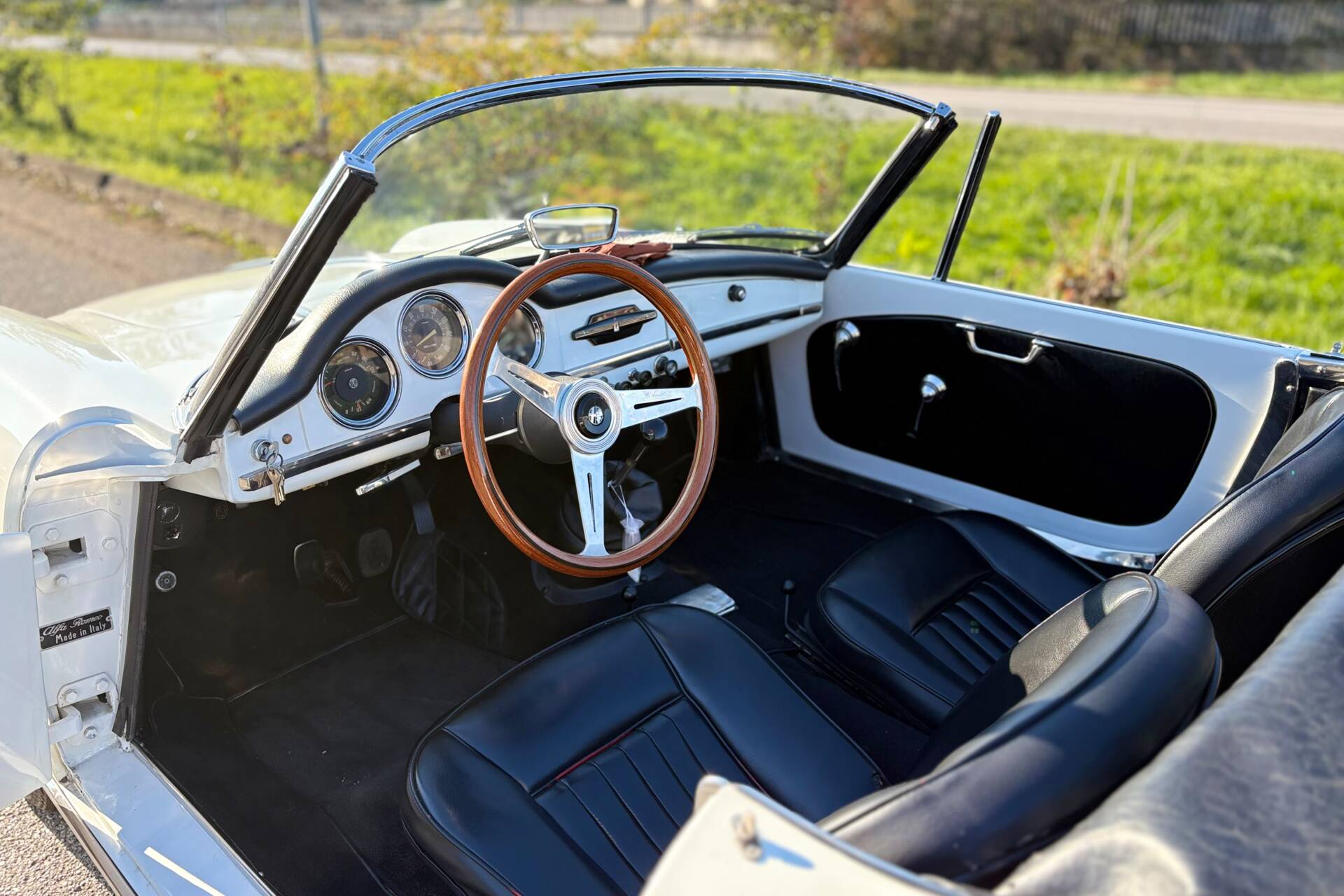 La combinazione della carrozzeria bianca con interni neri esalta l’eleganza della vettura, rendendola particolarmente affascinante per gli appassionati di auto d’epoca.
