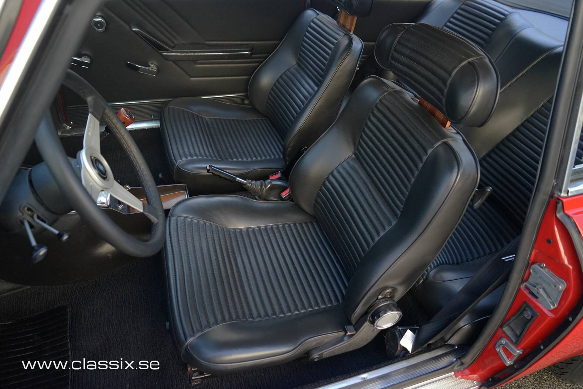 Interior: The cabin of this Alfa Romeo 2000 GT Veloce has been beautifully re-trimmed in black leather. Both front and rear seats have been redone in high-quality material that feels soft and supple while retaining their correct shape and comfort. The door panels are new, the headliner is fresh, and all interior details are neat and functional. A Nardi wooden steering wheel has been fitted, a tasteful and period-appropriate upgrade that suits the car’s Italian character perfectly. The driving position is comfortable and the overall feel is that of a well-sorted classic that’s ready to be enjoyed.